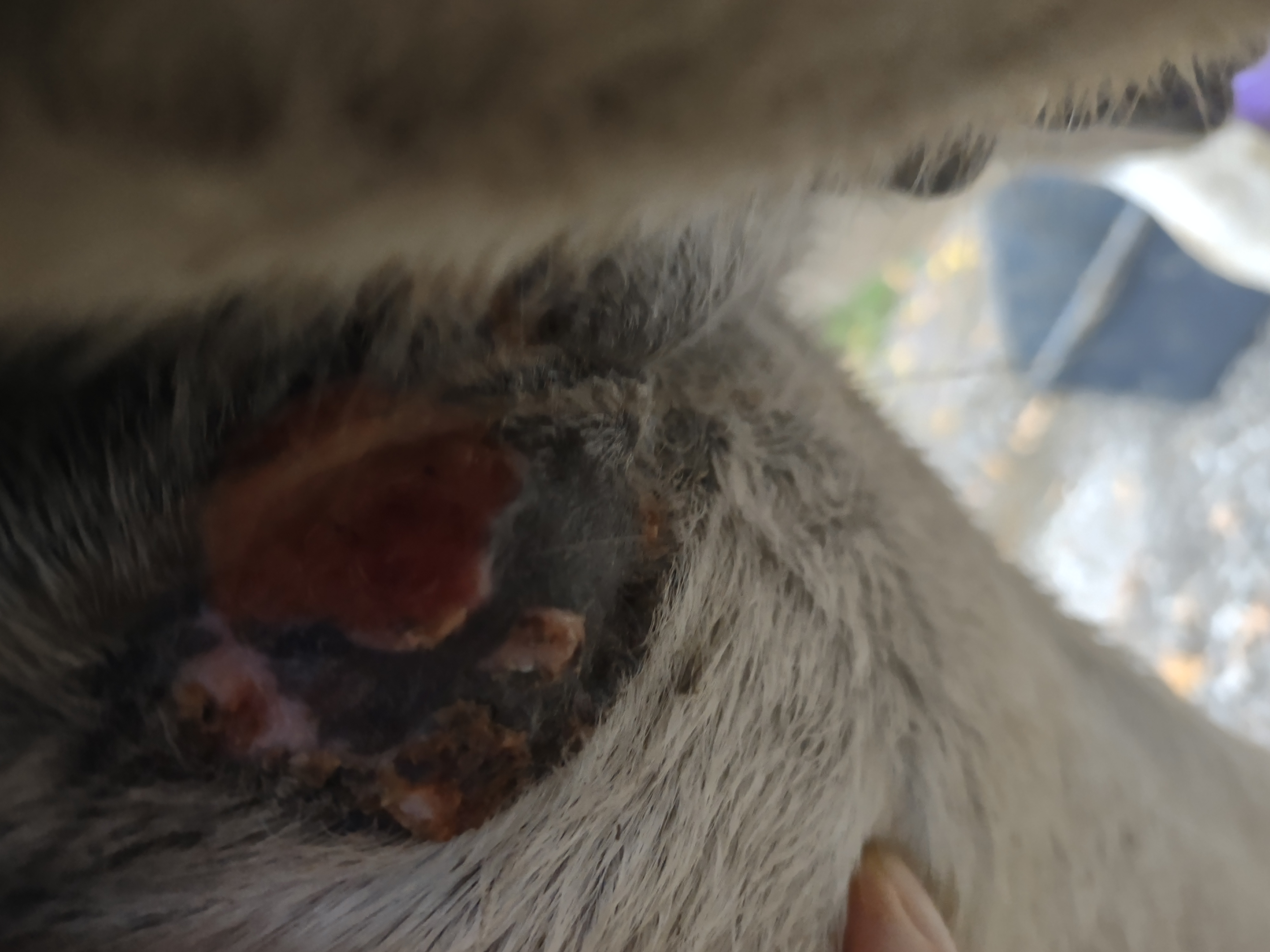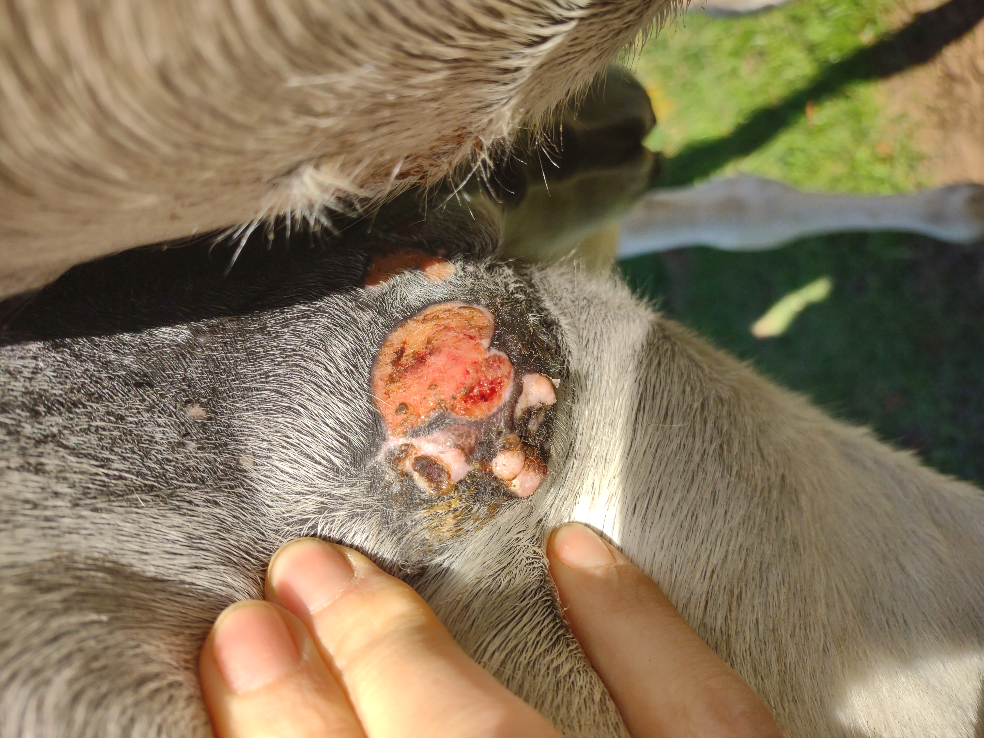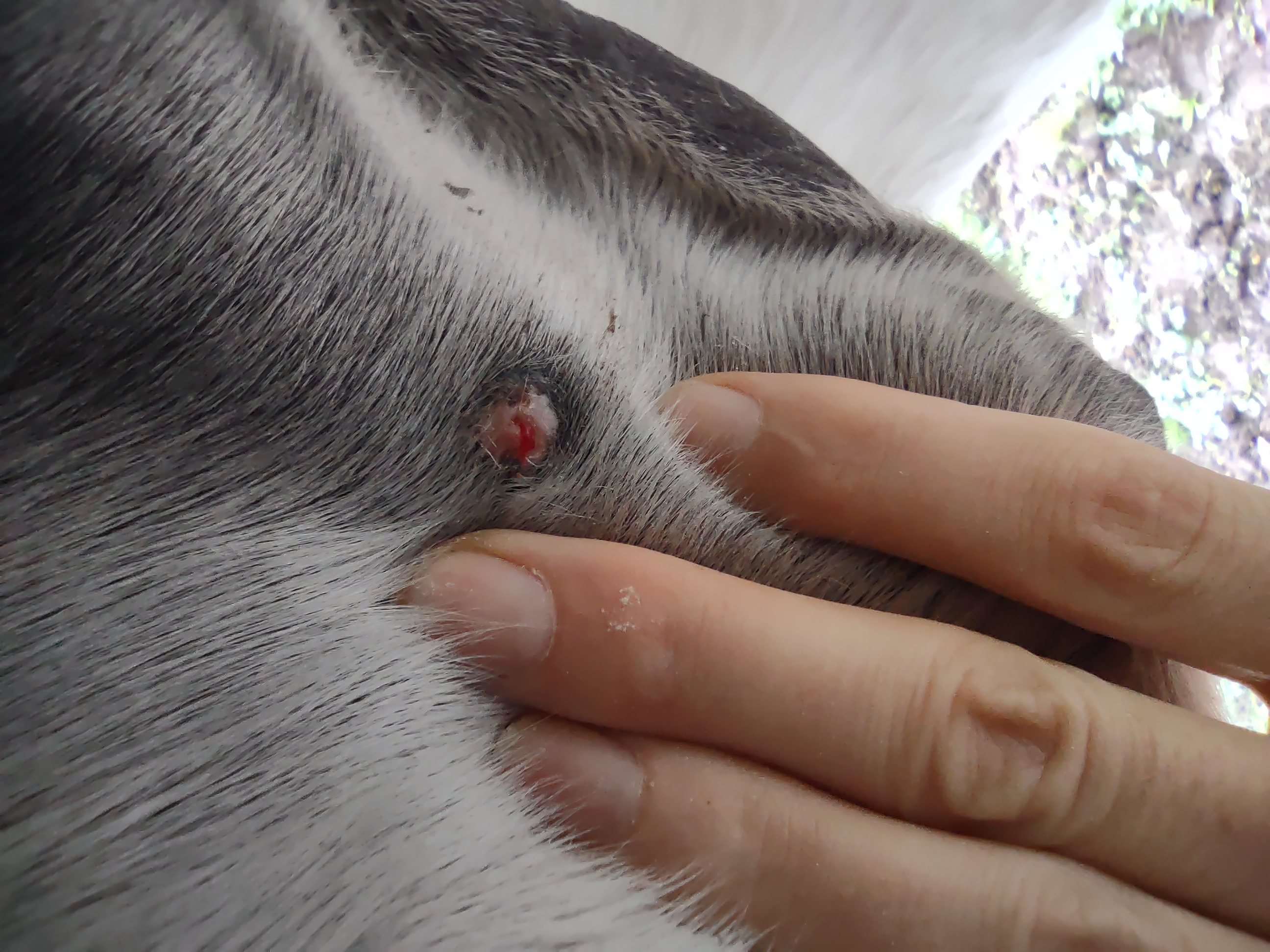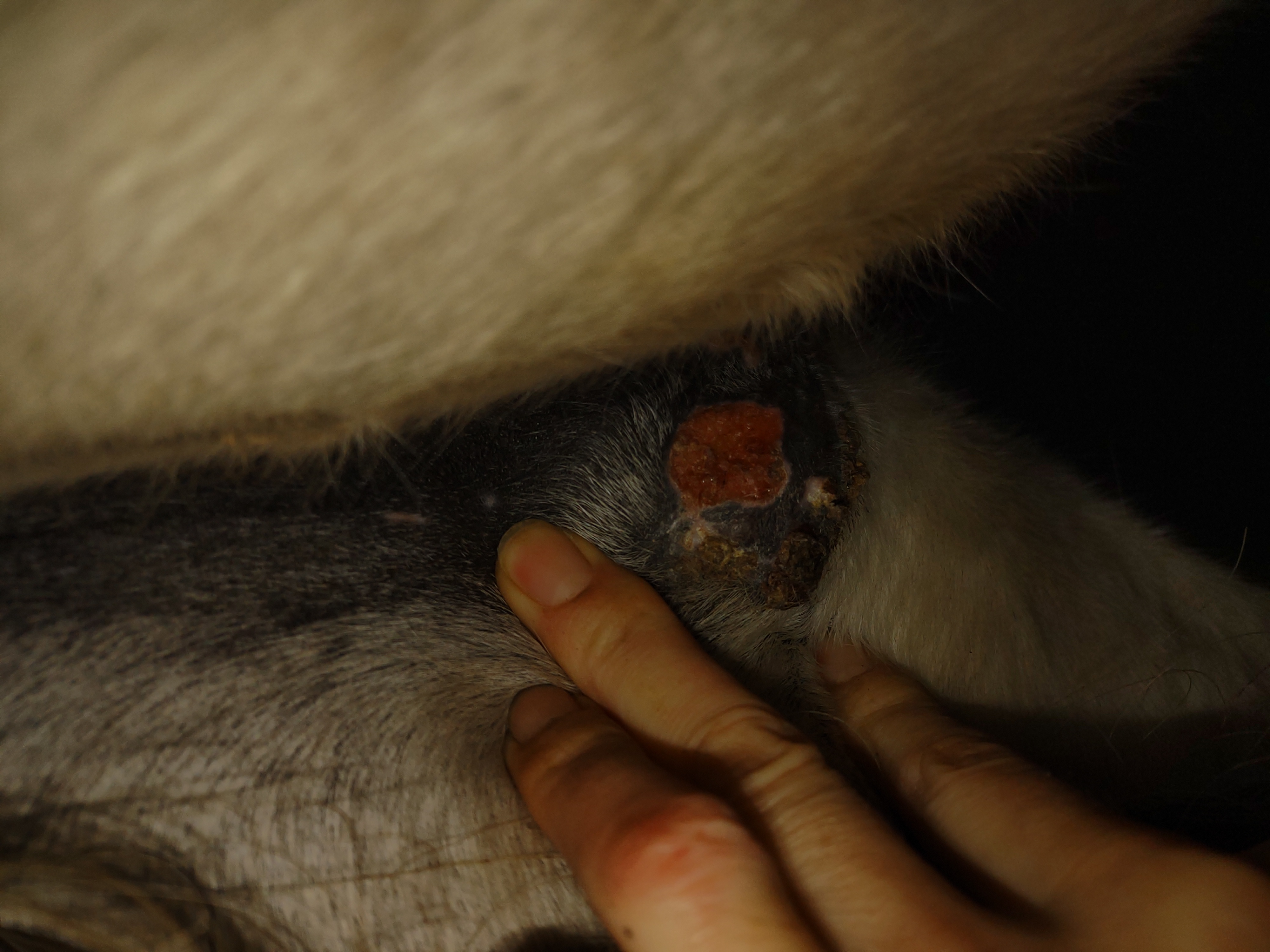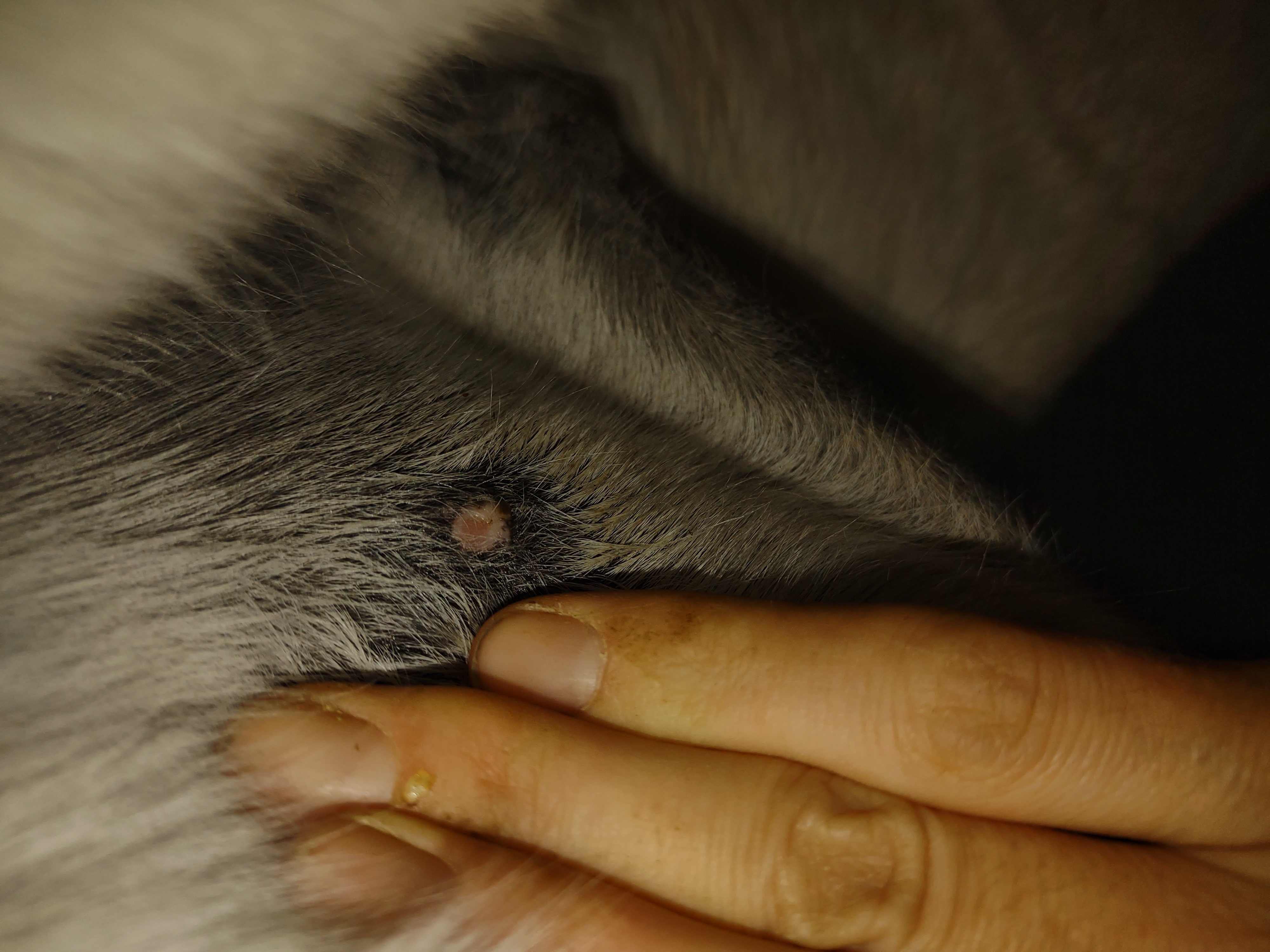 Montag und Mittwoch nur mit dem Salbenrest kurz getupft. Es hat tatsächlich noch mal geleistet ganz in der Mitte, eines knubbelig war. Leider war das Foto heute schwer mit Fell und Licht.