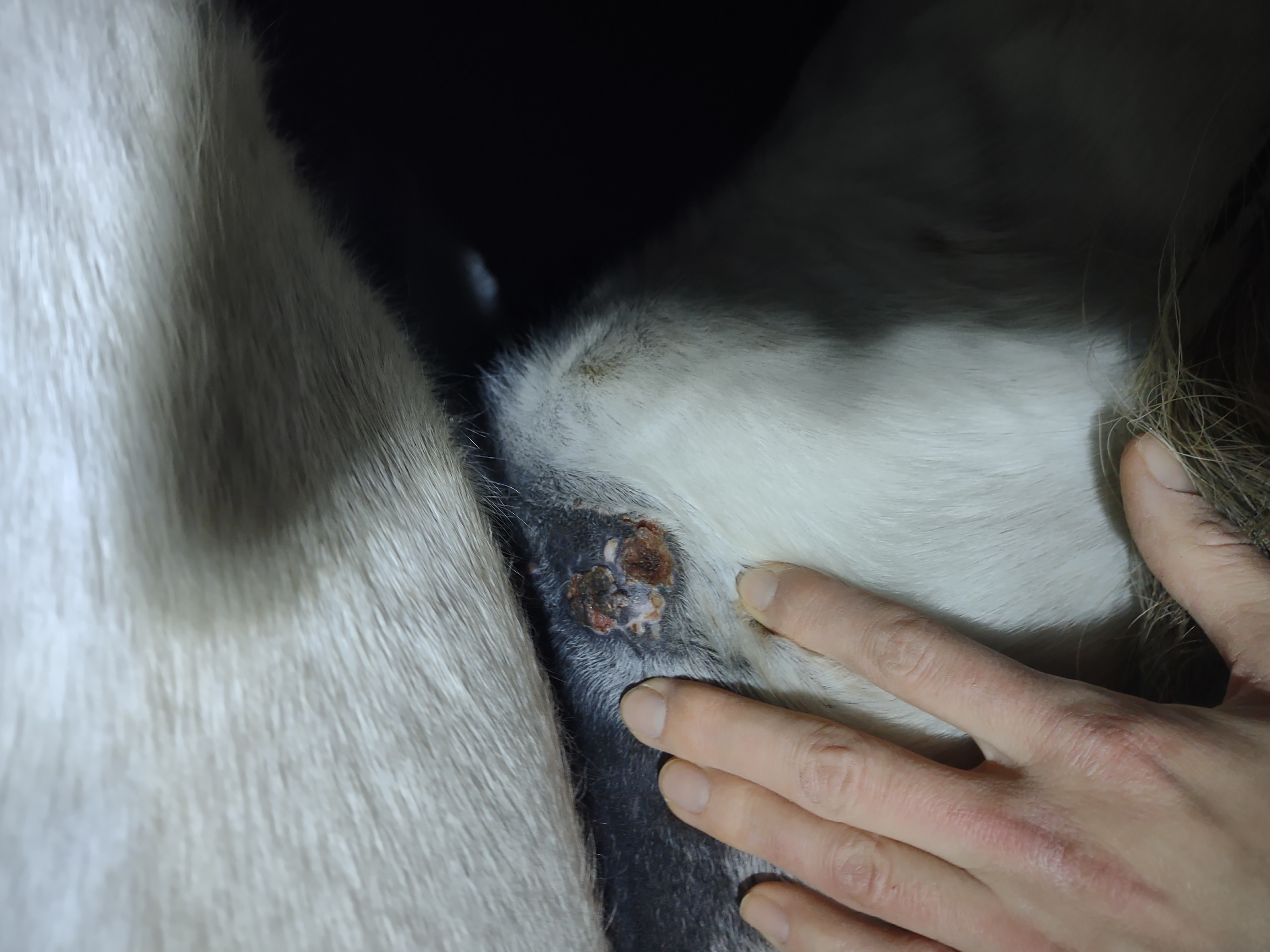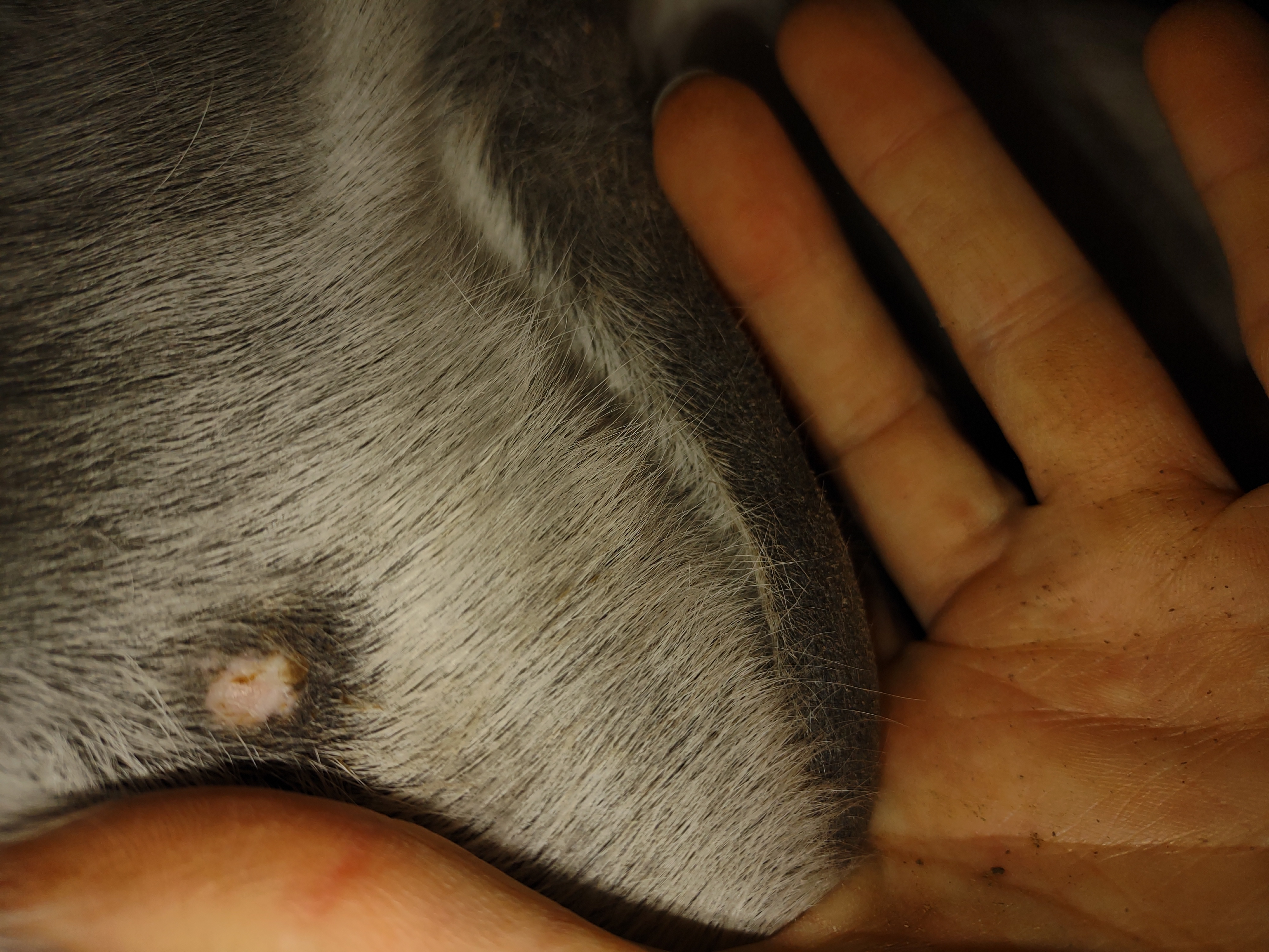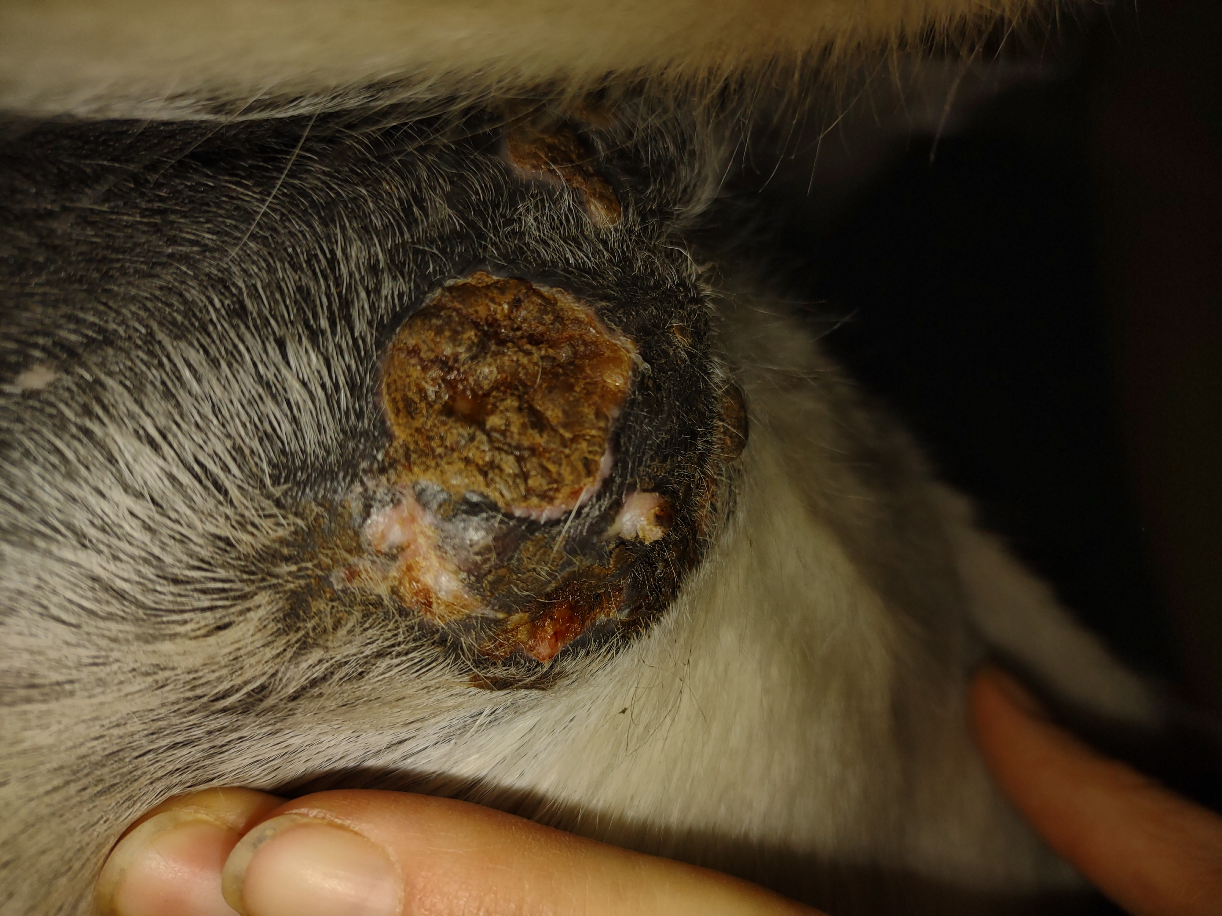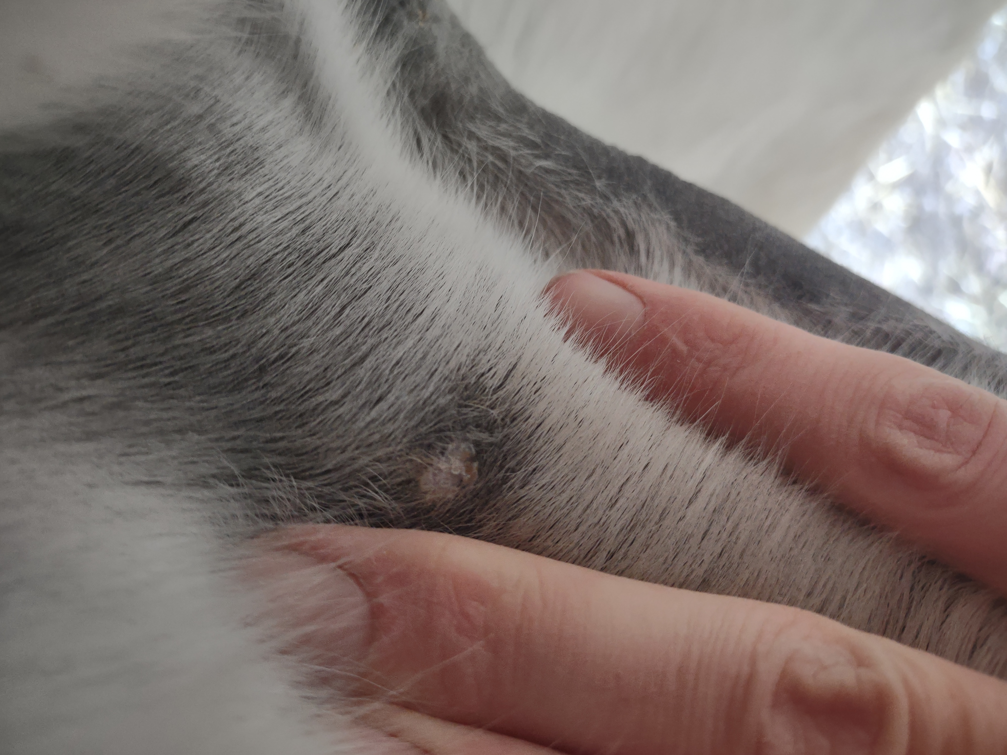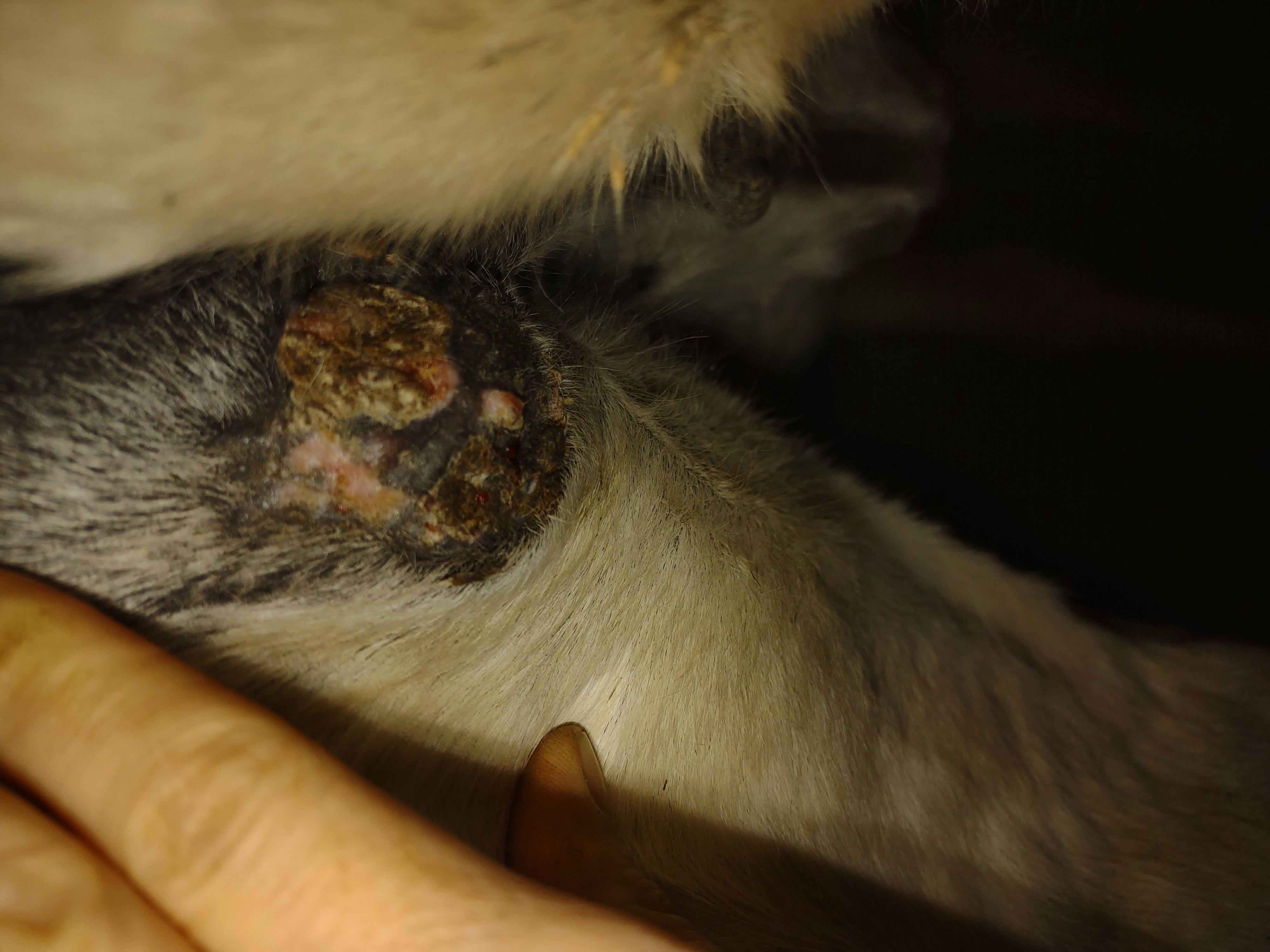 Montag und Mittwoch nur mit dem Salbenrest kurz getupft. Es hat tatsächlich noch mal geleistet ganz in der Mitte, eines knubbelig war. Leider war das Foto heute schwer mit Fell und Licht.