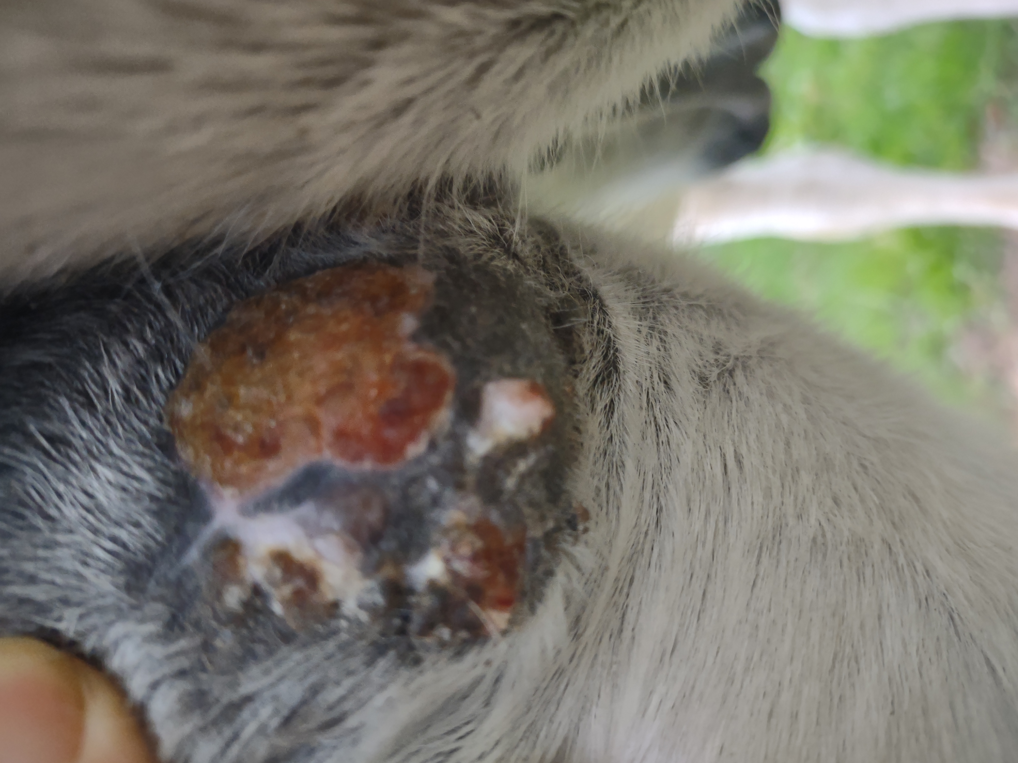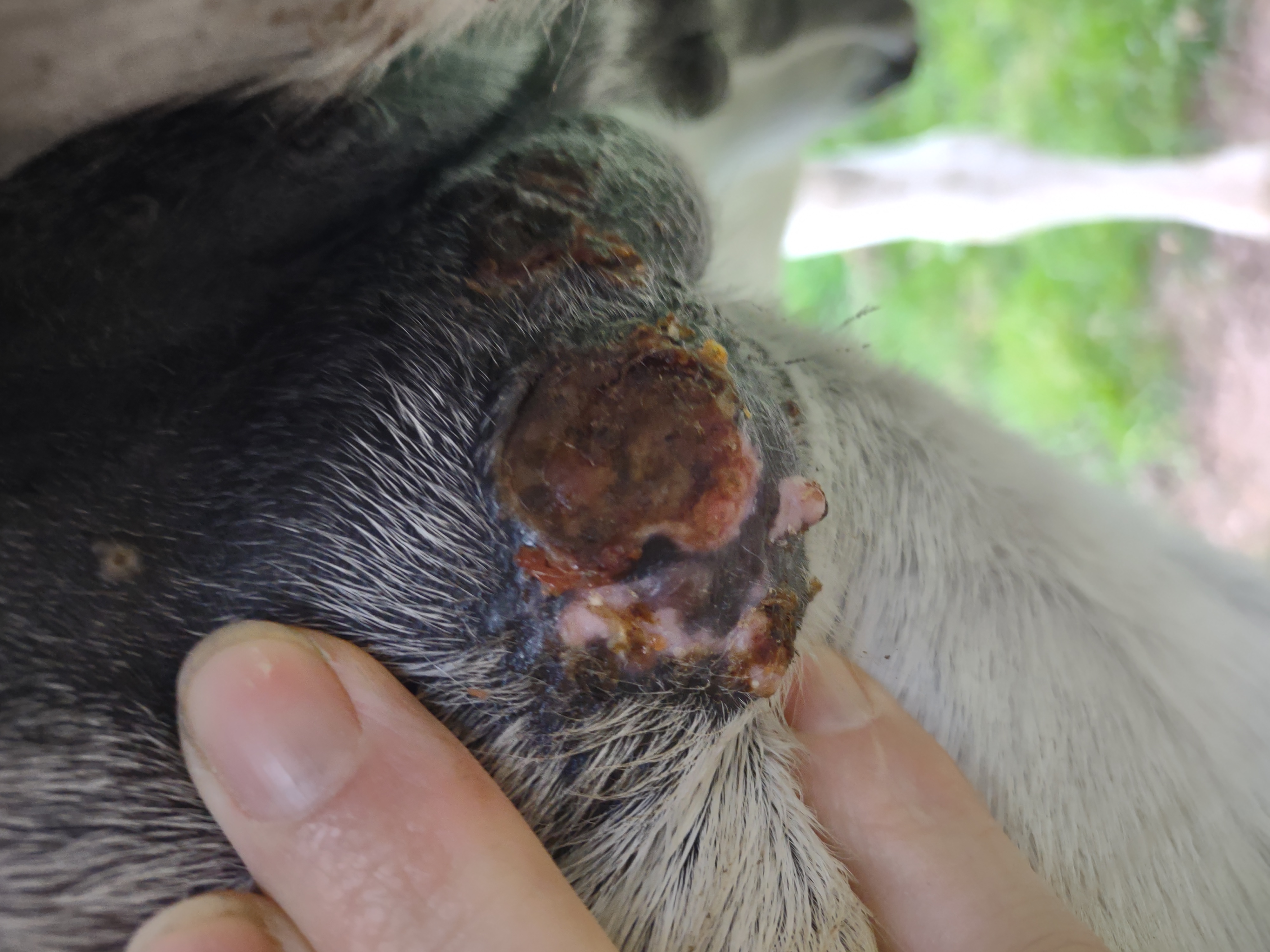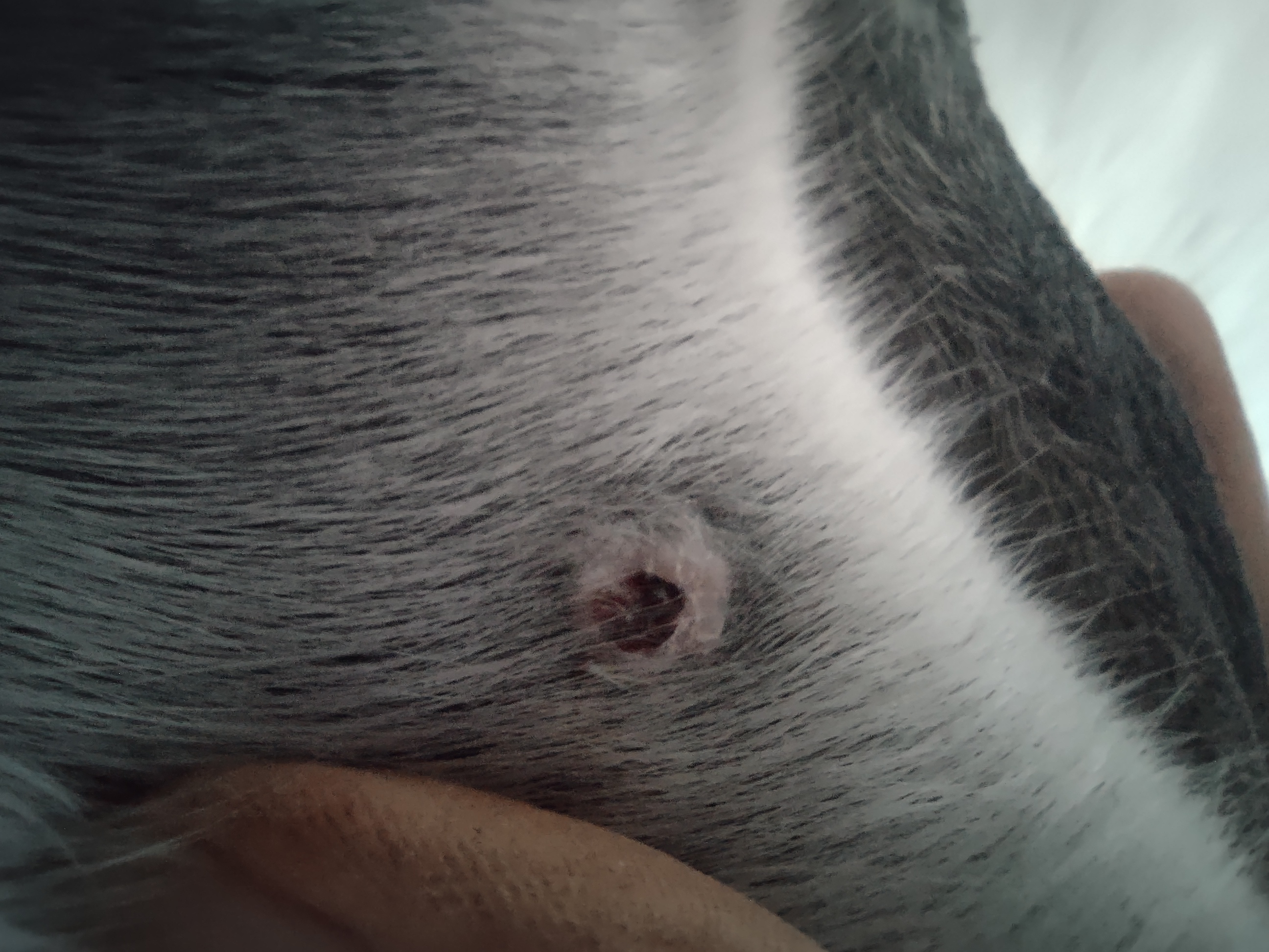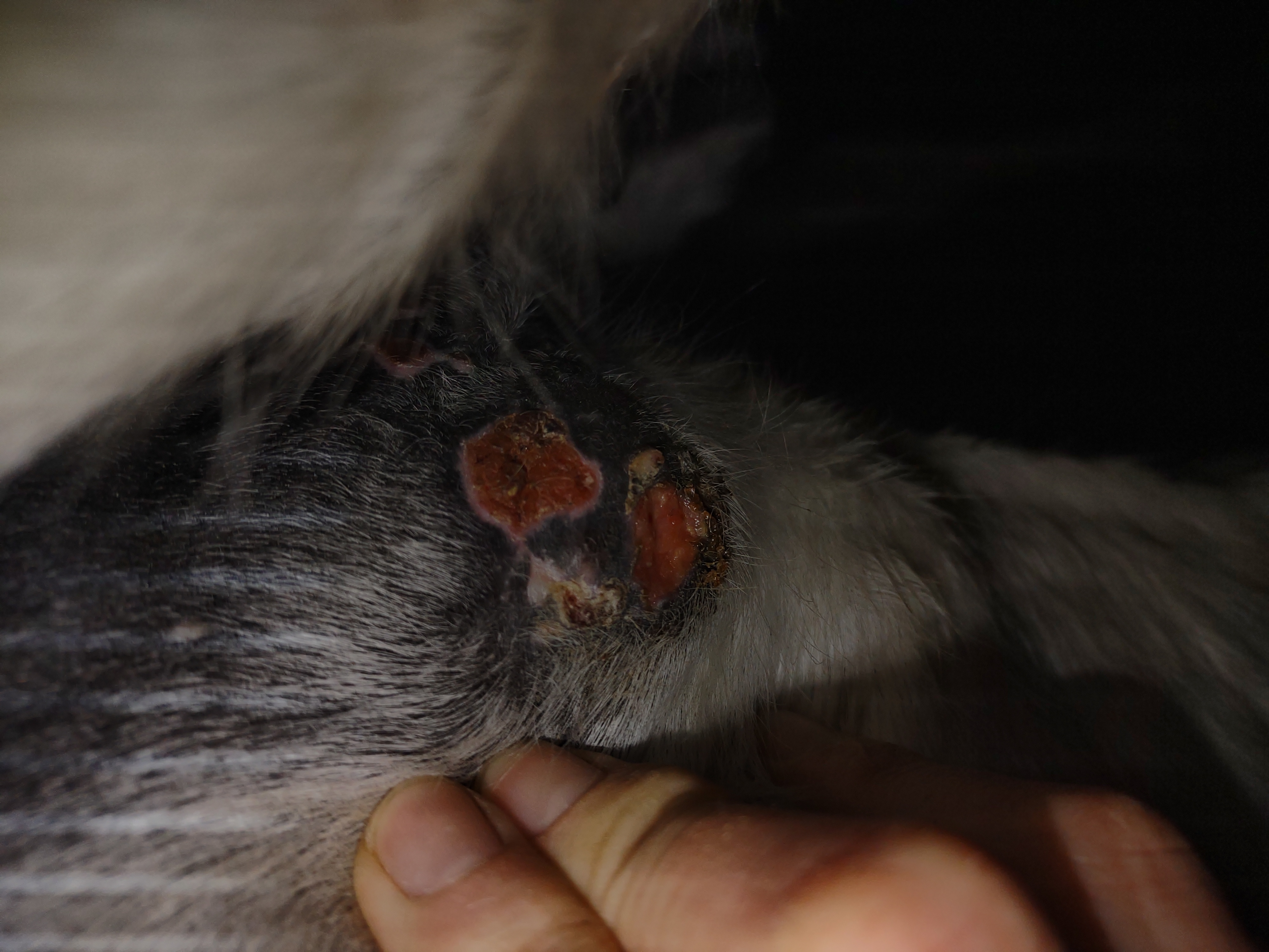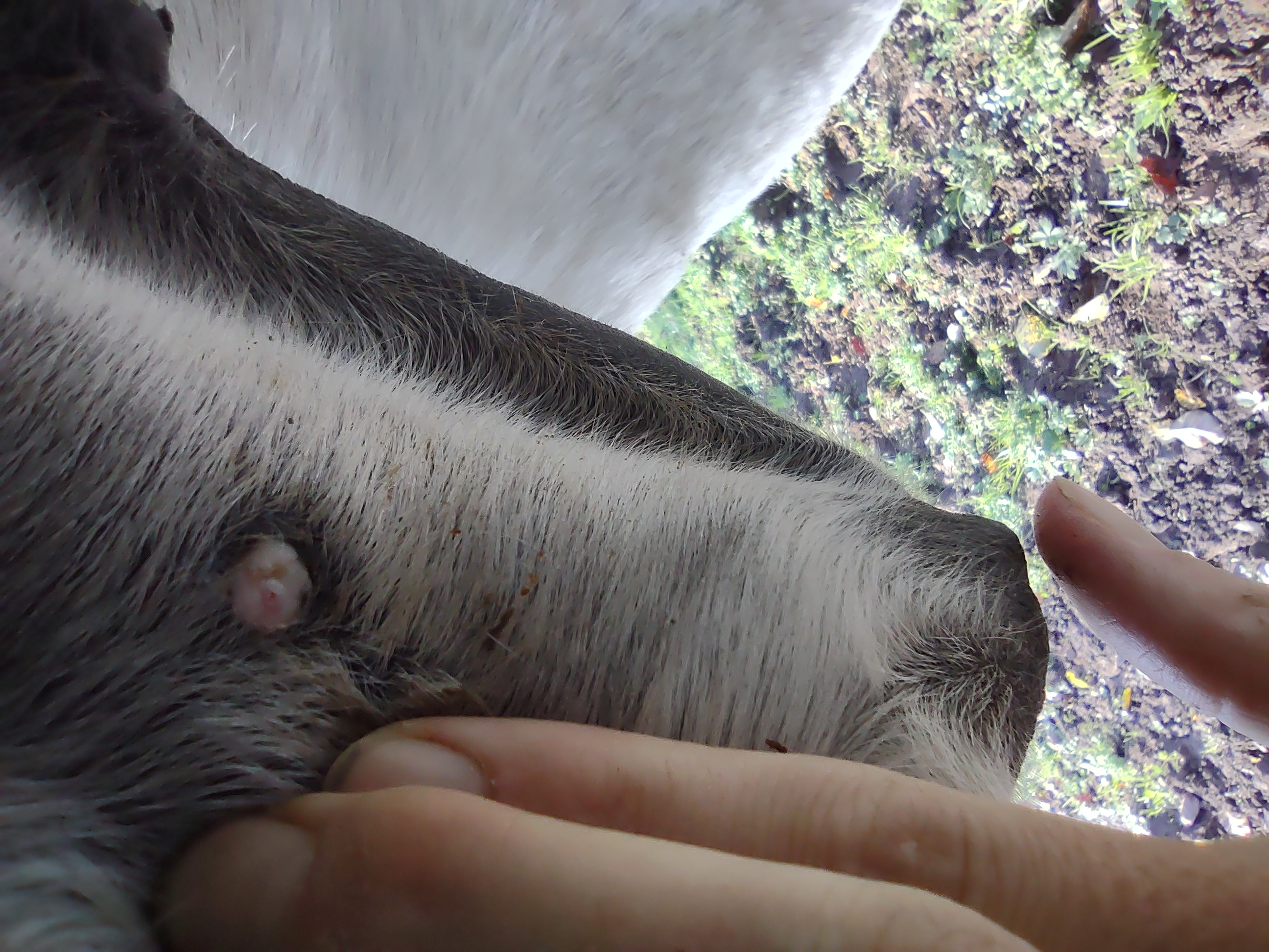 Montag und Mittwoch nur mit dem Salbenrest kurz getupft. Es hat tatsächlich noch mal geleistet ganz in der Mitte, eines knubbelig war. Leider war das Foto heute schwer mit Fell und Licht.