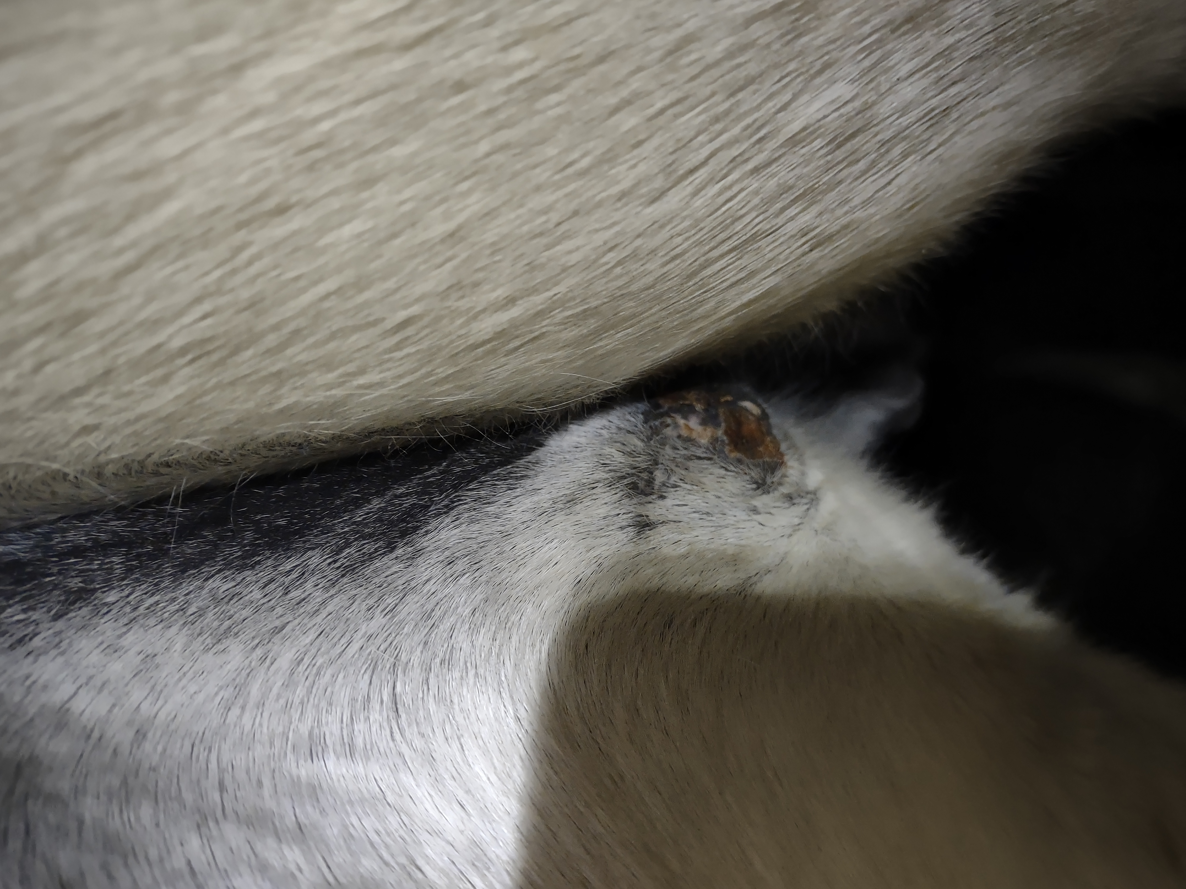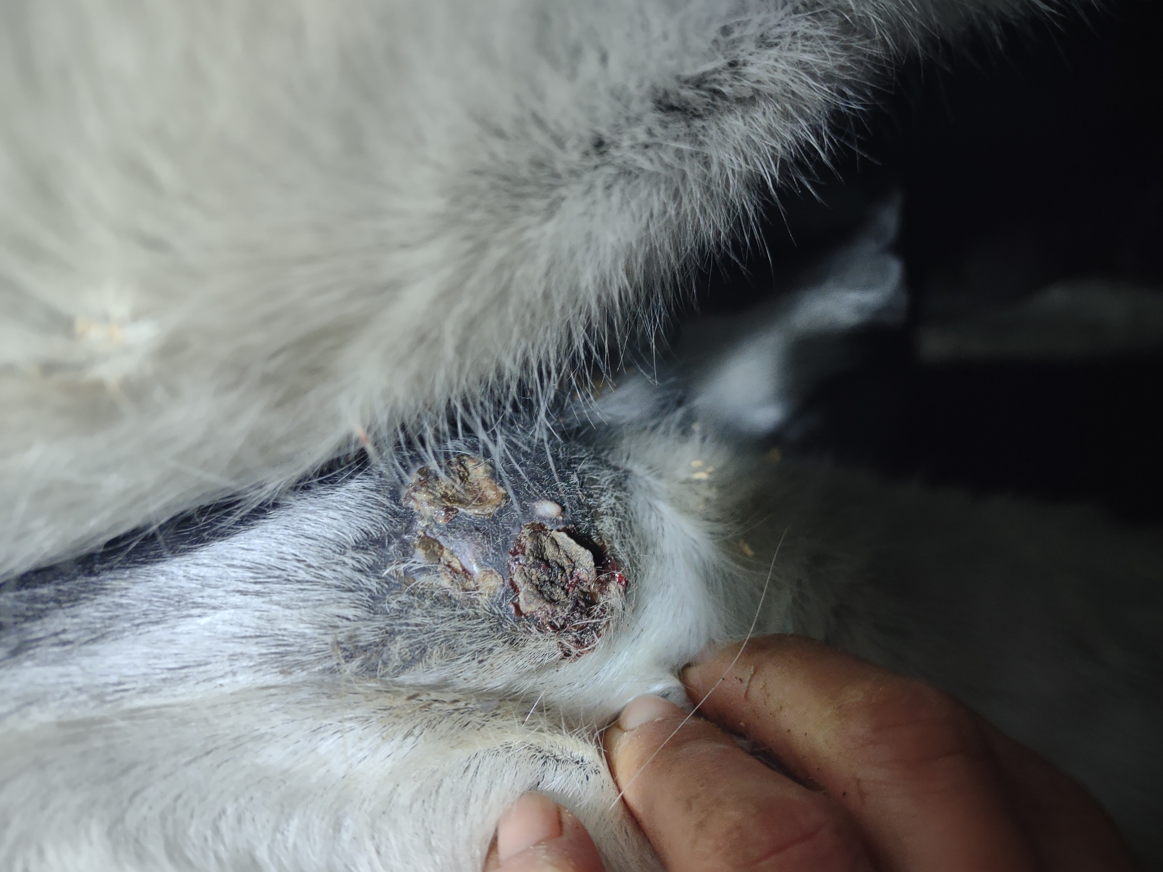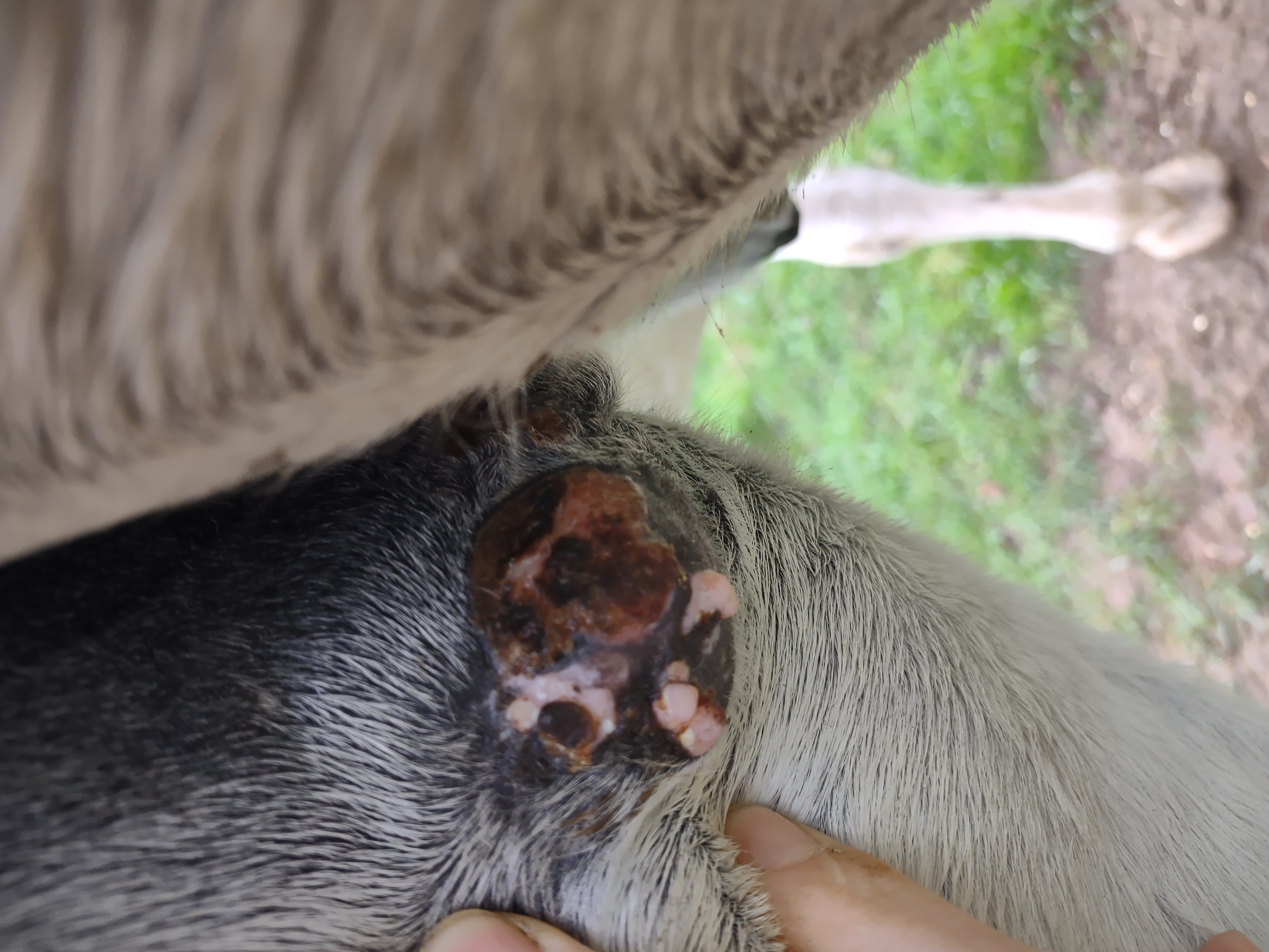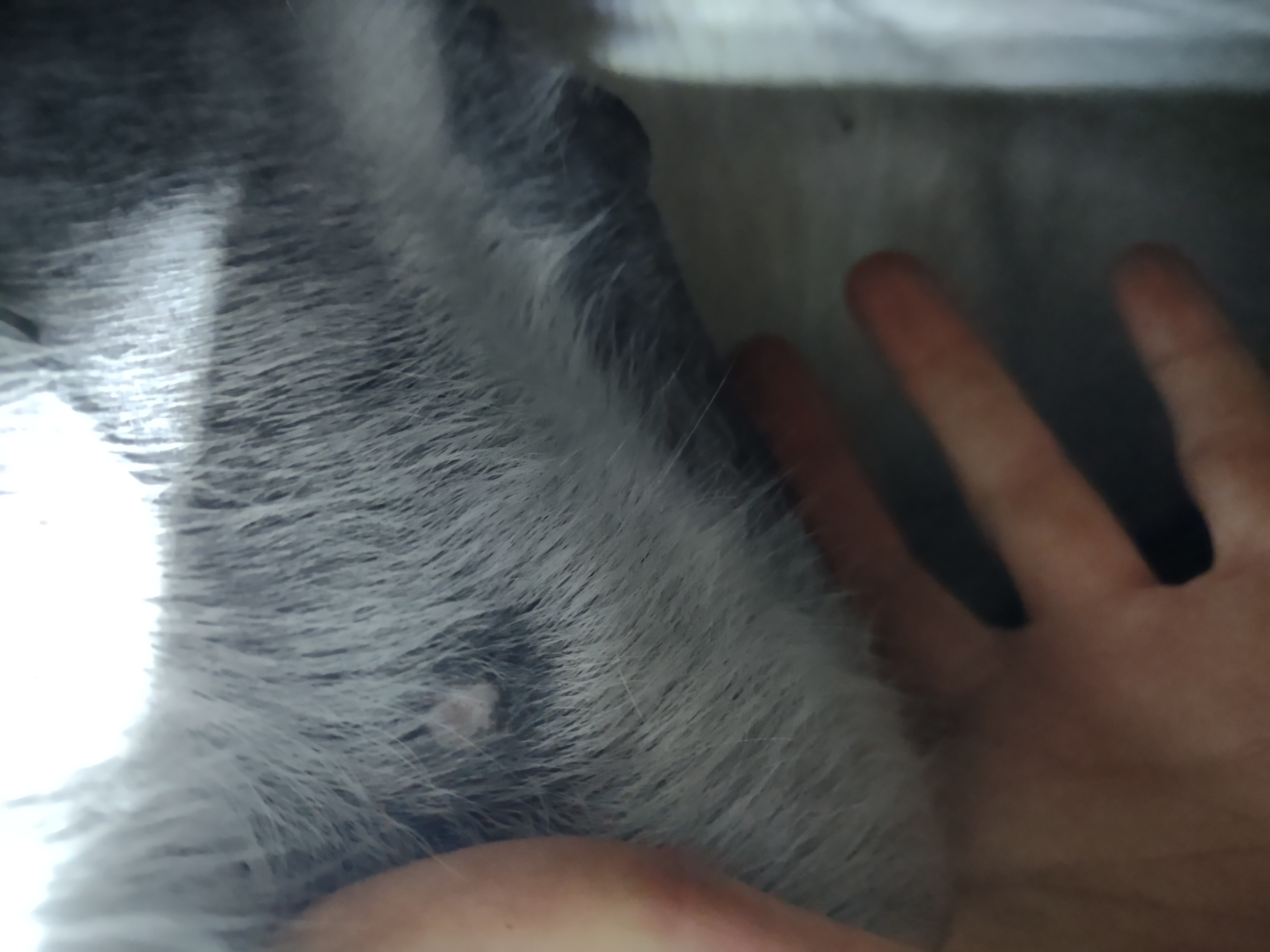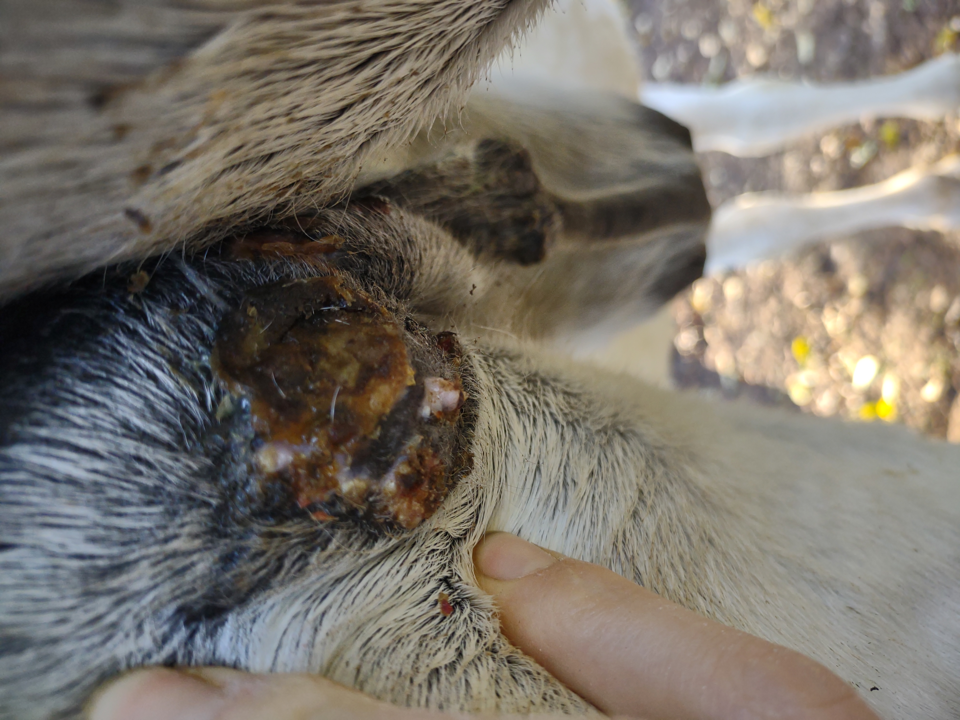 Montag und Mittwoch nur mit dem Salbenrest kurz getupft. Es hat tatsächlich noch mal geleistet ganz in der Mitte, eines knubbelig war. Leider war das Foto heute schwer mit Fell und Licht.