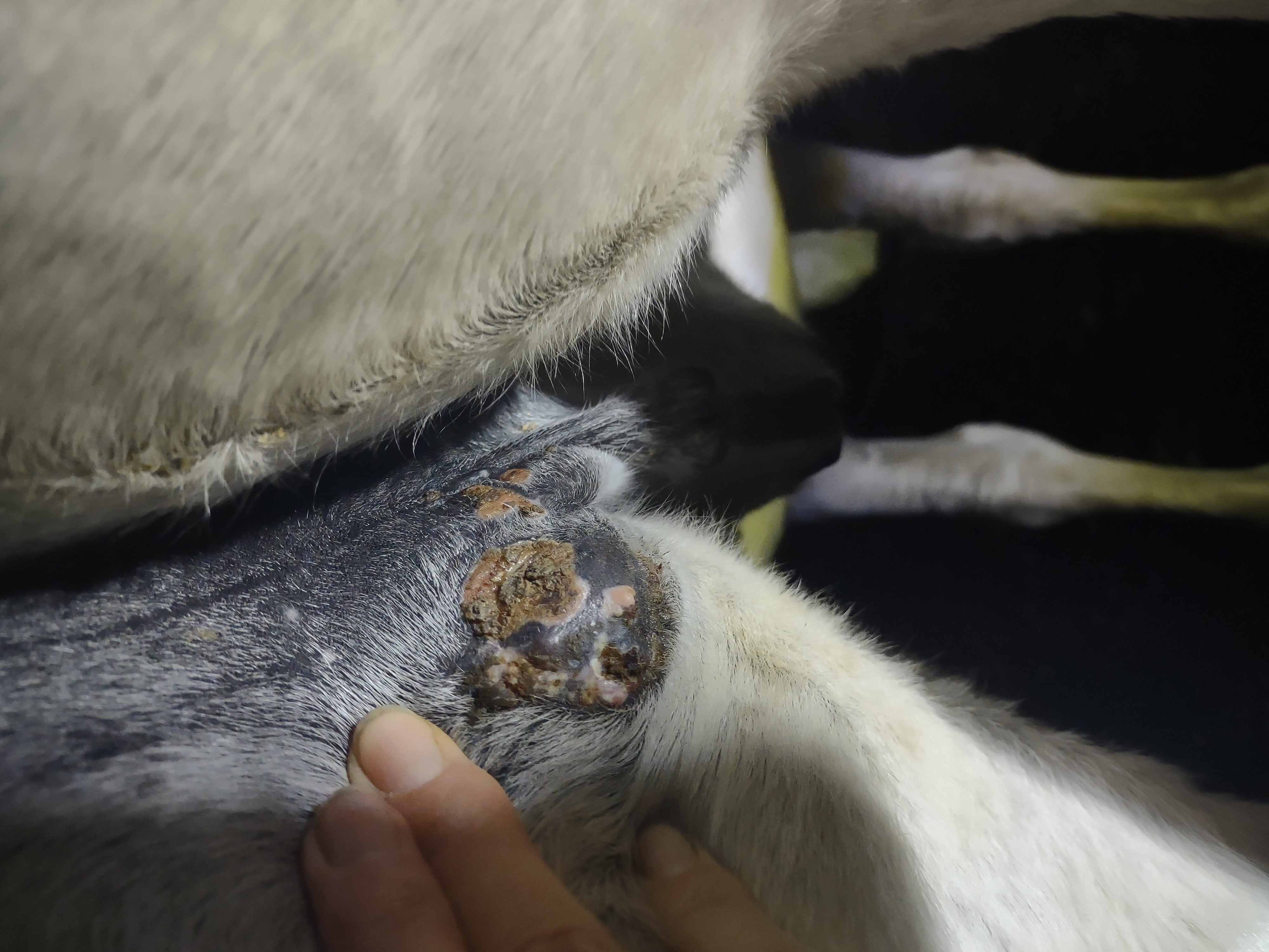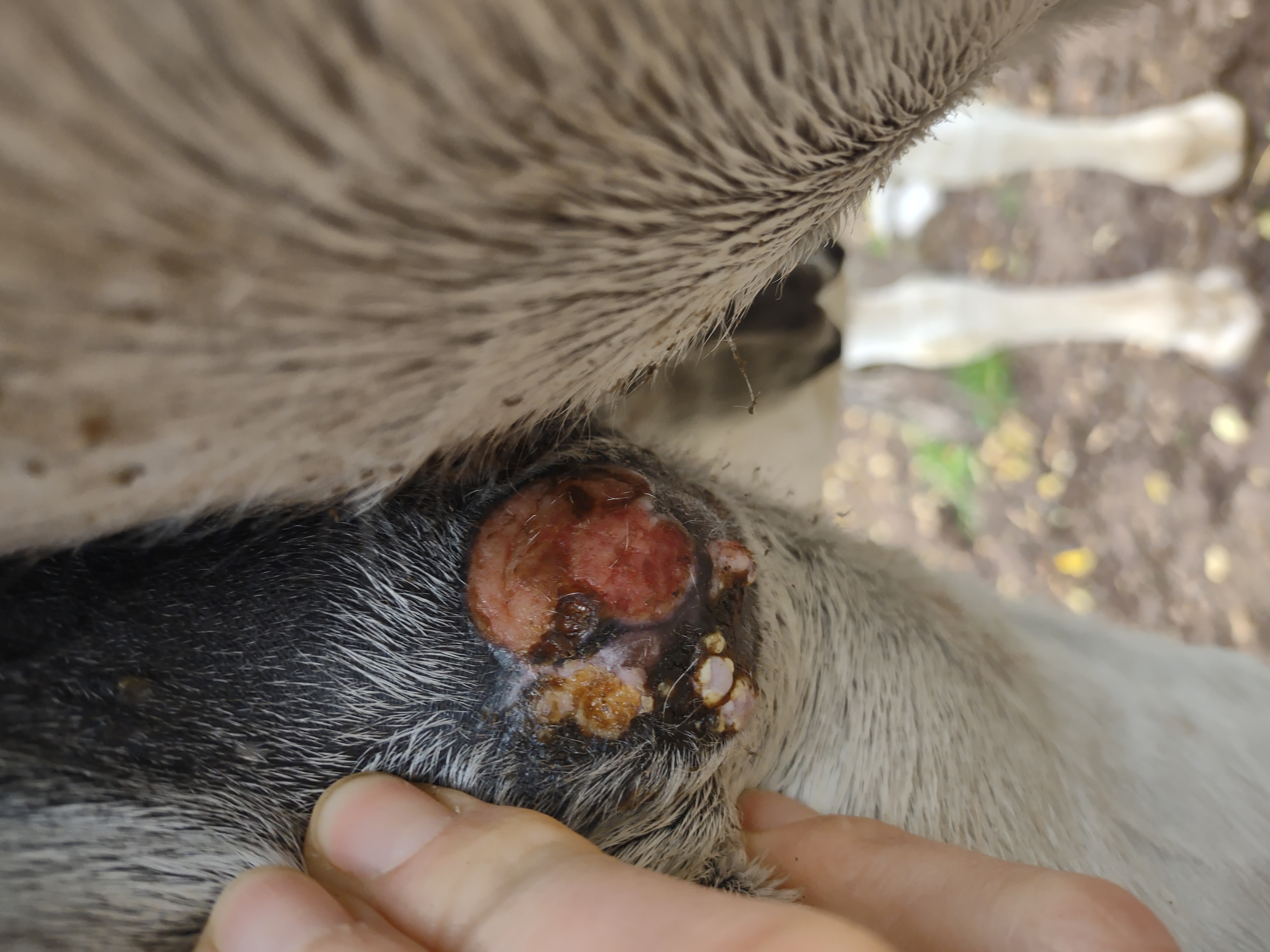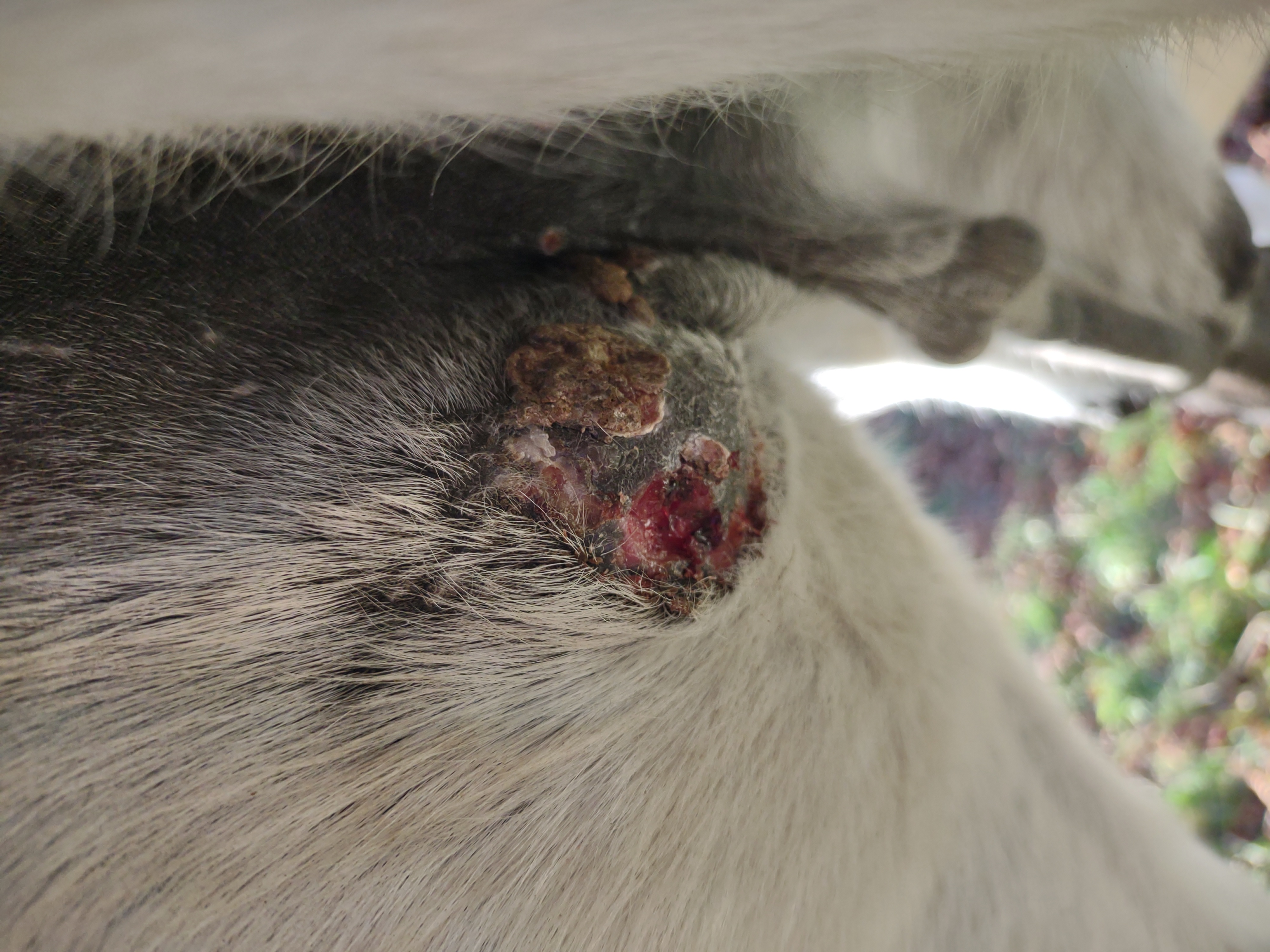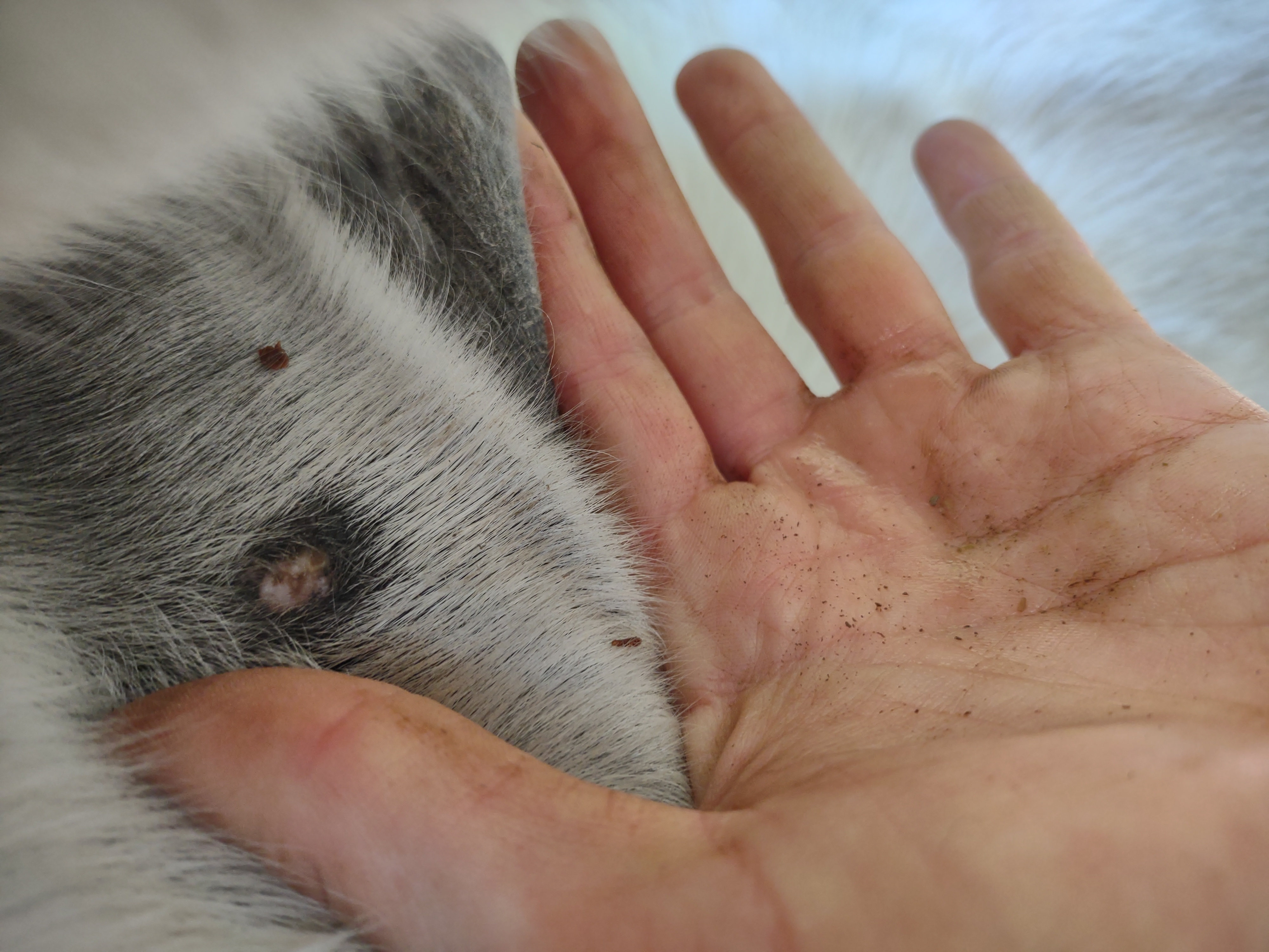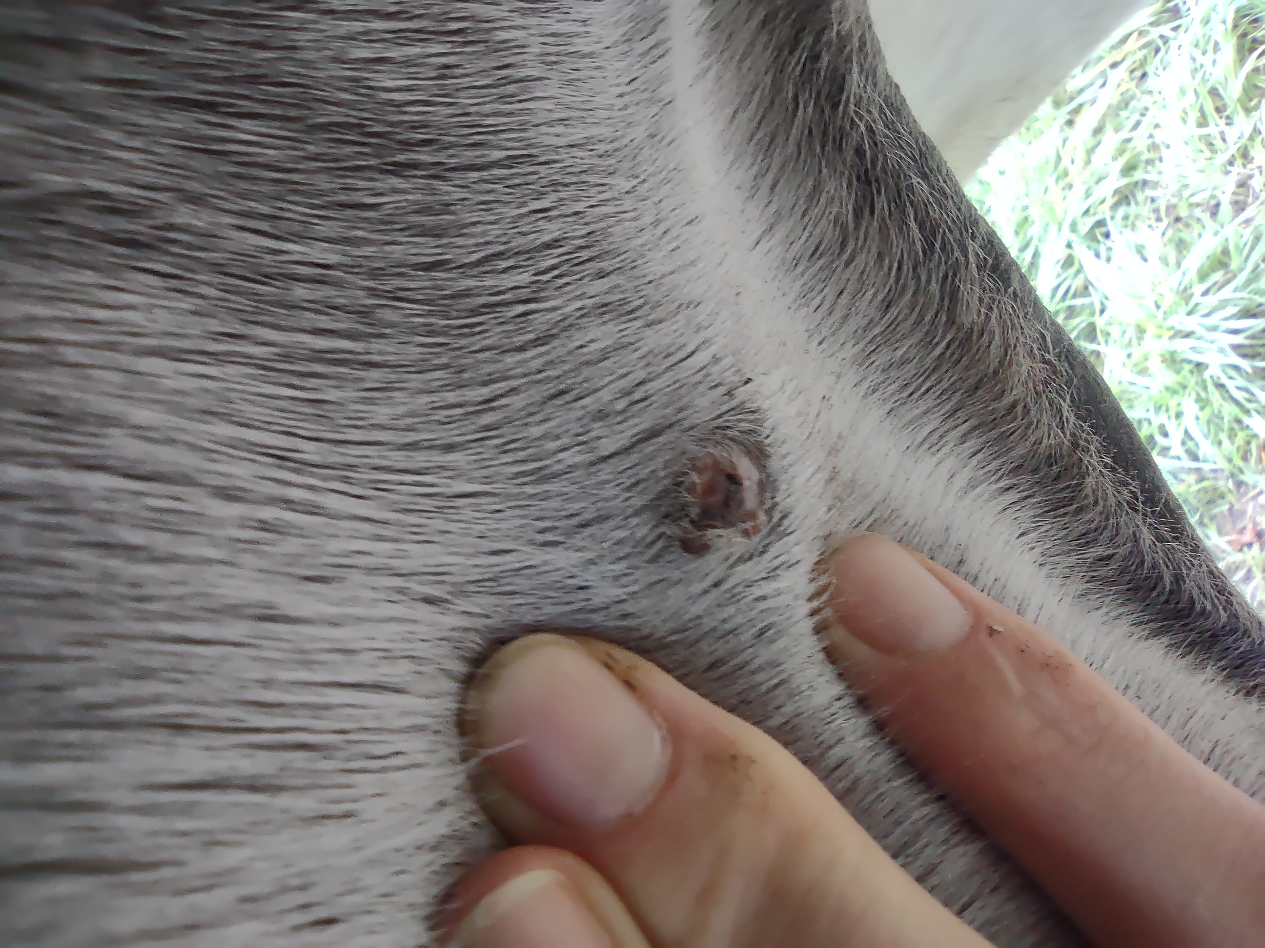 Montag und Mittwoch nur mit dem Salbenrest kurz getupft. Es hat tatsächlich noch mal geleistet ganz in der Mitte, eines knubbelig war. Leider war das Foto heute schwer mit Fell und Licht.