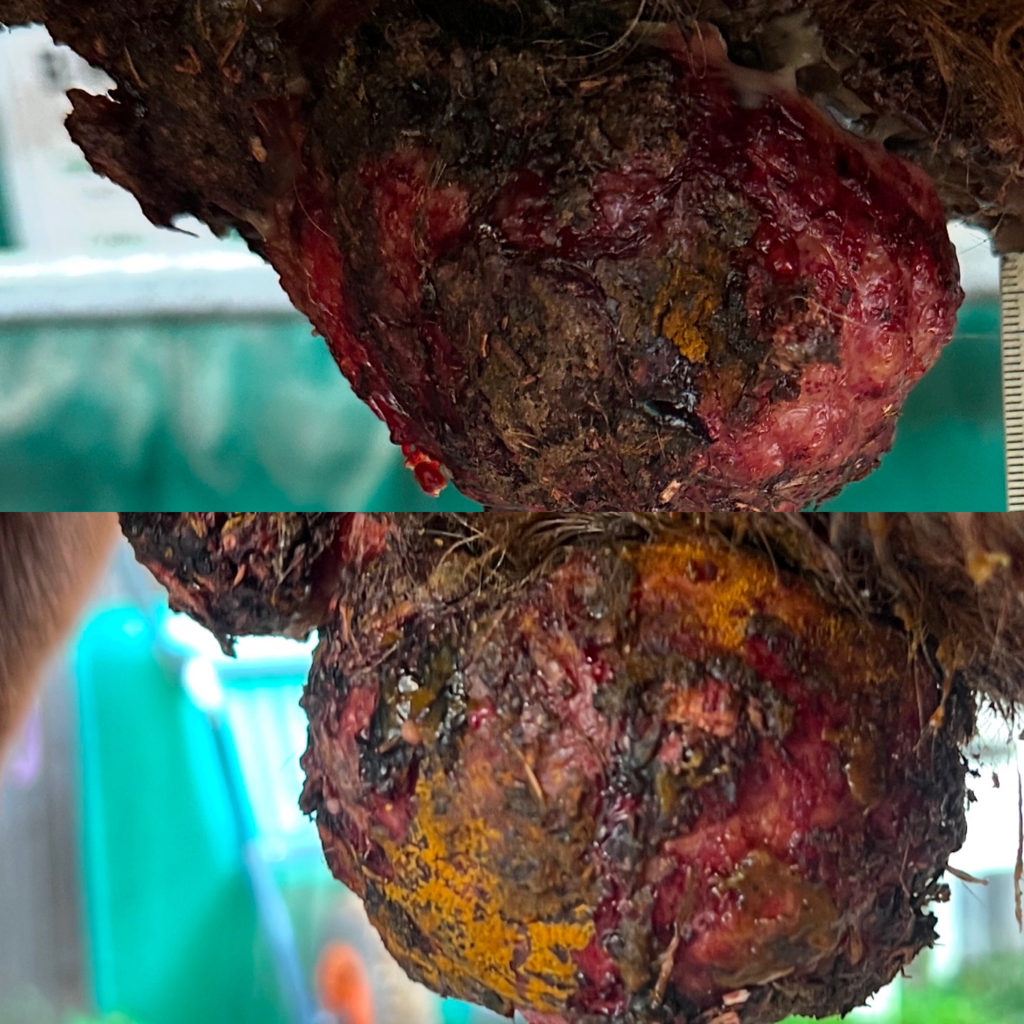 Hier sieht man die Veränderung vor allem am hinteren Teil des Sarkoids. Oben ist heute, unten ist von vor der Behandlung