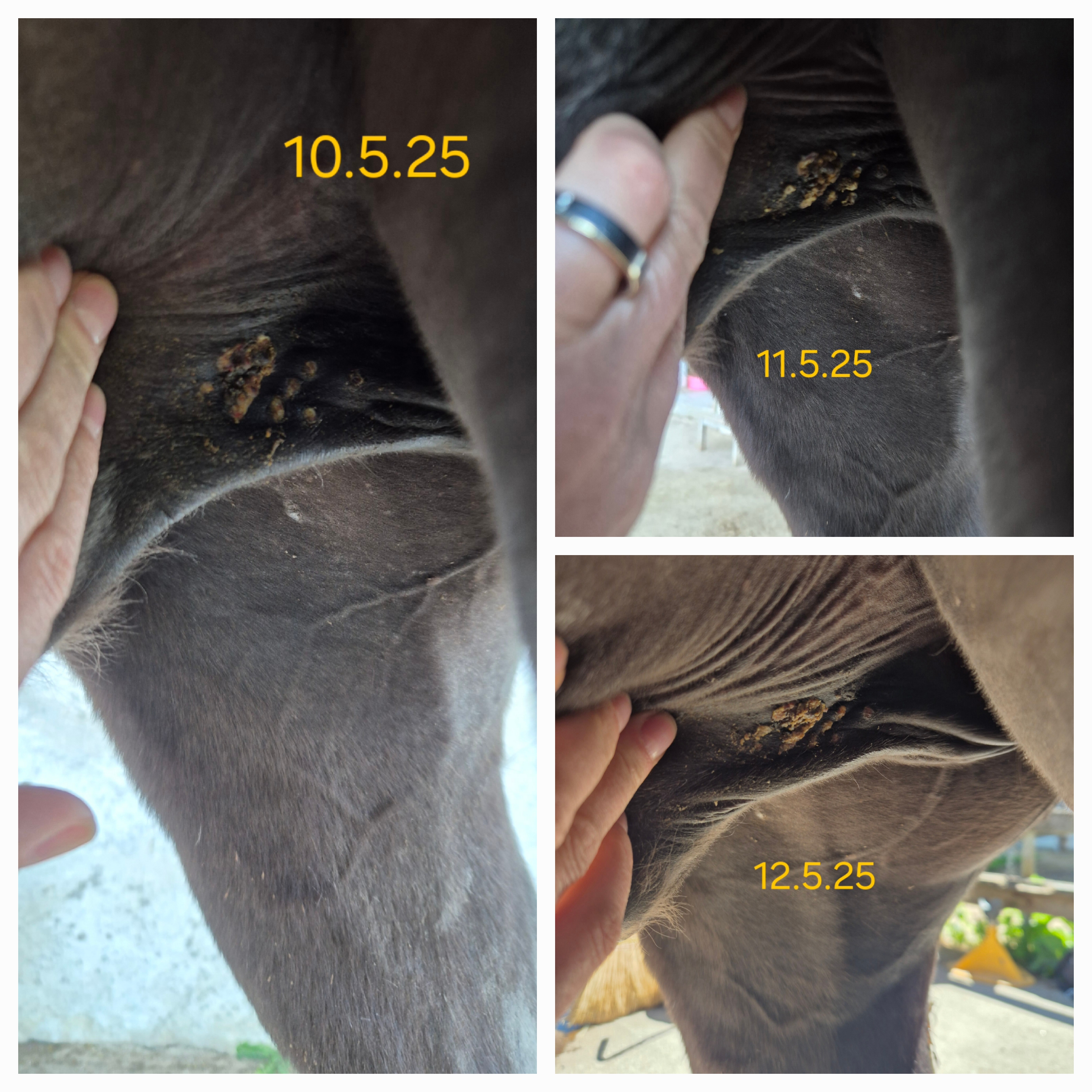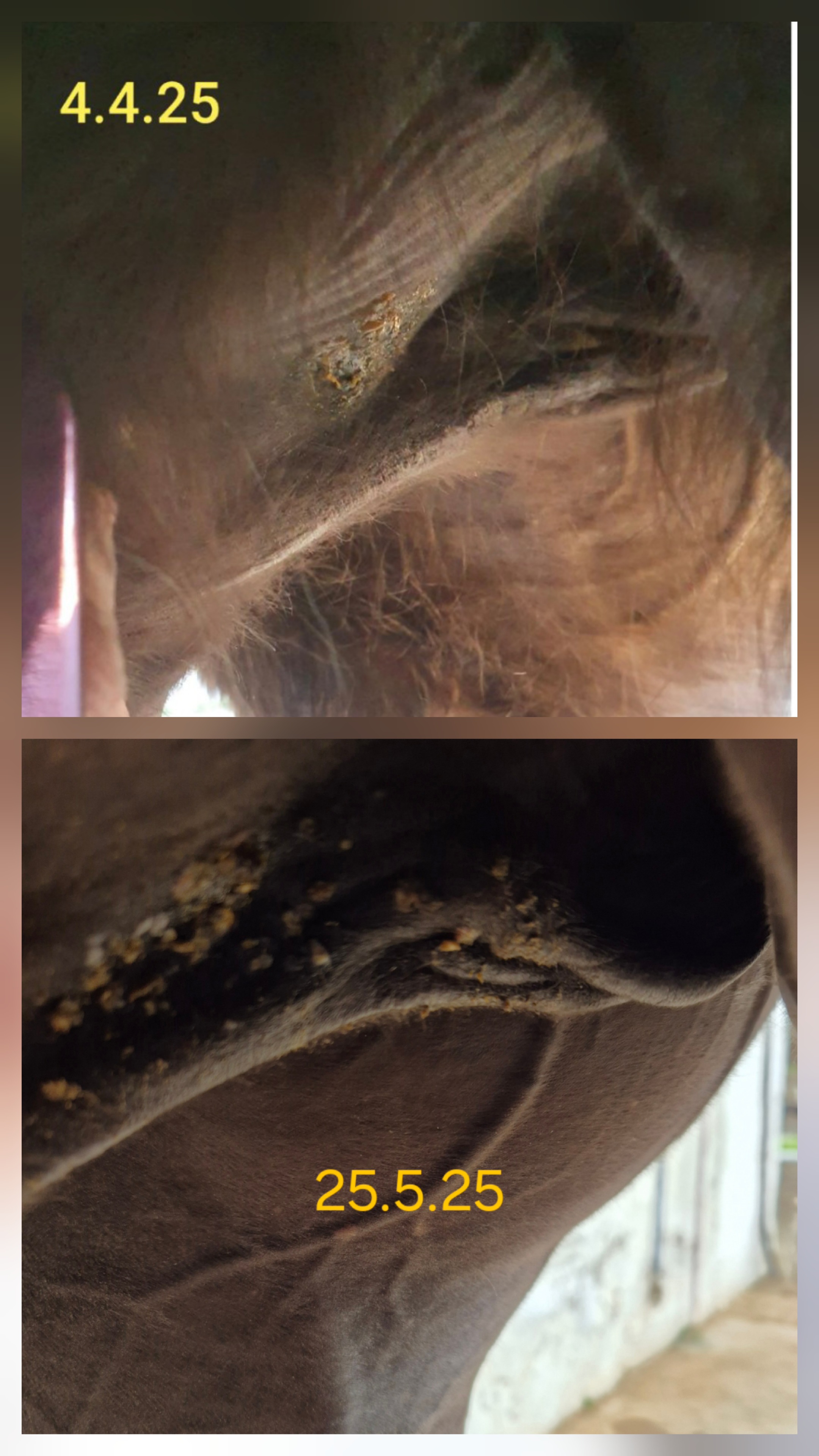 Am Schlauch ist das meiste vom Sarkoid abgefallen. Es sind nur viele kleine Stellen die immer wieder krusten, dann abfallen und helle Stellen zurückbleiben die dann wieder verkrusten.