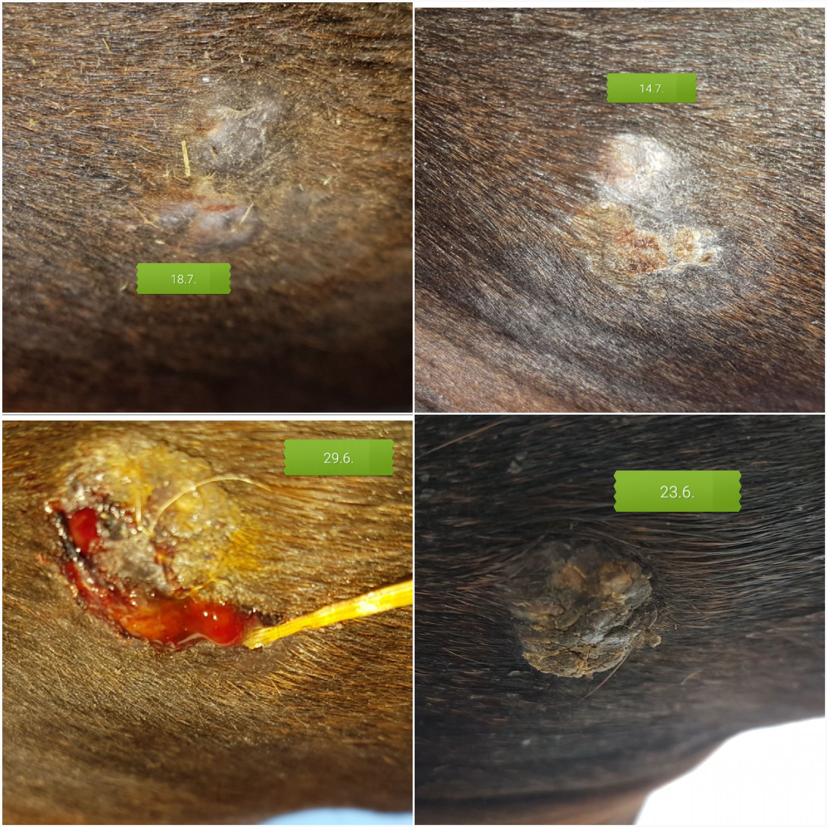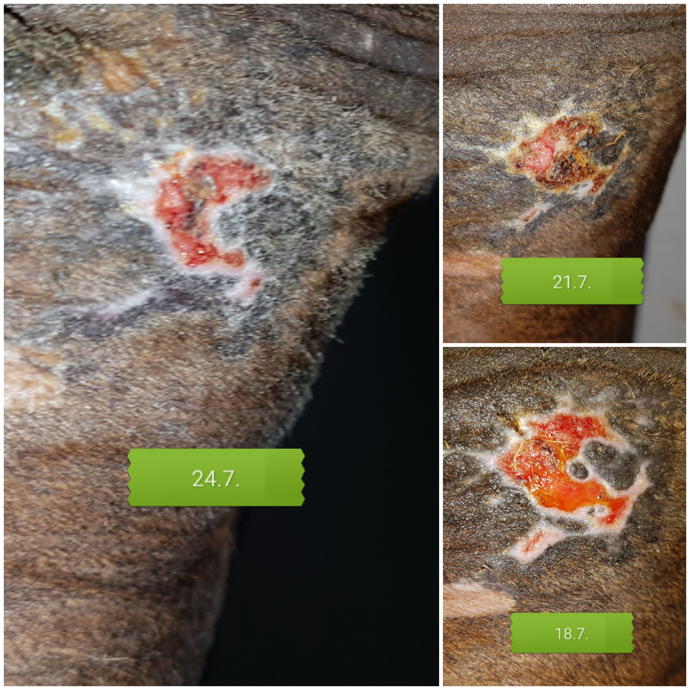Wir haben eines am Bein hinten soweit oben das es gegen das andere Bein kommt. Ich habe riesigen Schiss davor zu schmieren aber es wächst von alleine daher muss irgendwas her