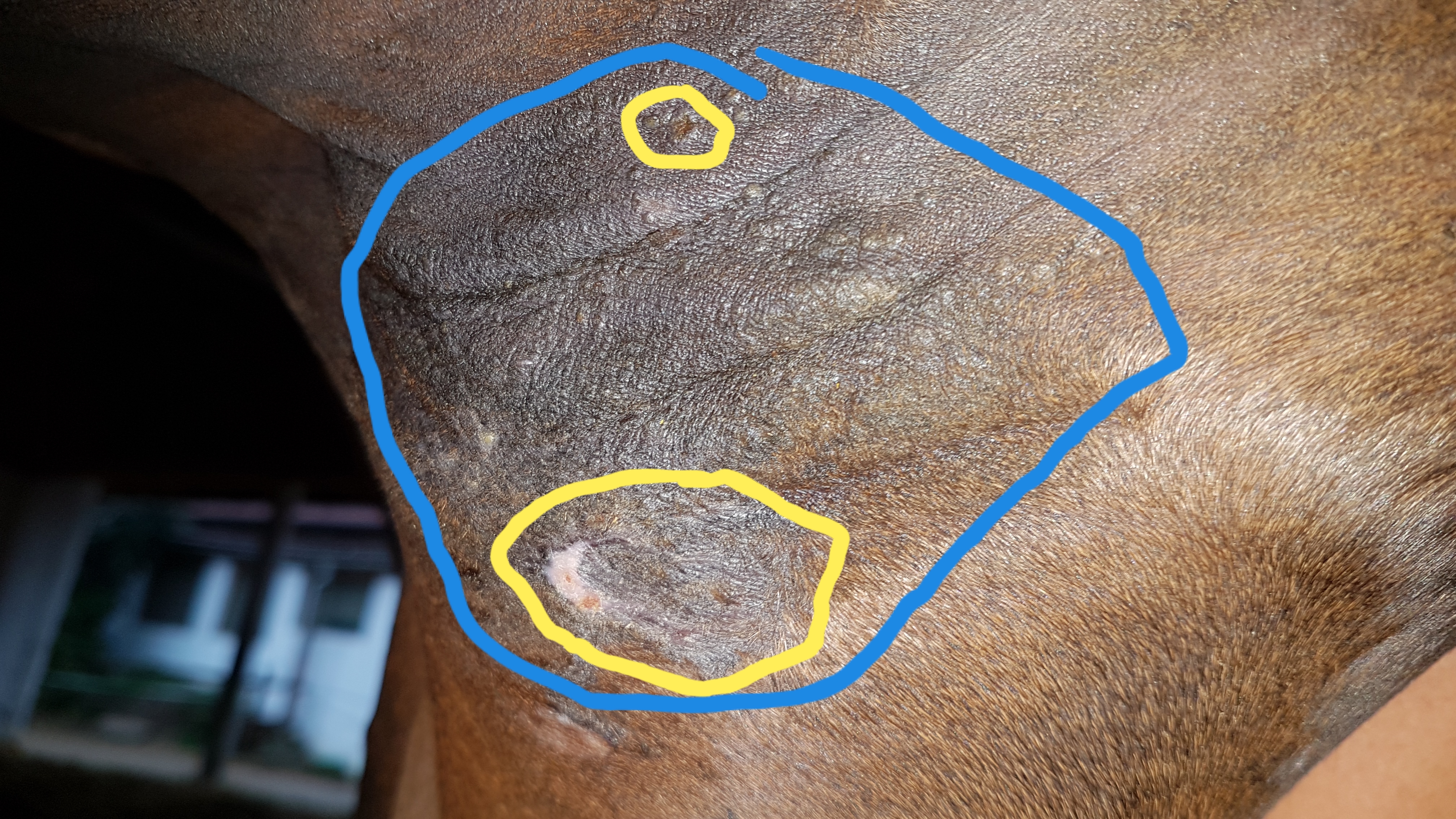 Wird spannend, ob die Achsel bald verloren hat oder nicht. Da sind so kleine "Pickelchen", von denen ich nicht weiß, was sie sind. Gelb markiert habe ich mal die ursprüngliche Lage der Sarkoide. Blau umrandet ist der Bereich, den ich aktuell mit CompX verdünnt schmiere. Mal sehen, ob die Pickel noch reagieren.