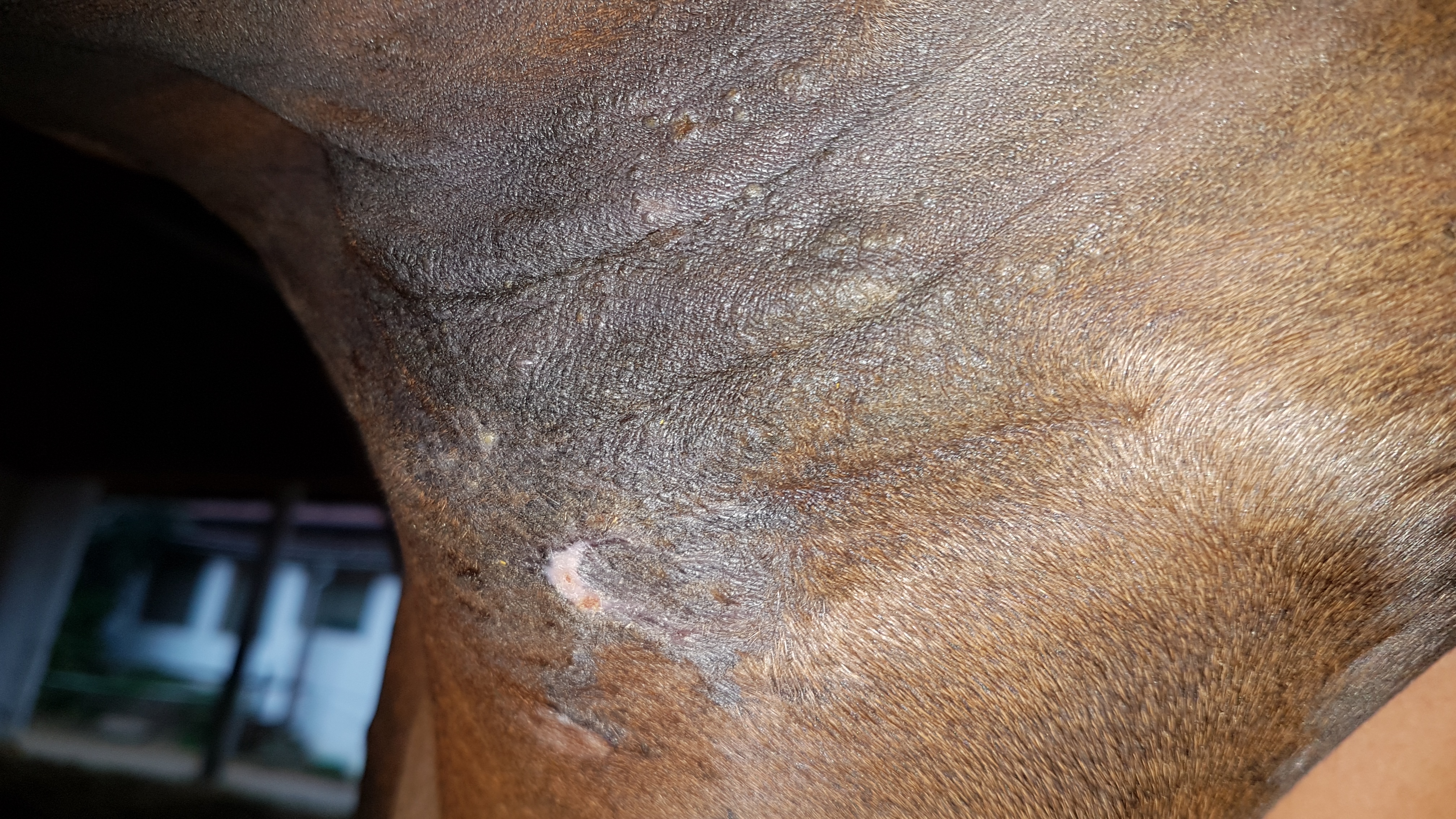 Aktuell bildet sich z.B. eine Kruste "fernab" des eigentlichen Achsel-Sarkoids (der klitzekleine Knubbel neben dem Sarkoid hat darunter scheinbar noch einiges im Angebot). Ich persönlich gehe sogar davon aus, dass es sich nicht um zwei separate Sarkoide handelt, sondern das alles ein großes Sarkoidgeflecht ist. Stand 27.07.:
