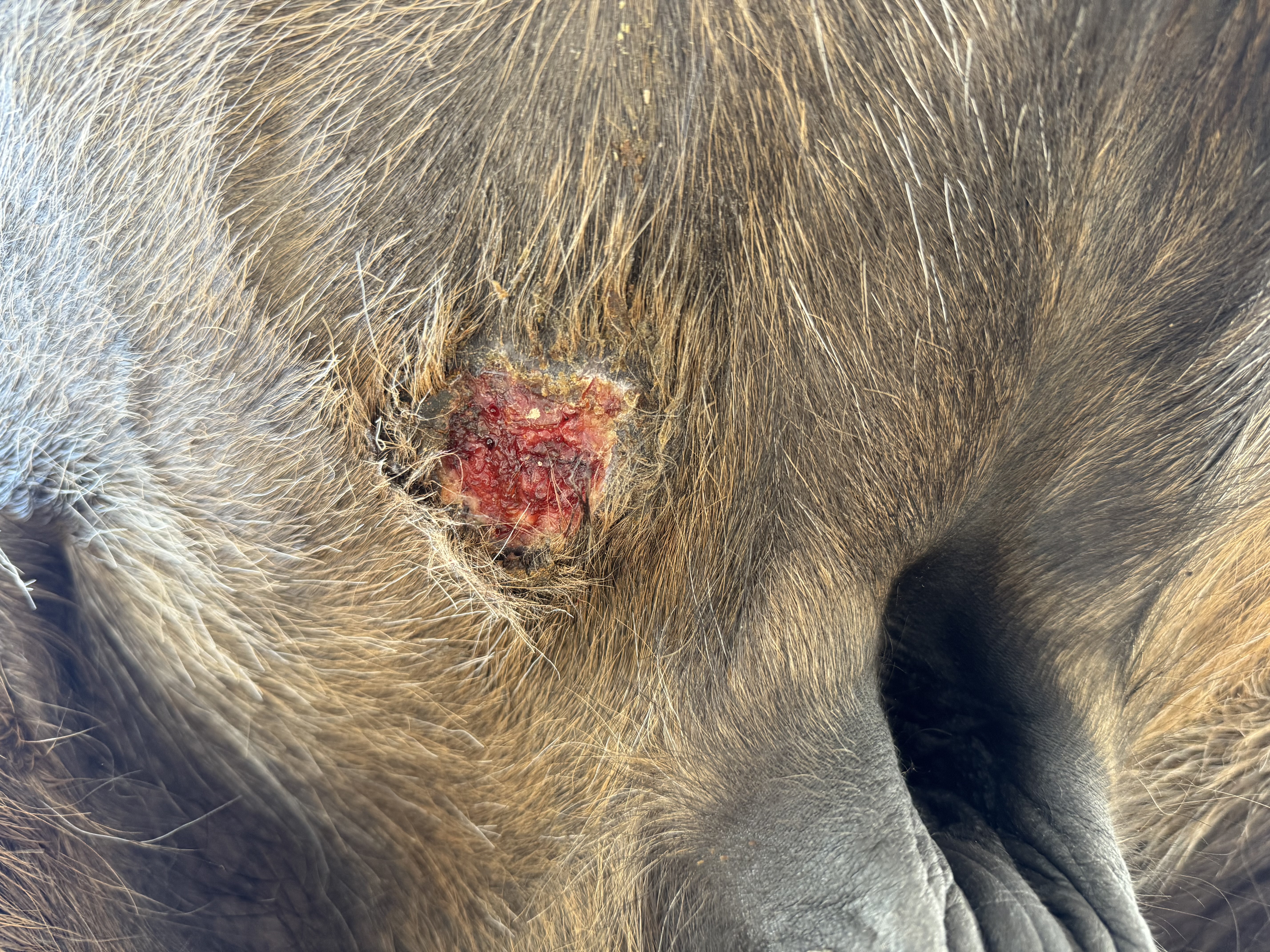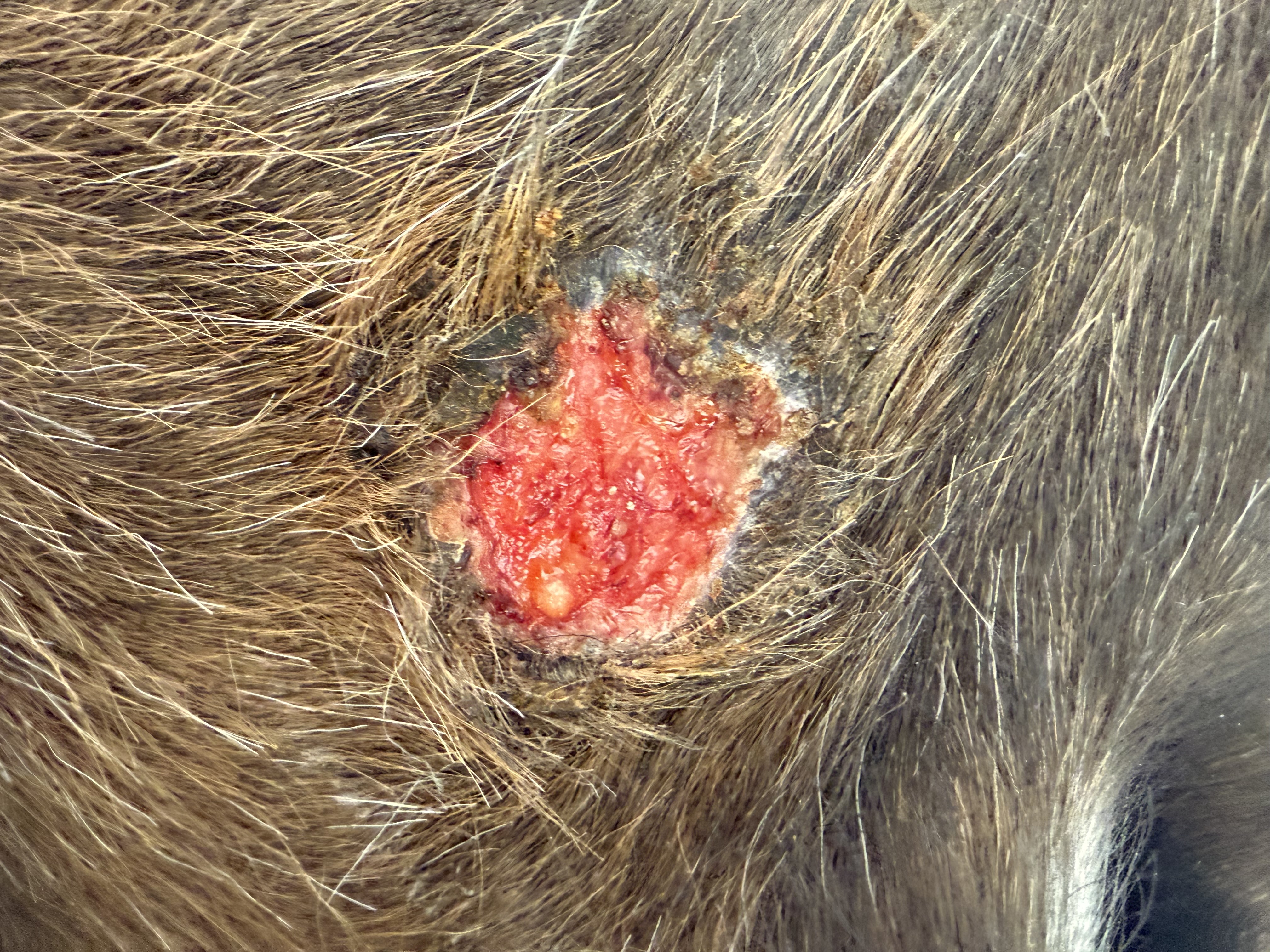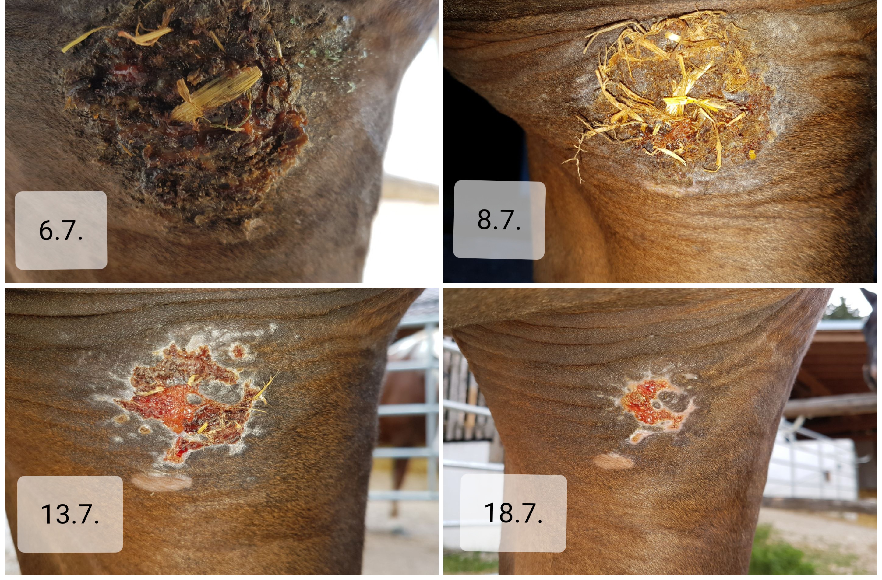 Das war eines unserer Sarkoide. Links oben Kruste unter 1:1, dann nur noch 1:5 geschmiert. Entwicklung auf 2 Wochen... man KANN das künstlich krustig schmieren. Schau in mein Tagebuch. Ich hatte es auch nicht glauben können. Dafür läuft mein Pferd heute noch mit haarlosen Narben rum.