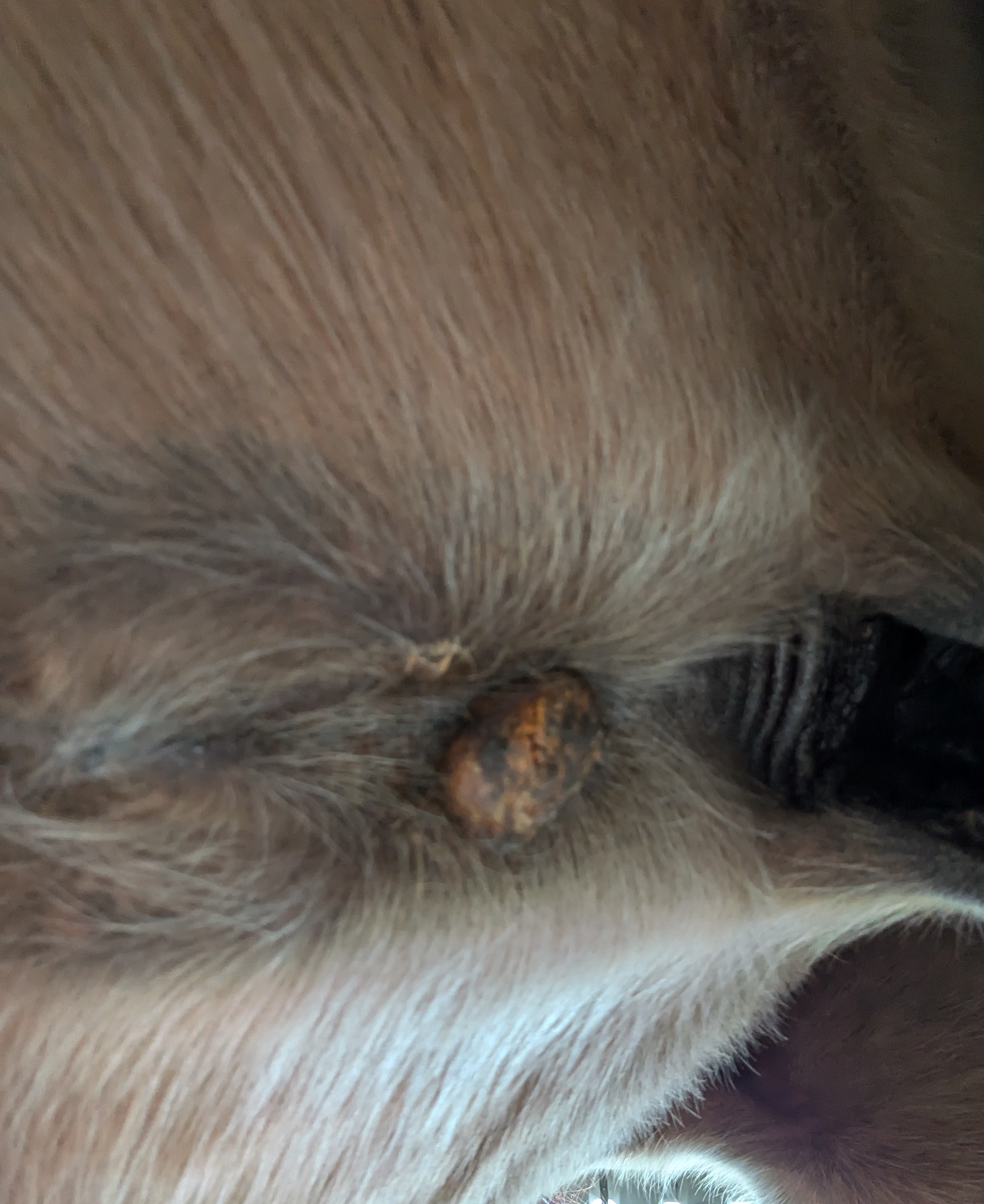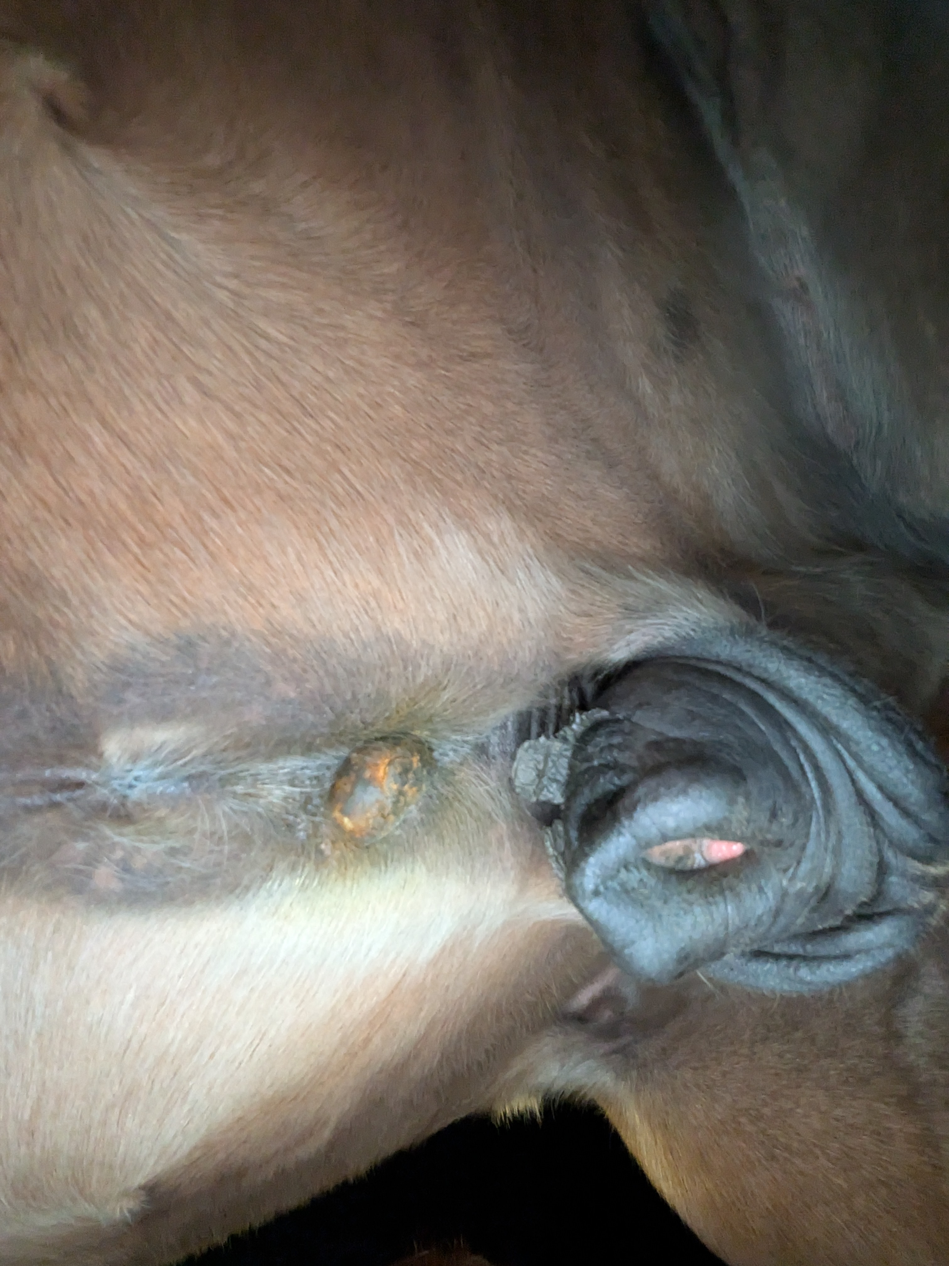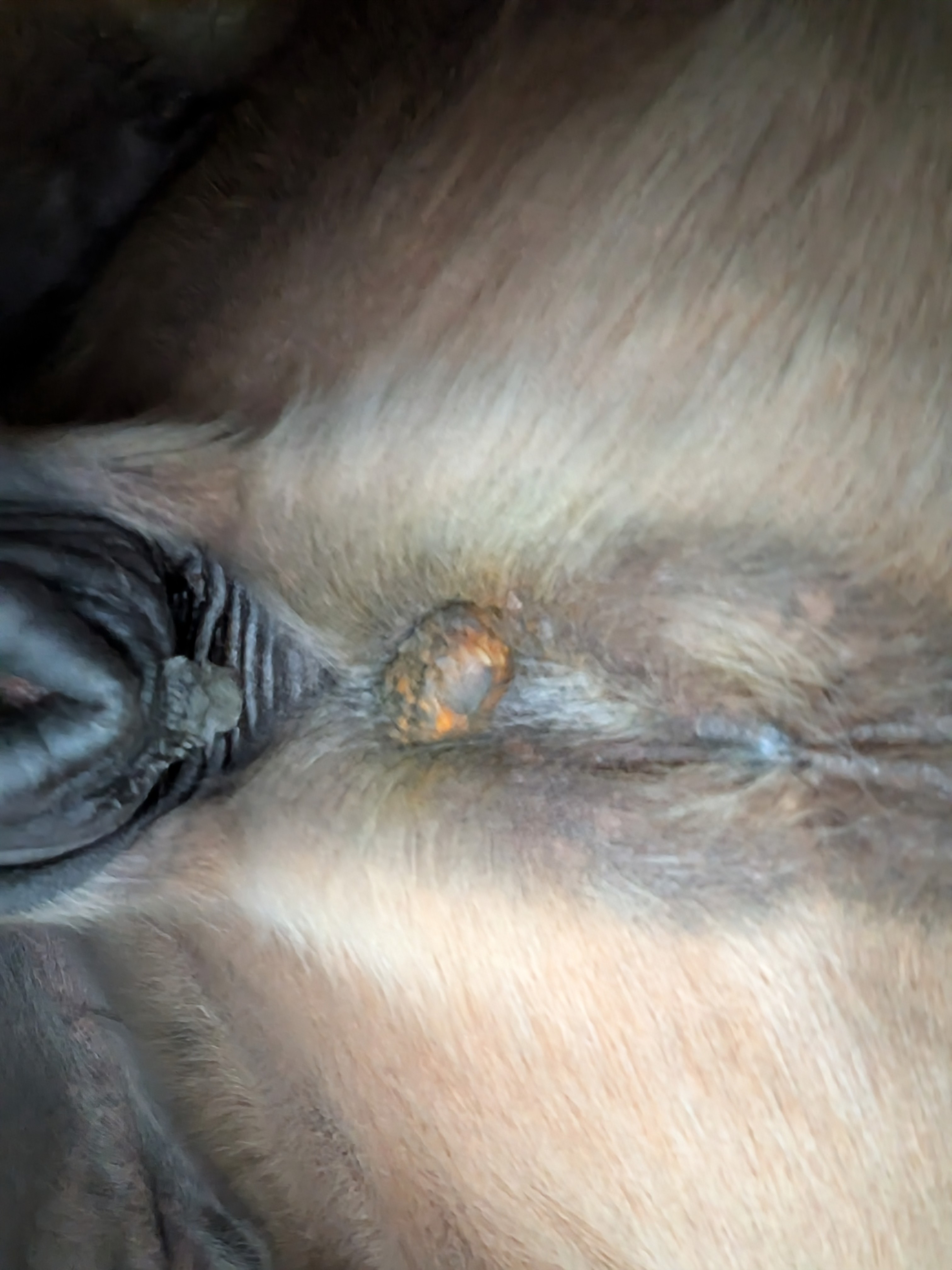 Das Sarkoid am Bauch hatte gestern sich lösende Krusten, unter der einen sah man was orangefarbenes, leider hatte ich das Handy vergessen