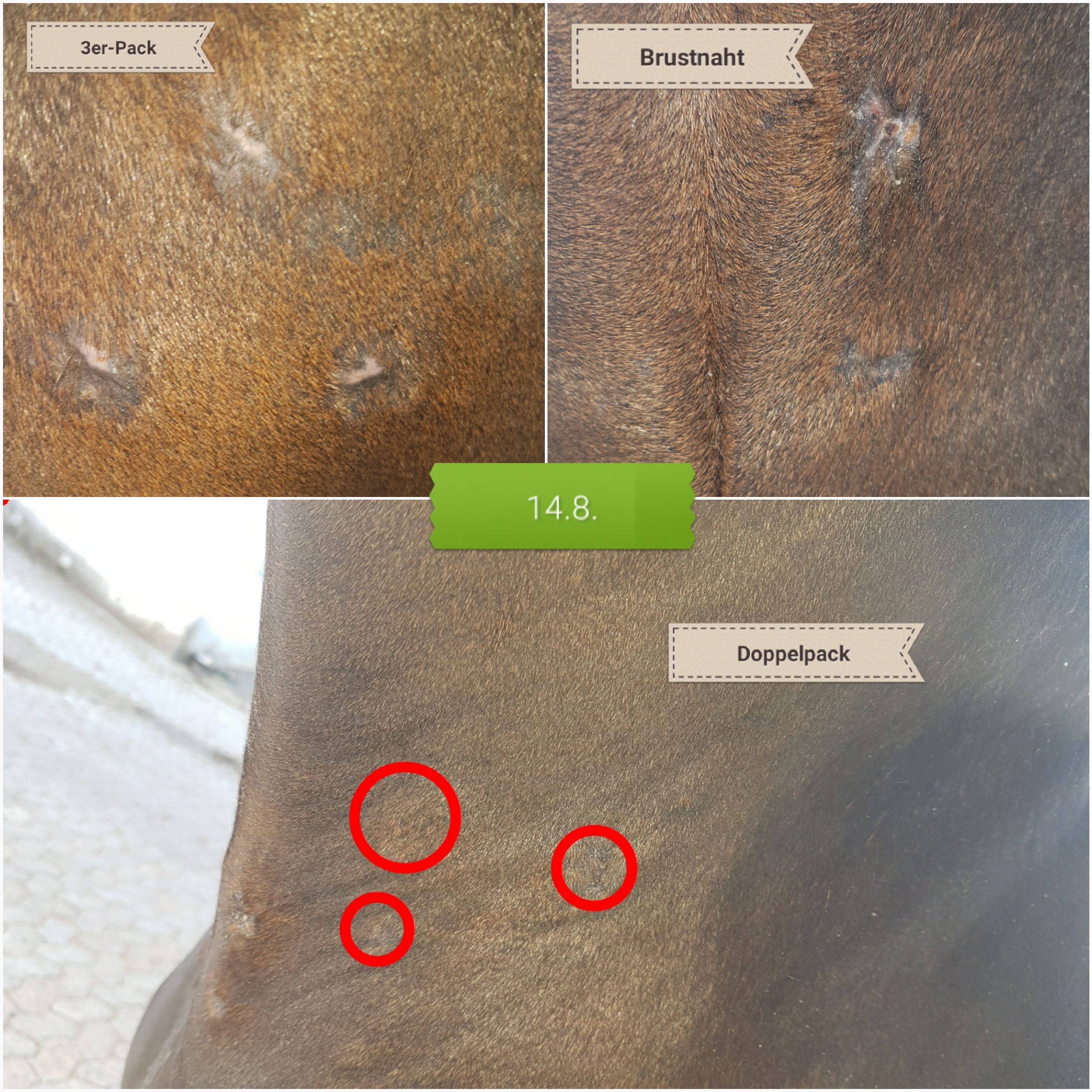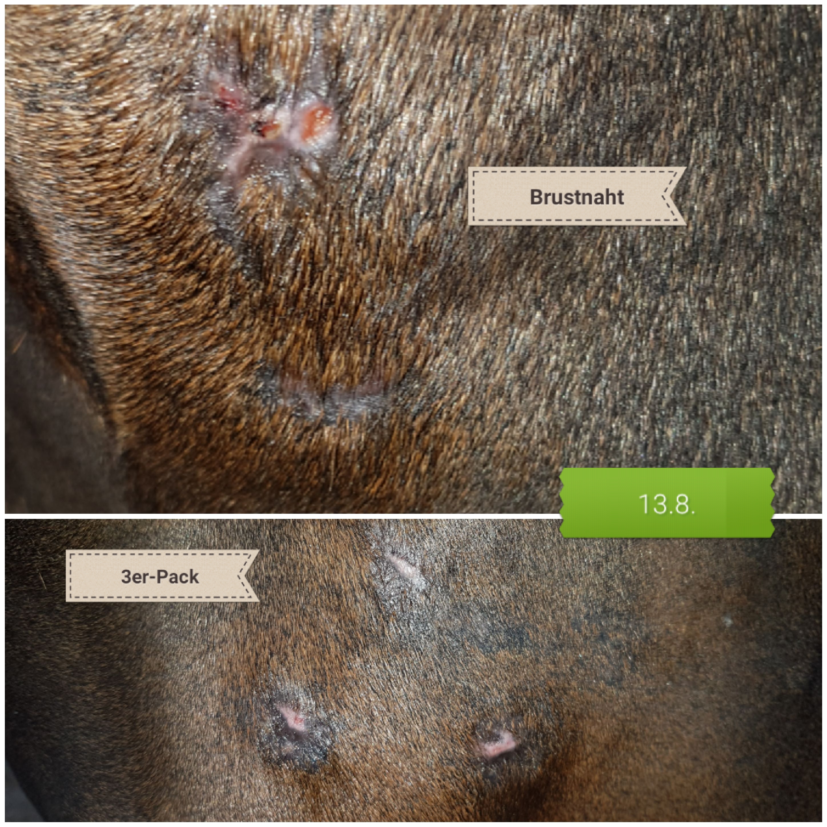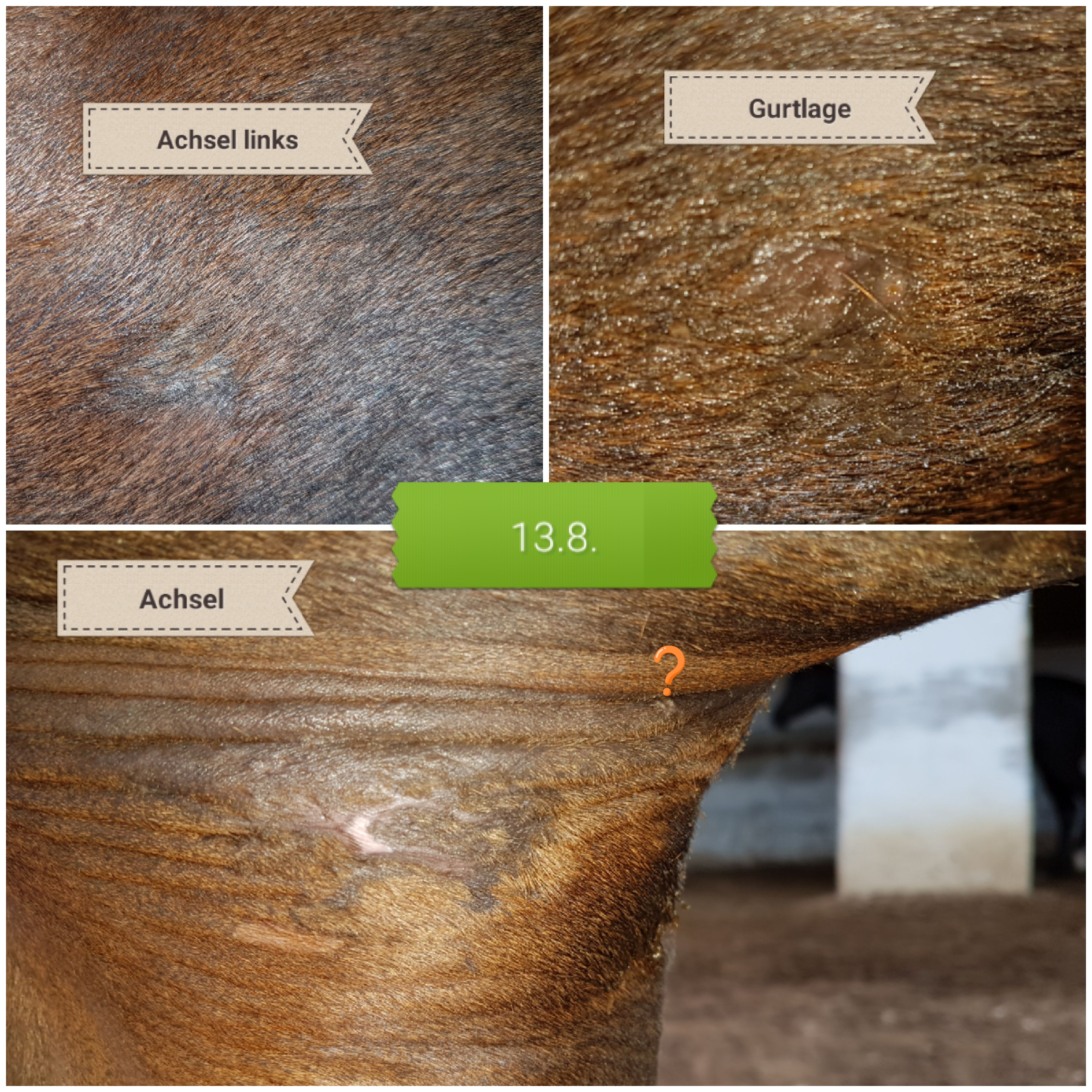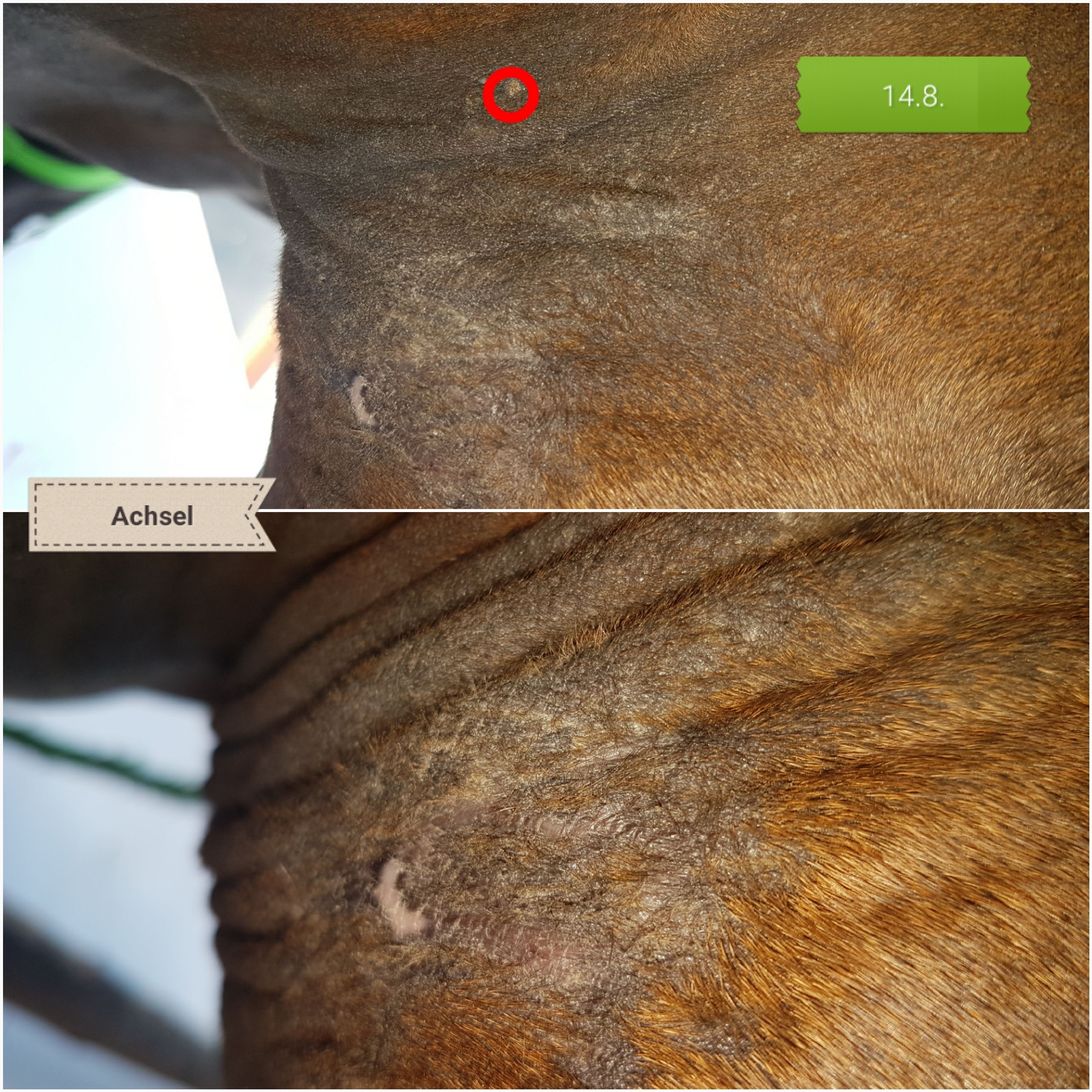 So, jetzt muss ich doch mal in die Runde fragen: die Sarkoide in Achsel und Gurtlage sehen täglich besser aus, aber unter dem Achselsarkoid und neu (?) auch hinter der Gurtlage sind so helle Stellen (grün eingekästelt). Hatte so was schon mal jemand? An der Achsel ist mir das schon länger aufgefallen, an der Gurtlage so richtig eigentlich erst heute. Was denkt Ihr, was das ist? Kennt das jemand? Vielleicht ist es ja ganz harmlos und eine Pigmentstörung, die man halt jetzt sieht, weil das Fell wegen der Schmiererei dünner ist. Keine Ahnung, ist mir nur aufgefallen. Was denkt Ihr?