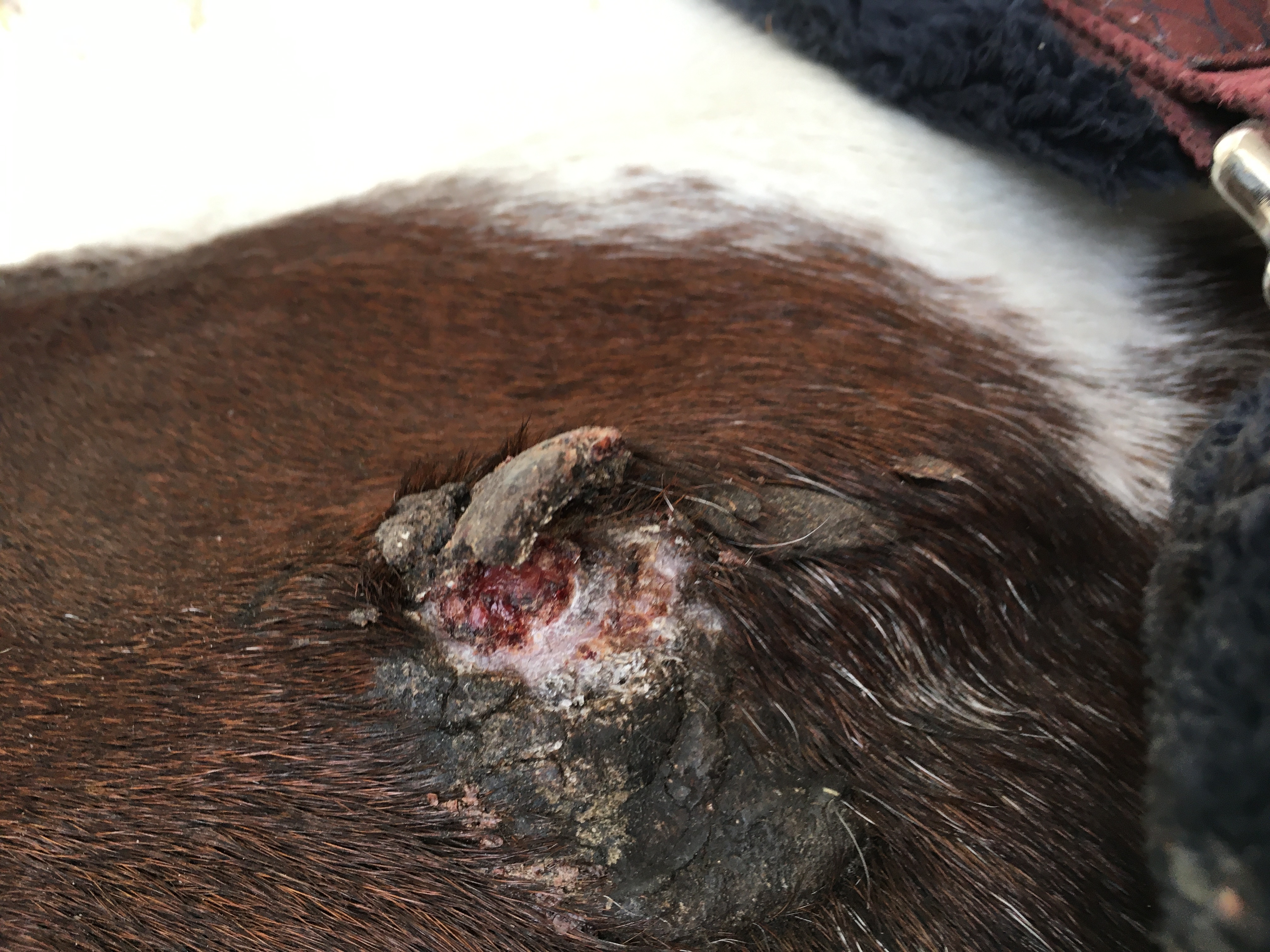 Hier ist ein Bild von heute. Die Kruste hat sich abgelöst und ich habe jetzt weiter auf die offene Stelle geschmiert. Es scheint ihn ganz schön zu jucken, er scheuert sich die xxterra direkt ab. Was mache ich mit dem Schorf an den Seiten, geht der von alleine weg irgendwann? Darauf geschmiert habe ich noch nie.