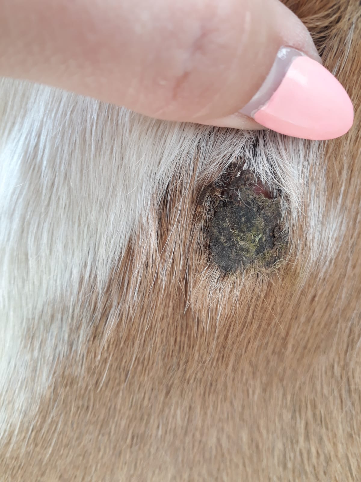 Vor ca 2,5 Monaten hatten wir dann eine ThP da wegen anderer Wehwehchen. Sie dachte ebenfalls das es sich um eine Bissverletzung handelt und so hatte er zwei Mal mehrere Wochen Akupunktur Pflastern drauf, tja seitdem hat sich ein Steg zwischen den beiden Punkten gebildet ( ich vermute die Pflaster haben ES geärgert) und ich bin leider relativ sicher, dass es sich um ES handelt. Hatte die THP dann auch vermutet.
