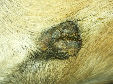 Nach ca 10 Tage ist der mittlere Teil des Sarkoids abgefallen, ringsum ist noch der Kranz mit den weiteren Sarkoidteilen vorhanden. Dort liegt die Kruste noch lose auf. Ich habe weitergeschmiert, die restliche Kruste ist abgefallen und mittlerweile hat sich über den ganzen Bereich eine neue, feste Kruste gebildet. Daher pausiere ich seit gestern und warte, das die Kruste sich löst. So wie es aktuell aussieht, bin ich ganz zufrieden. Ich bin gespannt, wie die restlichen Teile des Sarkoids reagieren.