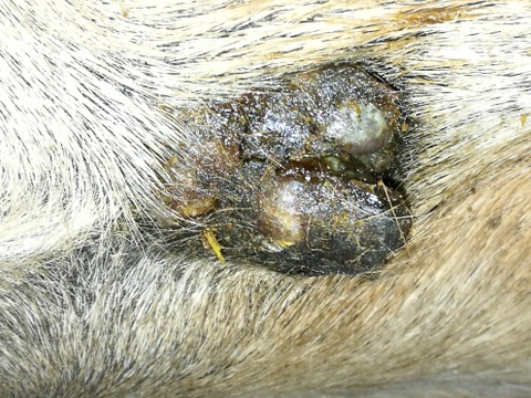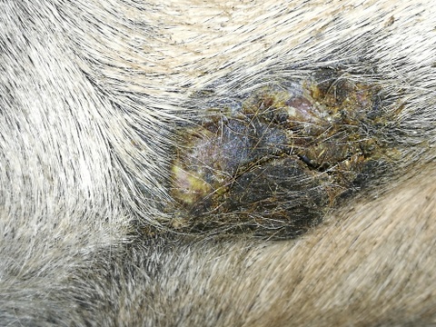 Auf dem Foto sieht es so aus, als ob euer ES dreigeteilt ist. Versuch auch etwas Salbe in die Zwischenräume zu bekommen.