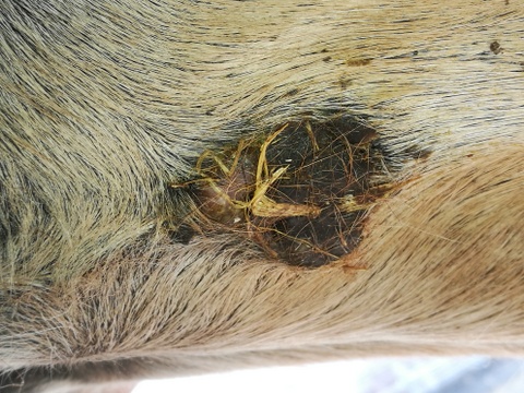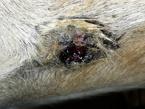 Da die Stelle in der Nähe des Euters liegt, würde ich wahrscheinlich beim ersten mal nicht pur schmieren sonder auch da schon auf 1:1 verdünnen. Die langen Winterhaare rundum muss ich vorher noch abschneiden, das verklebt wahrscheinlich zu sehr.