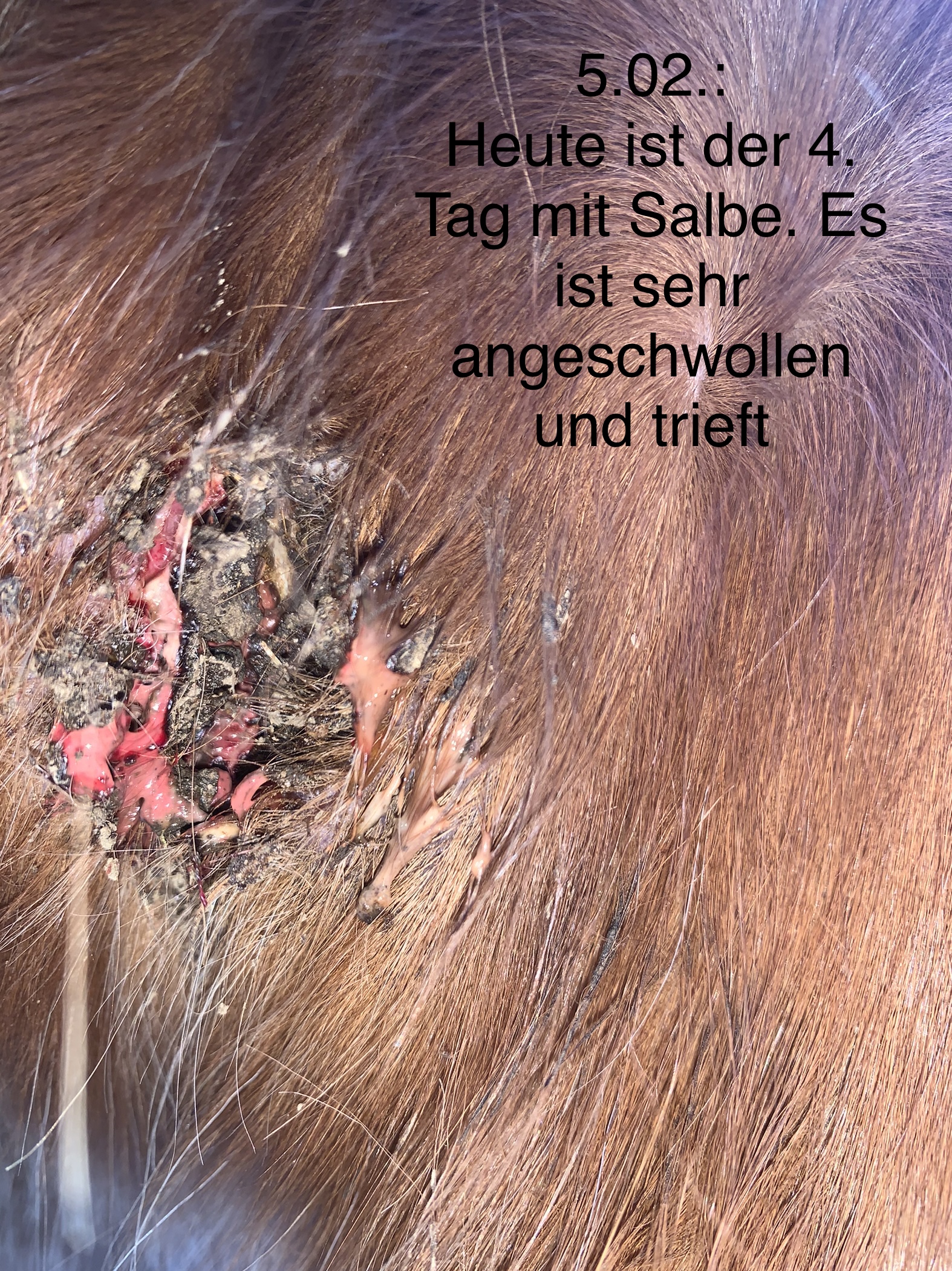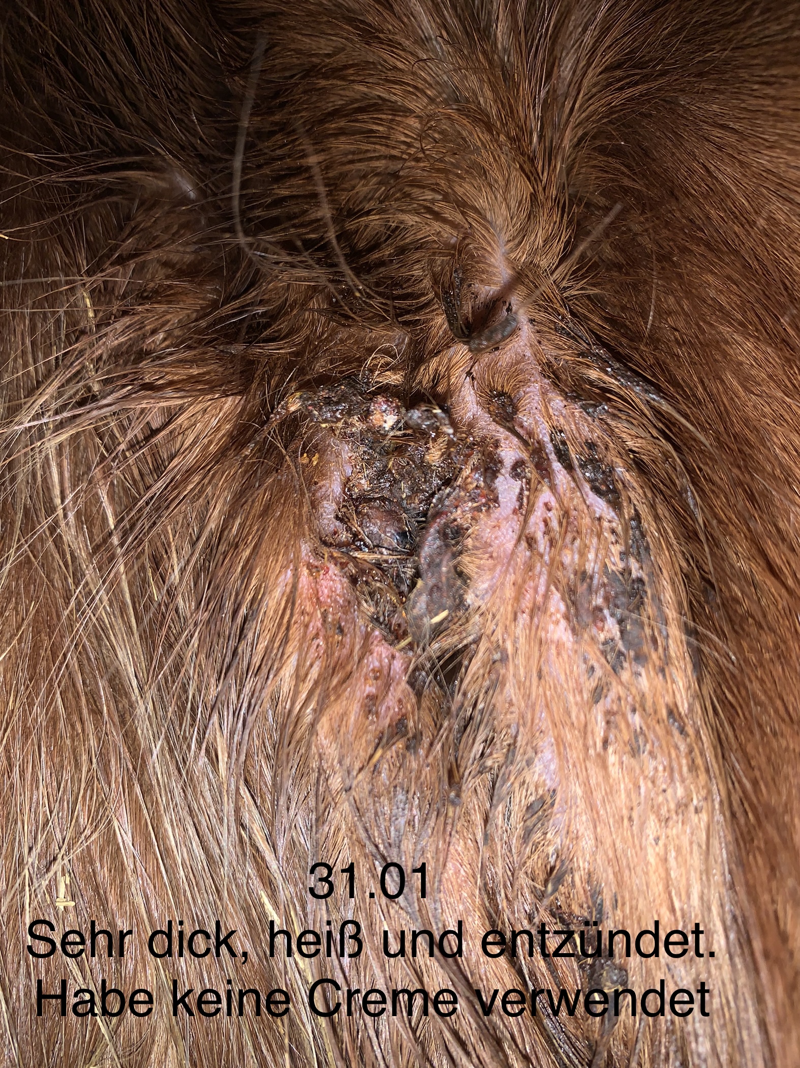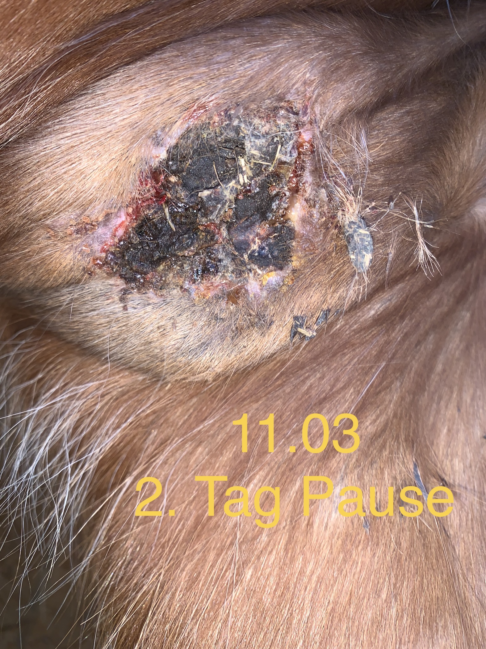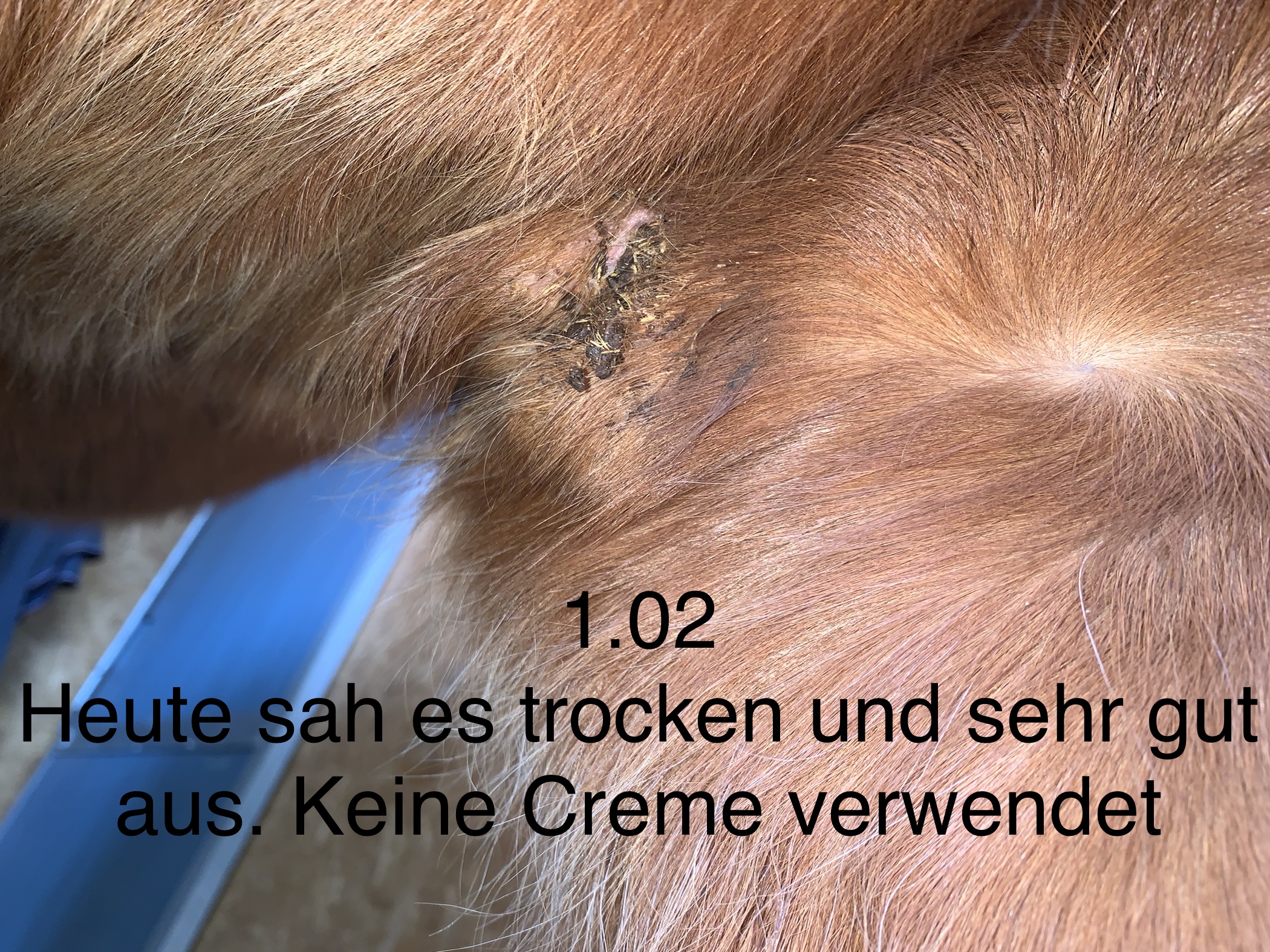 Als er dann am 13.01.2021 zu mir kam (aus Ungarn) fiel mir auf, dass die Warze zwar weg war, aber die Stelle nicht verheilt war. Da dachte ich mir gleich --> das muss ein Sarkoid sein.