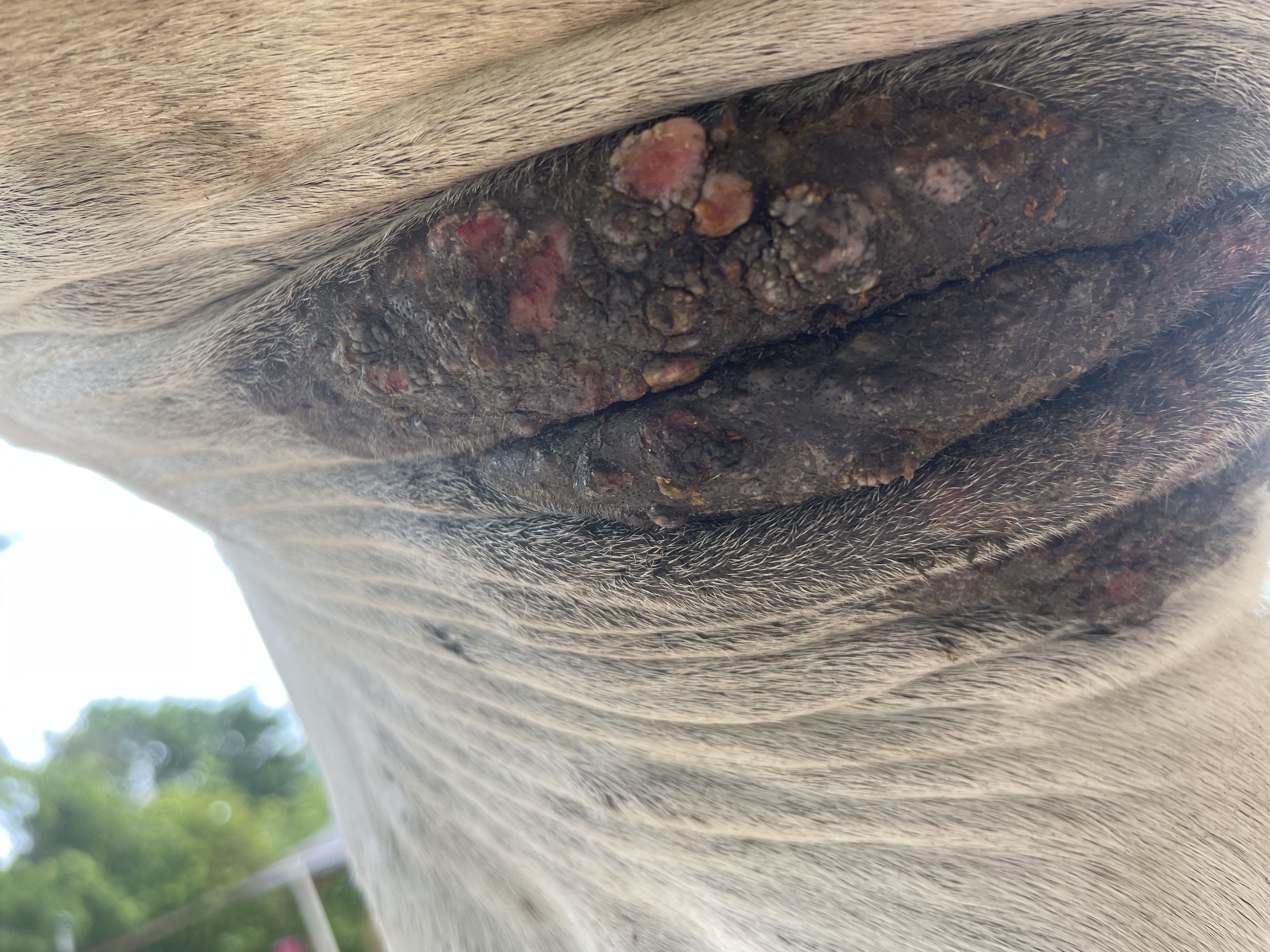 Meine Stute Bohemia (13) leidet ebenfalls an einem ES, leider genau vorne in der Beuge. Eine sehr unvorteilhafte Stelle.