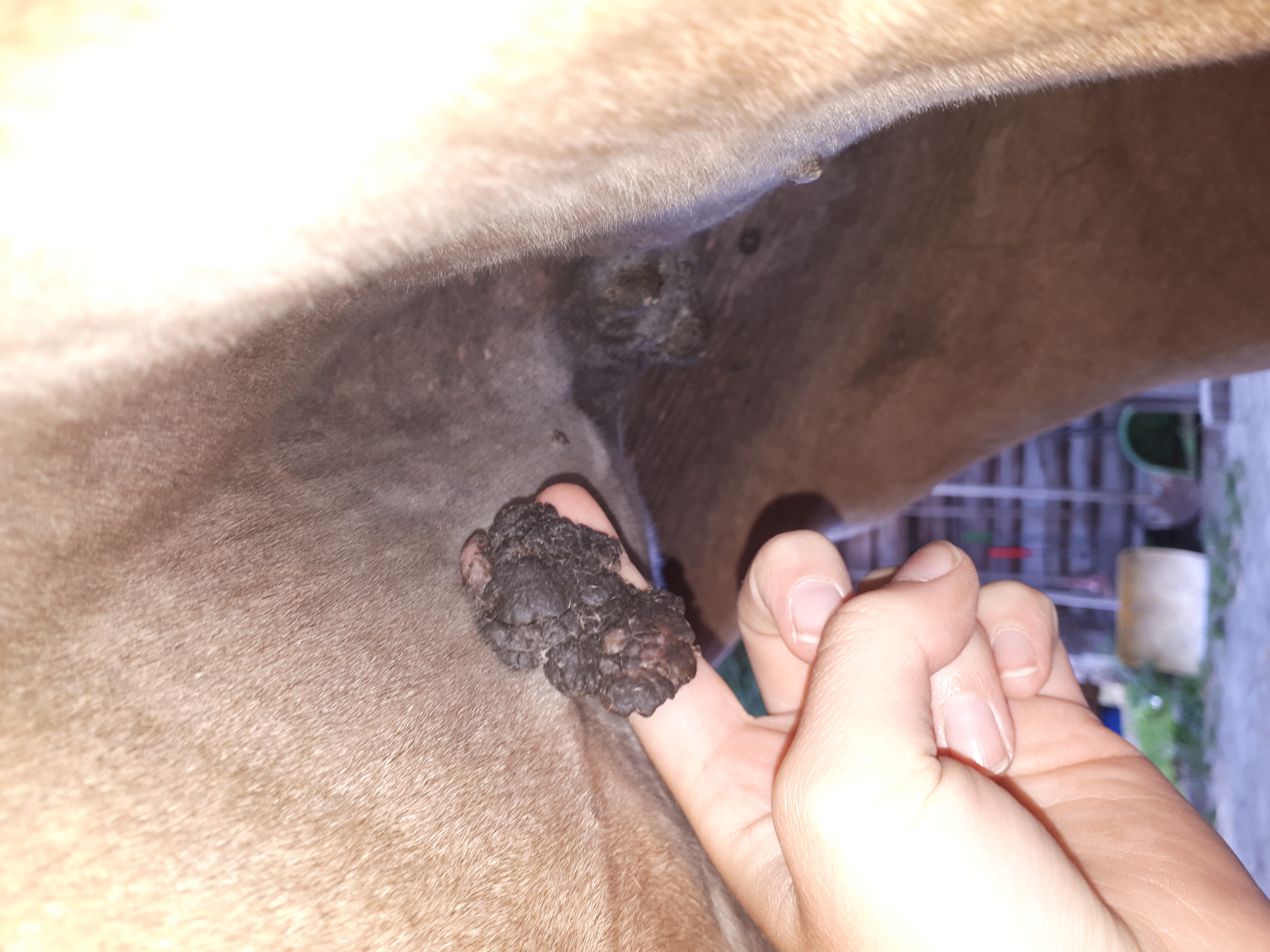 das Gewächs ist im letzten Jahr entstanden. Es ist nur zu etwa einem Drittel angewachsen, vergrößert sich nicht mehr. Glatte, schwarze Oberfläche, von der immer wieder ein kleines Stück abbröckelt, darunter ist wildes Fleisch, keine offene Wunde. Insgesamt ist es kein geschlossene Fläche, sondern wie durch Furchen zerteilt in verschiedene Abschnitte.