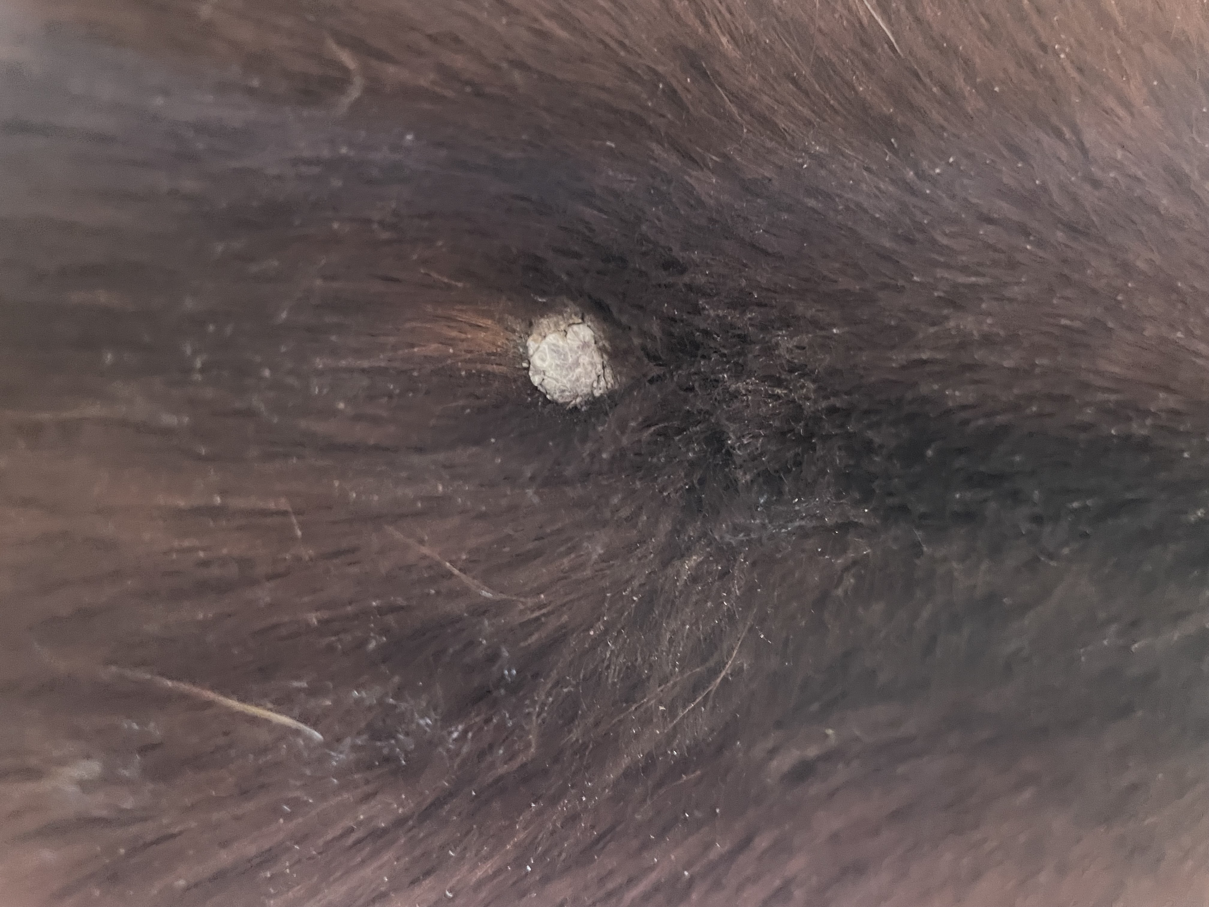 Bisher haben wir das Sarkoid weitestgehend in Ruhe gelassen, es jedoch im April 2022, als es tropfenförmig wuchs, einmal abgebunden. Dann war recht lange Ruhe und mein Tierarzt hat mir geraten, es in Ruhe zu lassen, solange es trocken und friedlich ist.