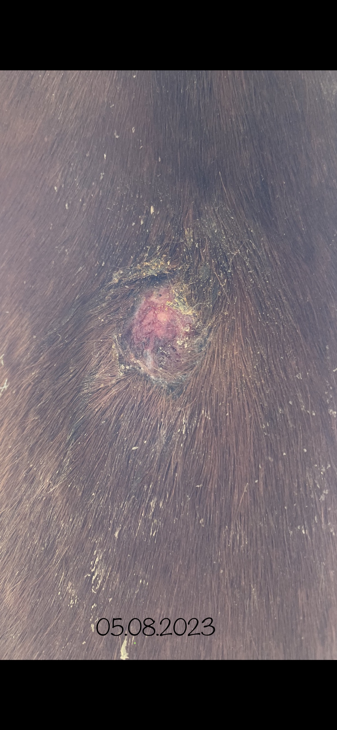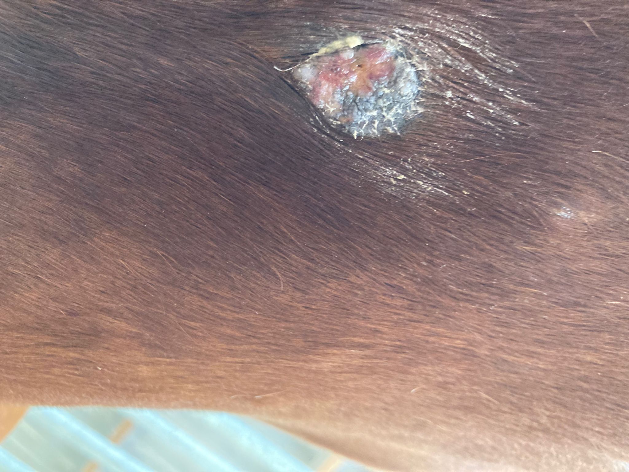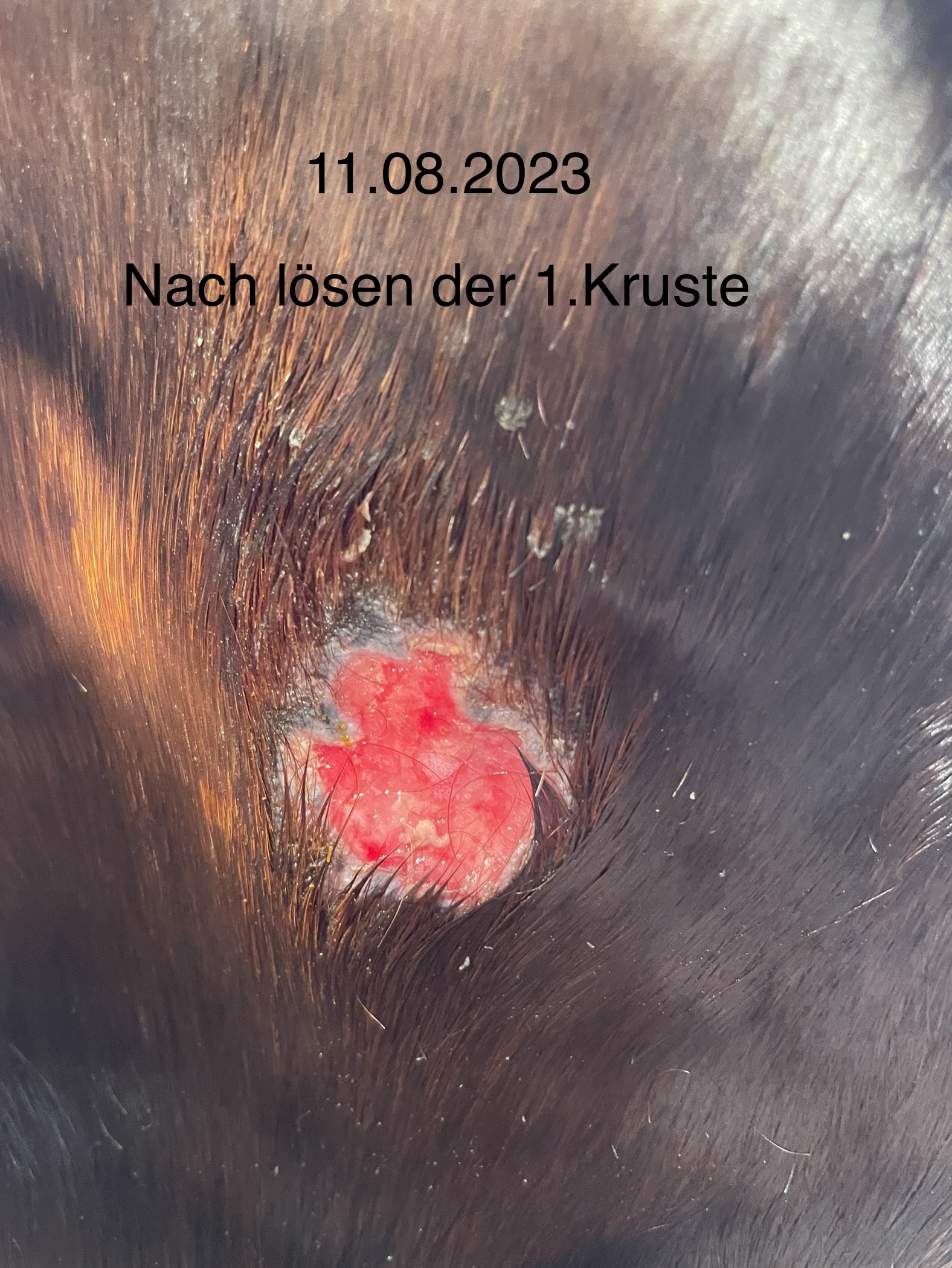 Nun zu unserem Sarkoid in der Gurtlage. Ich habe noch einmal zwei Fotos, das letzte ist aktuell von gestern. Gerade löst sich das zweite Mal die Kruste. Das andere Bild ist nach dem Lösen der ersten Kruste entstanden. Hier war ich eigentlich schon recht positiv gestimmt. Sieht für mich am Rand auch schon nach "gesundem Gewebe" aus. Wir haben immer mal wieder eine deutliche Schwellung, dann pausiere ich mit dem salben, bis die Schwellung weg ist und dann geht es weiter. Das zweite Sarkoid ist hinten, kurz vor der Schlauchtasche. Zunächst als ziemlich flaches Plattensarkoid, hat die Salbe doch scheinbar einiges noch ans Tageslicht befördert und das Sarkoid erst einmal deutlich vergrößert. Gestern war dann hier das erste mal eine deutliche Schwellung zu erkennen. Auch hier bin ich eigentlich zufrieden, auch wenn es scheint unter der Kruste zu arbeiten. Bekomme das 2. Bild leider nicht gedreht. Im Original ist es richtig herum, die Schwellung ist aber dennoch zu sehen. Was meint ihr? Läuft alles planmäßig? Ich bin immer mal recht unsicher, lese dann hier immer wieder nach und scheine korrekt vorzugehen.