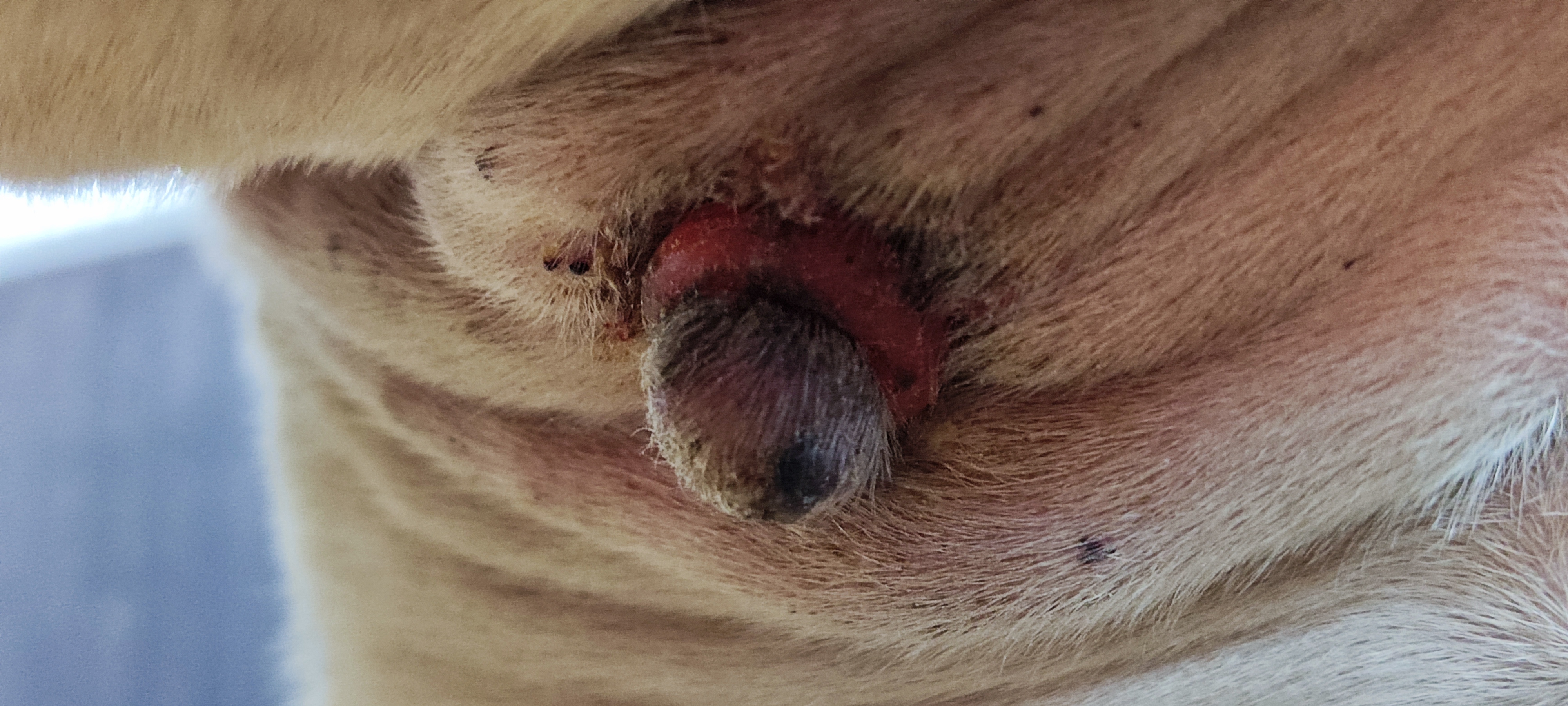 Am 06.10.2023 ist das Sarkoid dann abgefallen und wir cremen fleißig weiter. Den Bereich um das Sarkoid creme ich immer vorher zum Schutz mit Vaseline ein. Könnt Ihr mal drauf schauen, ob die Behandlung so richtig ist und wirkt, bzw. ab wann ich ggfs. mal Pause mit dem eincremen machen soll?