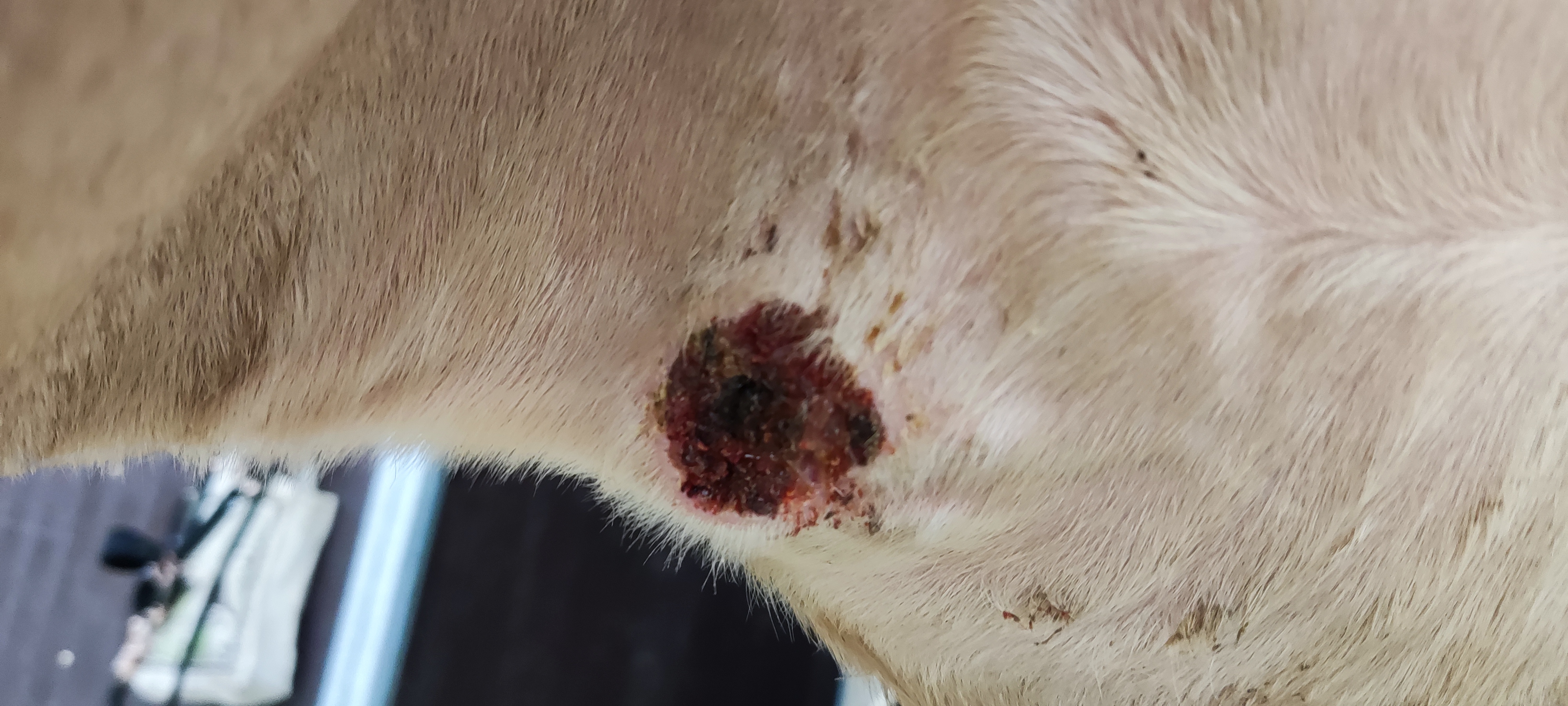 Es bilden sich immer wieder neue Krusten, die dann wieder abfallen, aber die Stelle ist unter der Haut immer wieder recht geschwollen und es wird auch nicht wirklich kleiner, geschweige denn das wir das Gefühl haben dass es zu heilt.