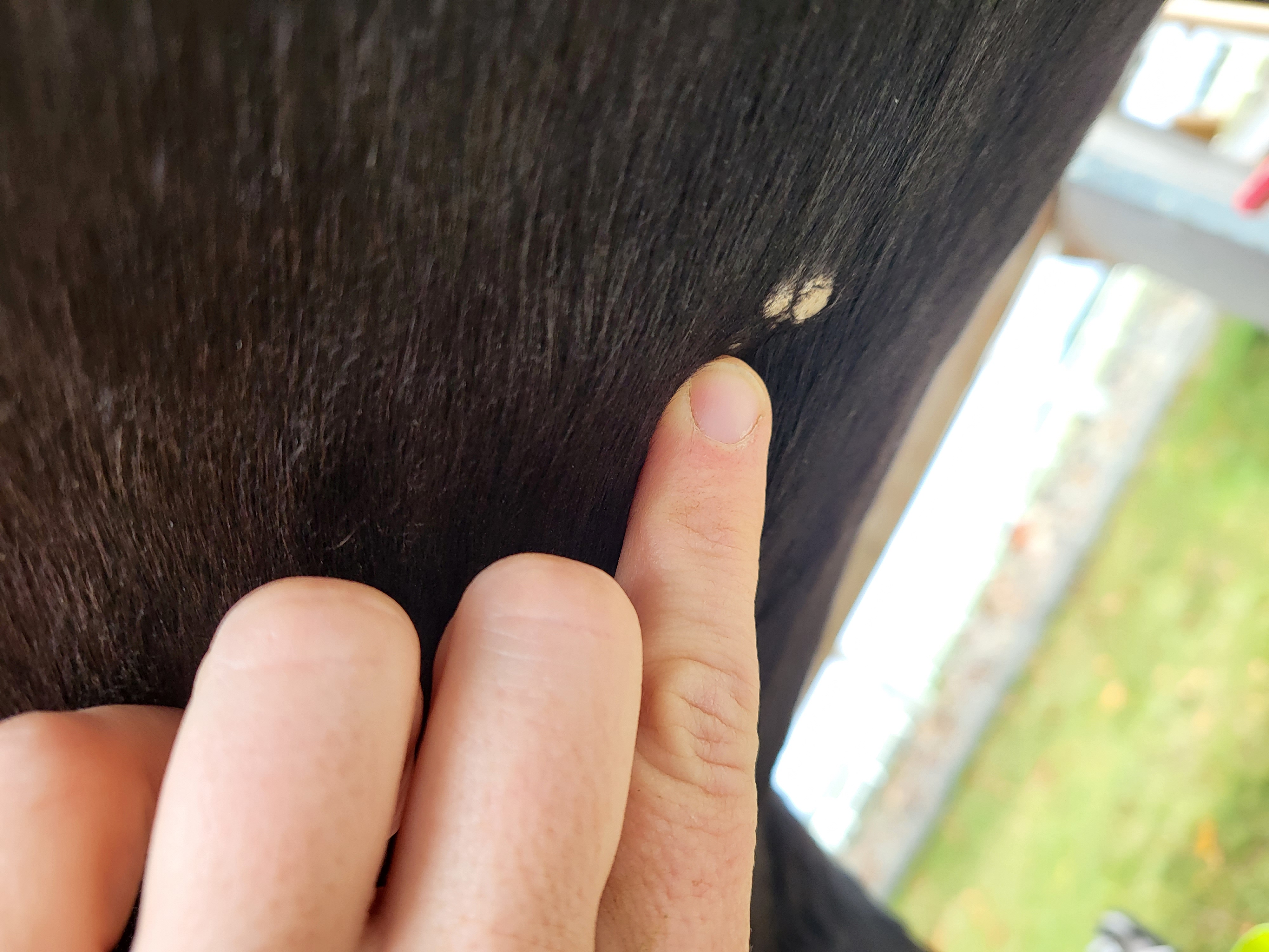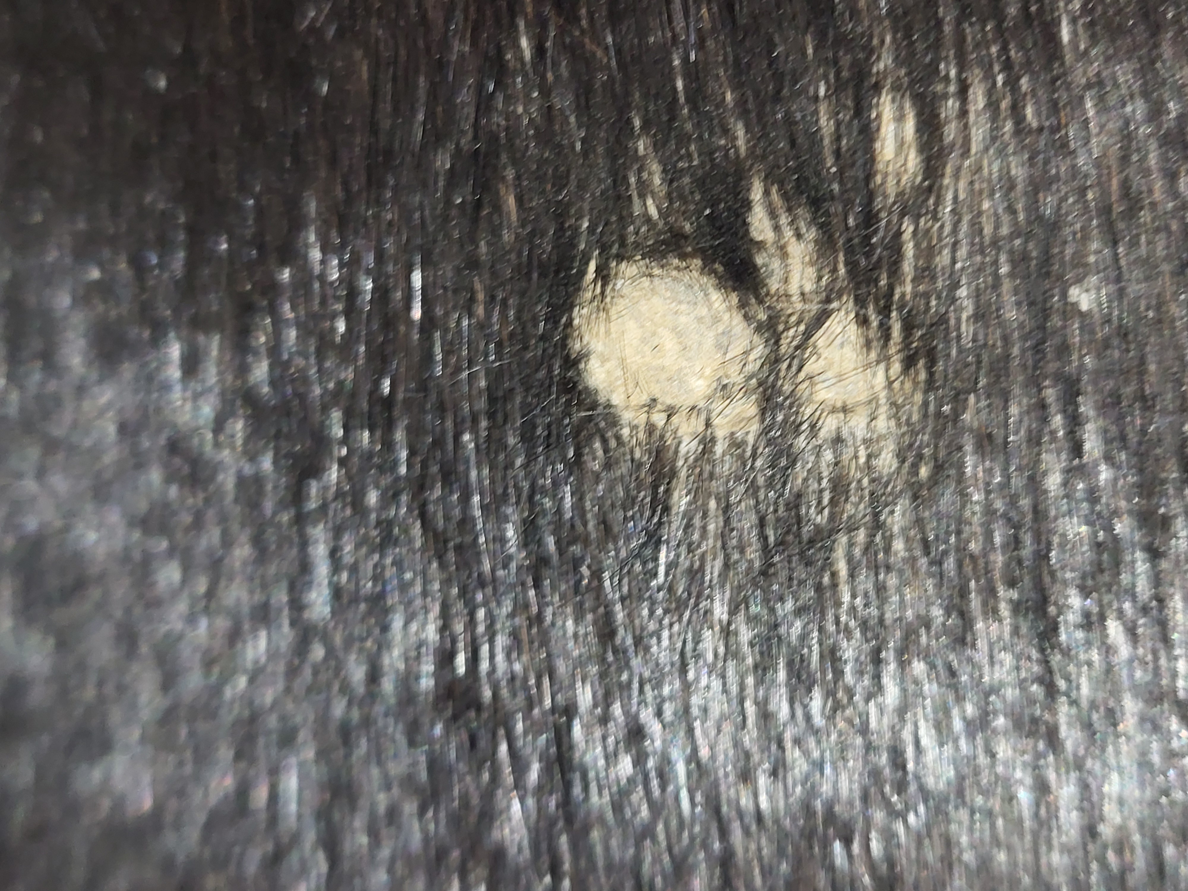 Das Sarkoid ist noch recht klein, allerdings versteckt sich noch ein "Knubbelchen" unter dem Fell (geht quasi fast bis zu meinem Finger).