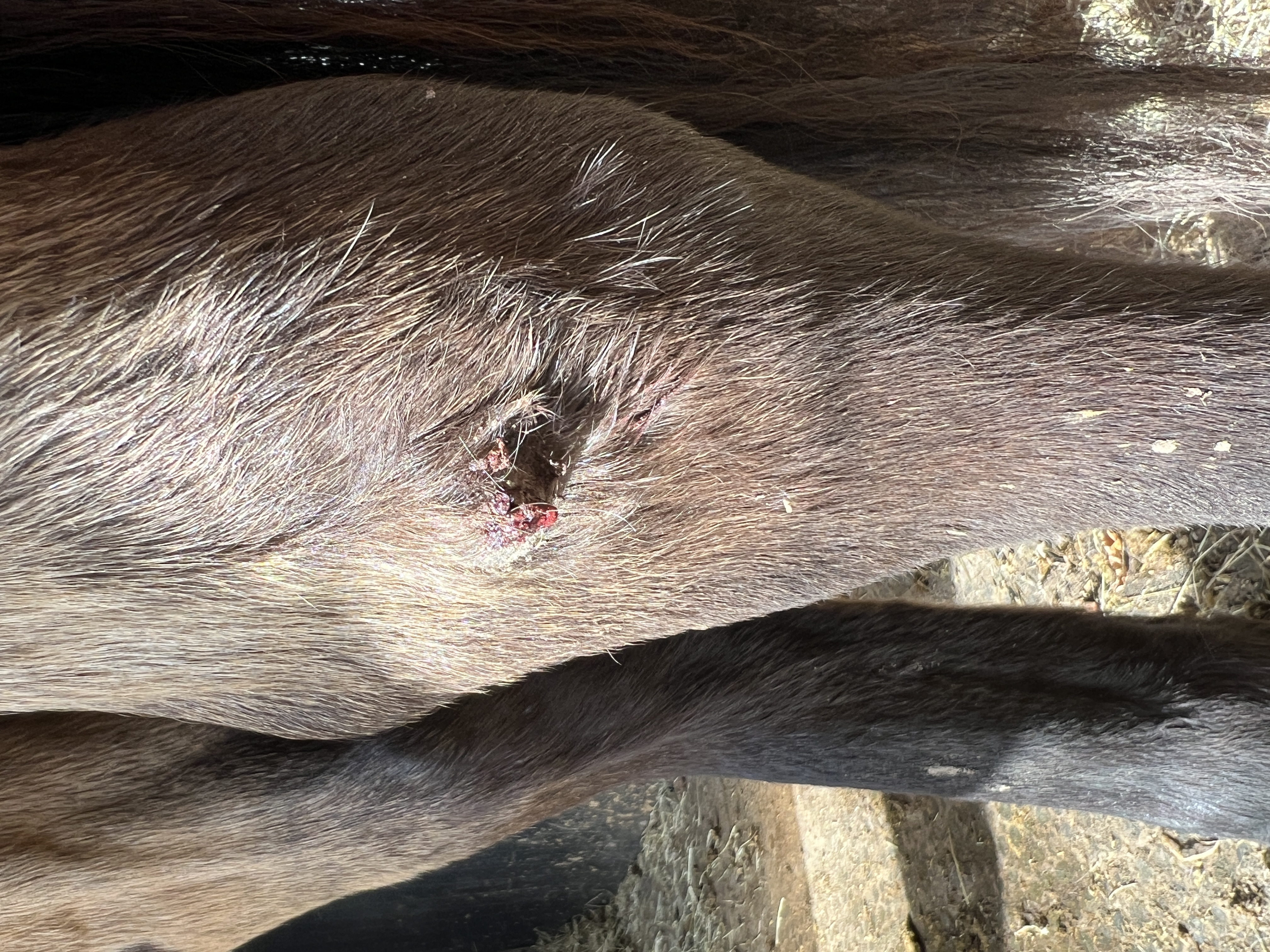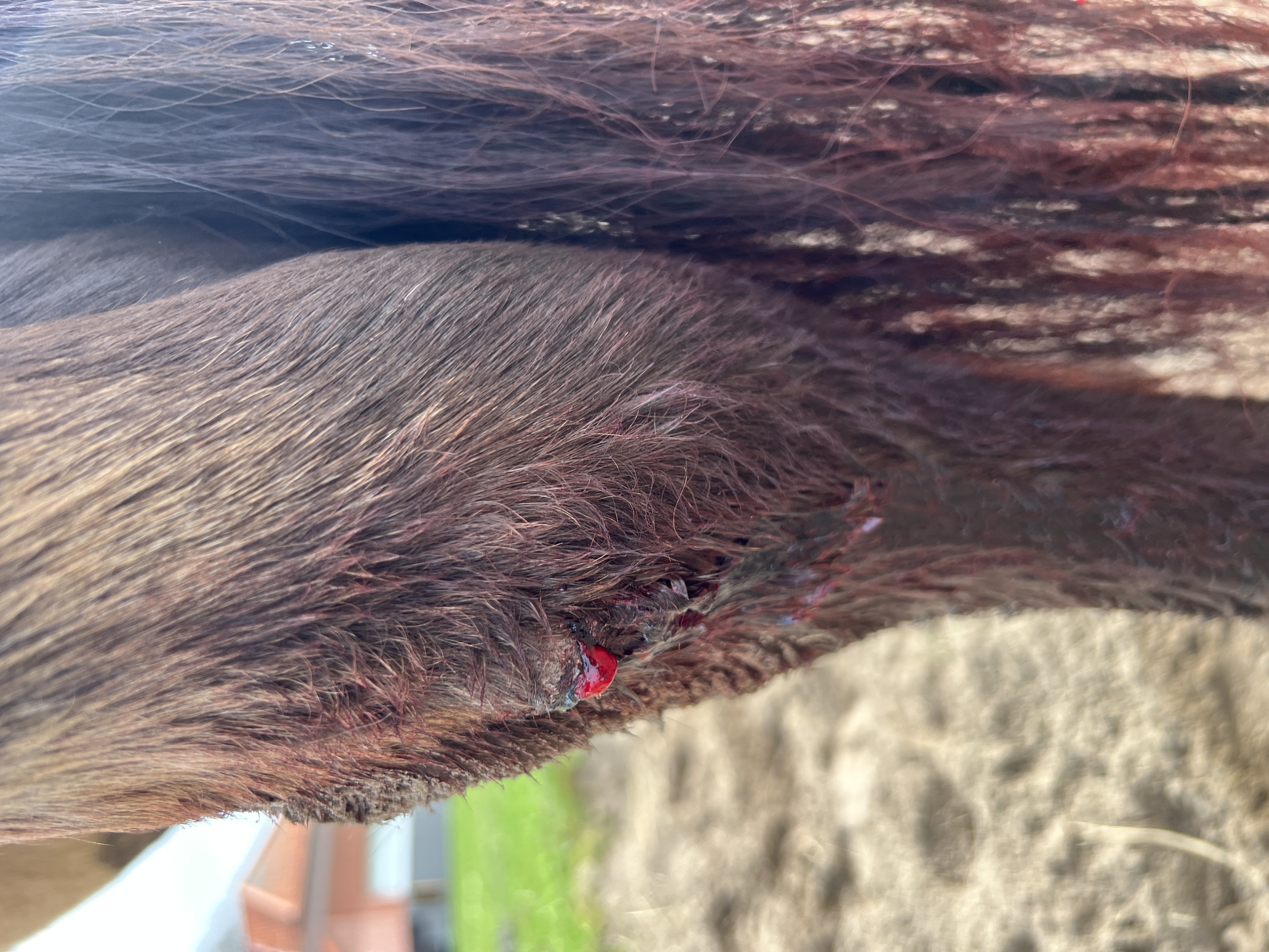 Dermequin war jetzt doch nicht auf Lager in der Klinik. Das Sarkoid hat Sonntag sehr stark geblutet und sieht jetzt deutlich kleiner aus. Vielleicht sogar die Hälfte.