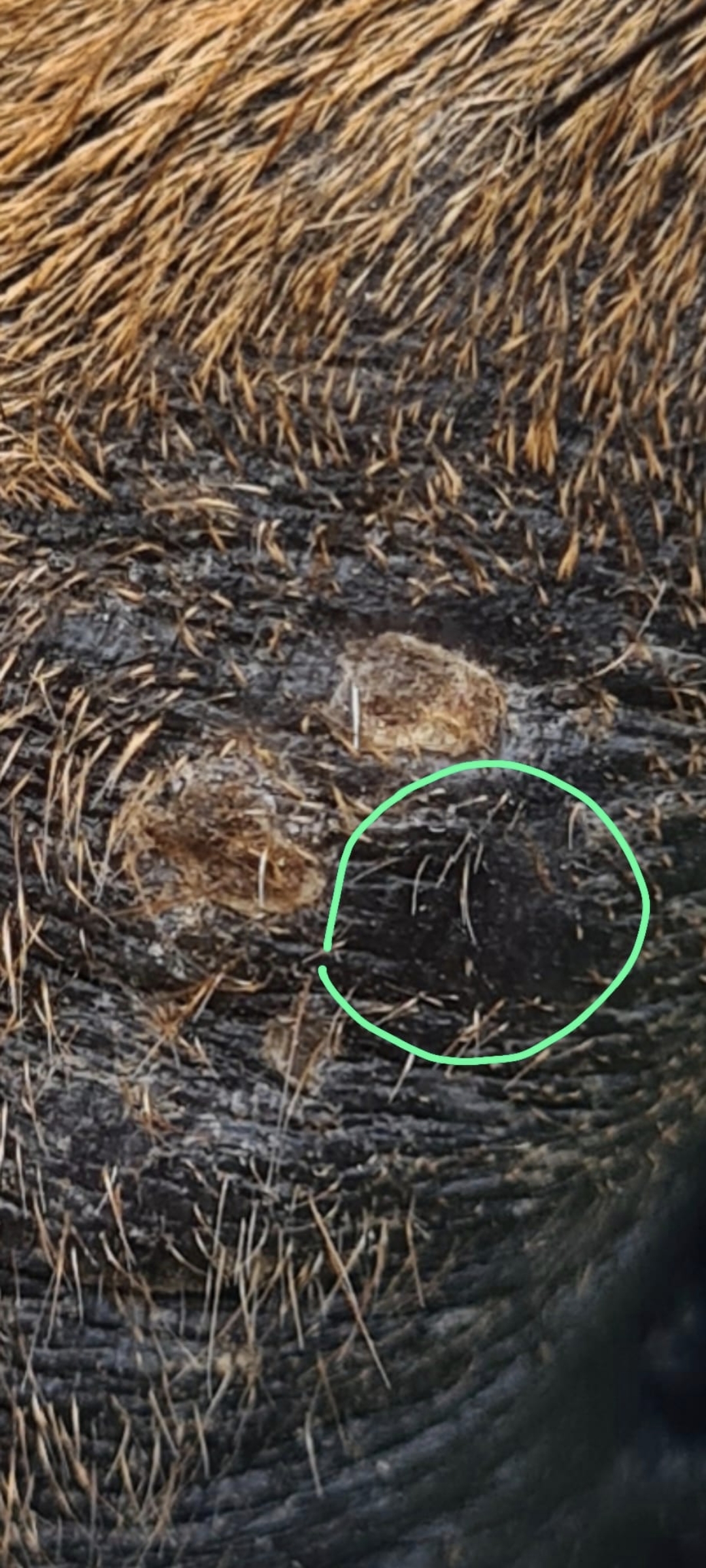 Im Detailbild steht man auch gut die veränderte (dunklere) Hautfarbe auf dem Knubbel, hier wachsen auch keine Haare.