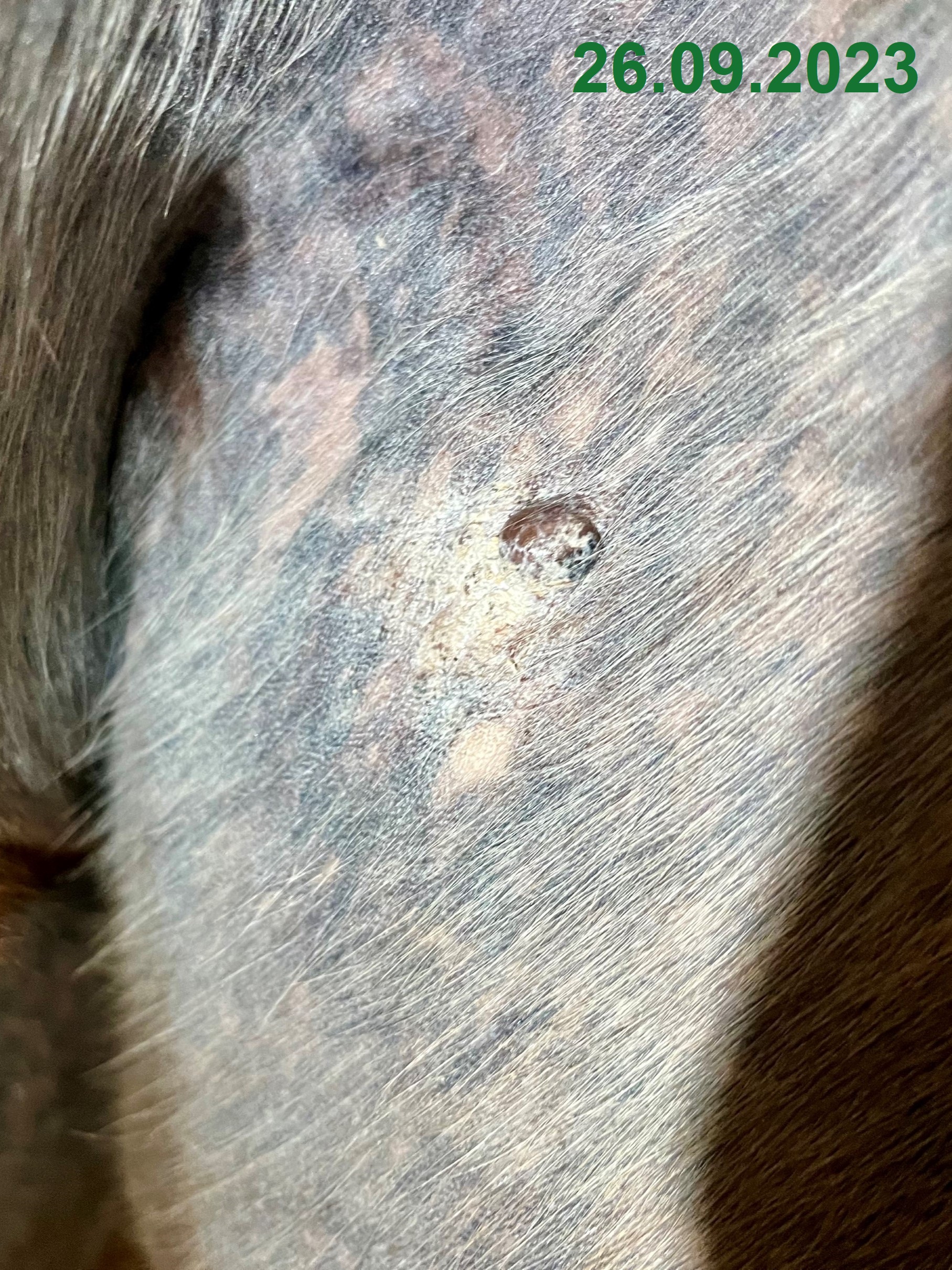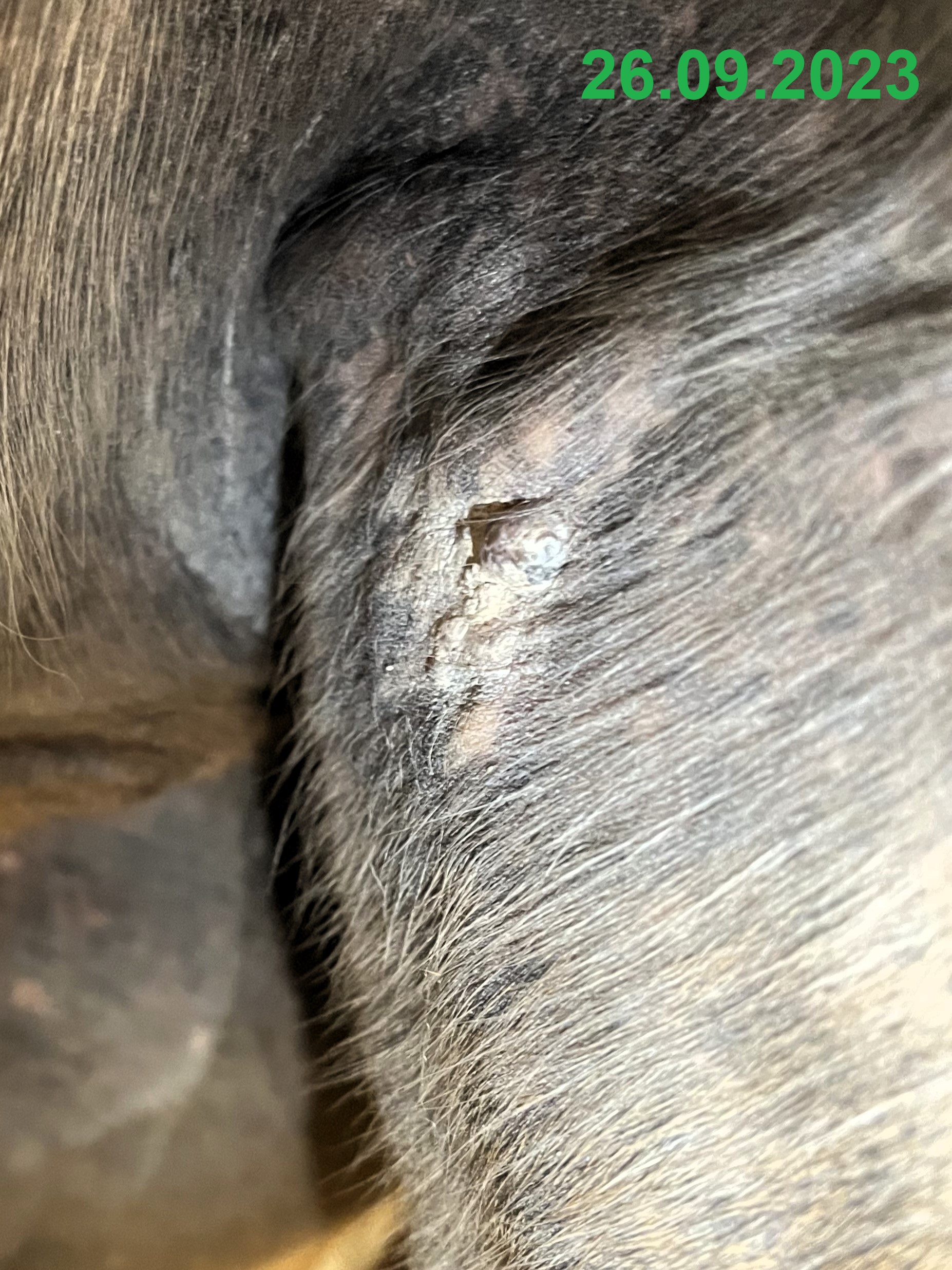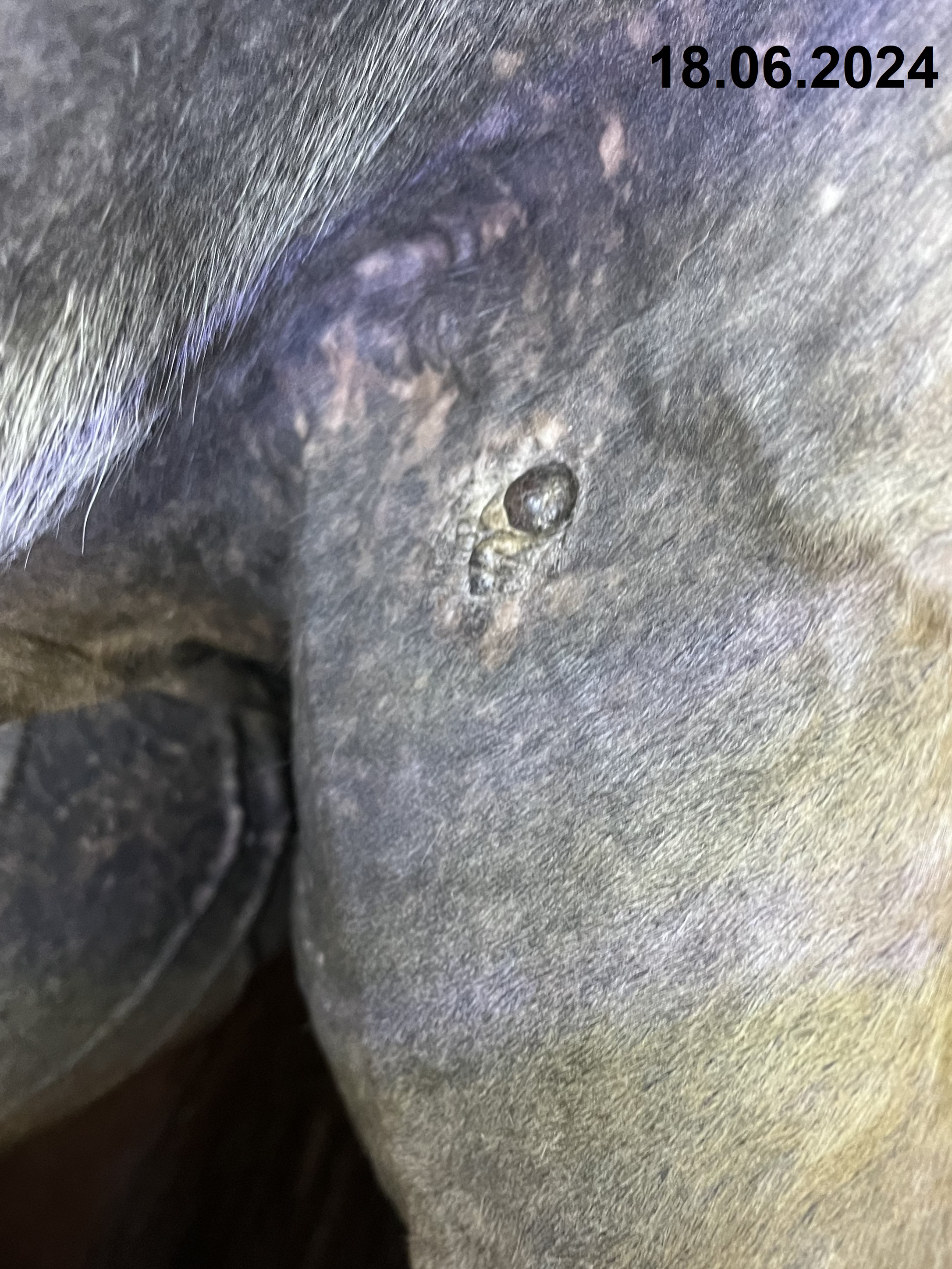 Im September 2023 fiel uns dann das erste Mal eine merkwürdig verhornte Hautstelle mit einem knapp erbsengroßen warzenartigen Knubbel ziemlich weit oben am linken Innenschenkel auf und bei genauerer Betrachtung war sofort klar, dass es sich um ein equines Sarkoid handelt.