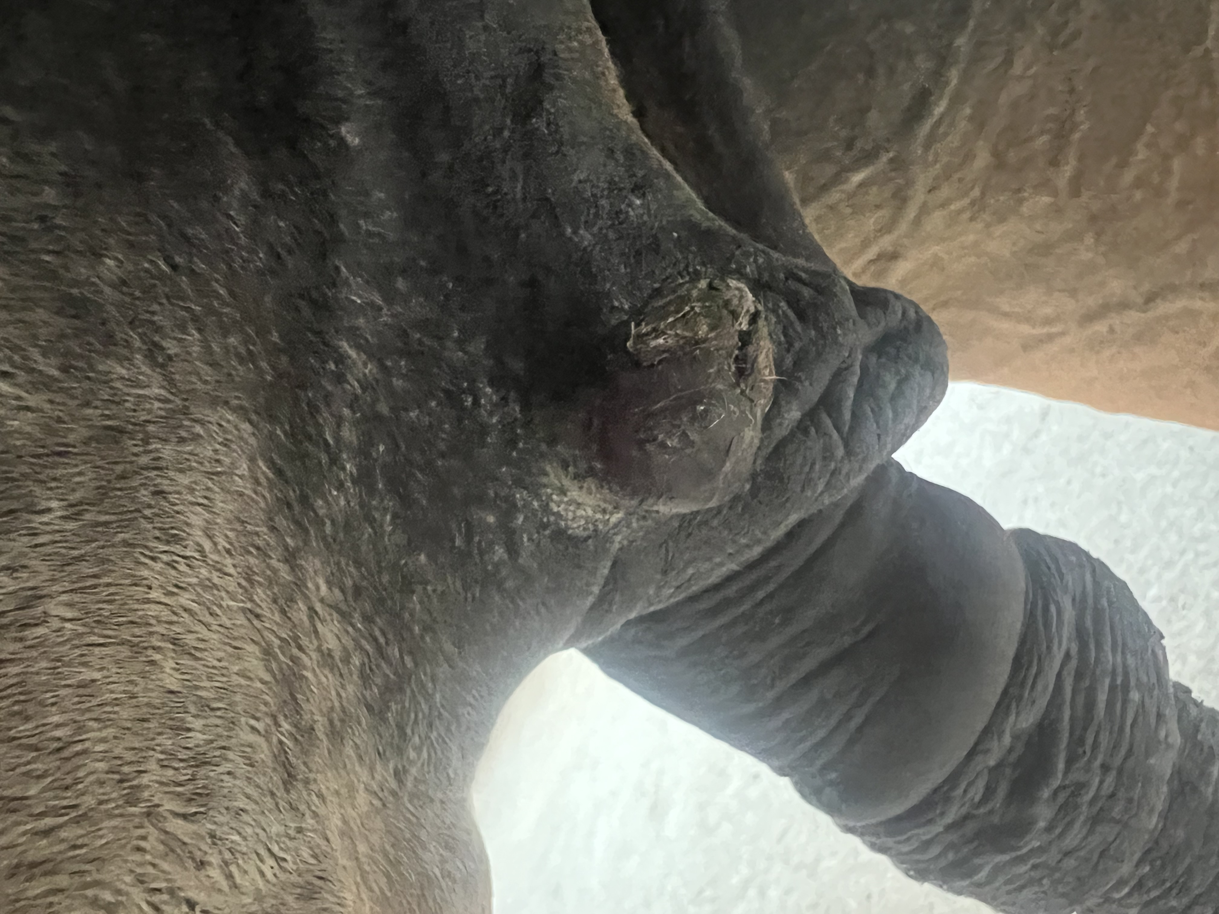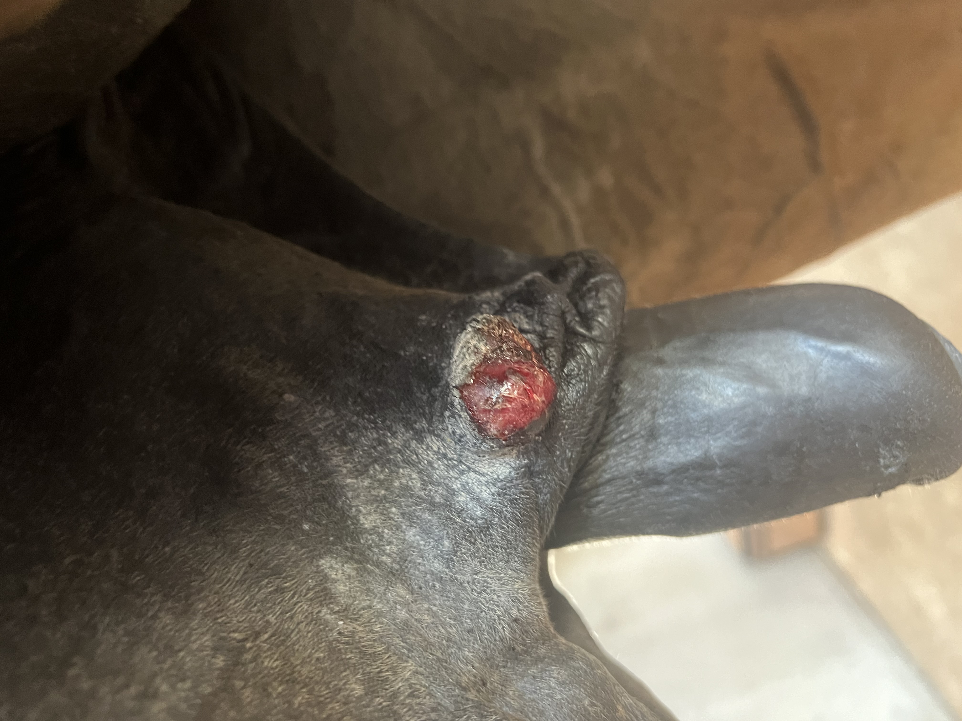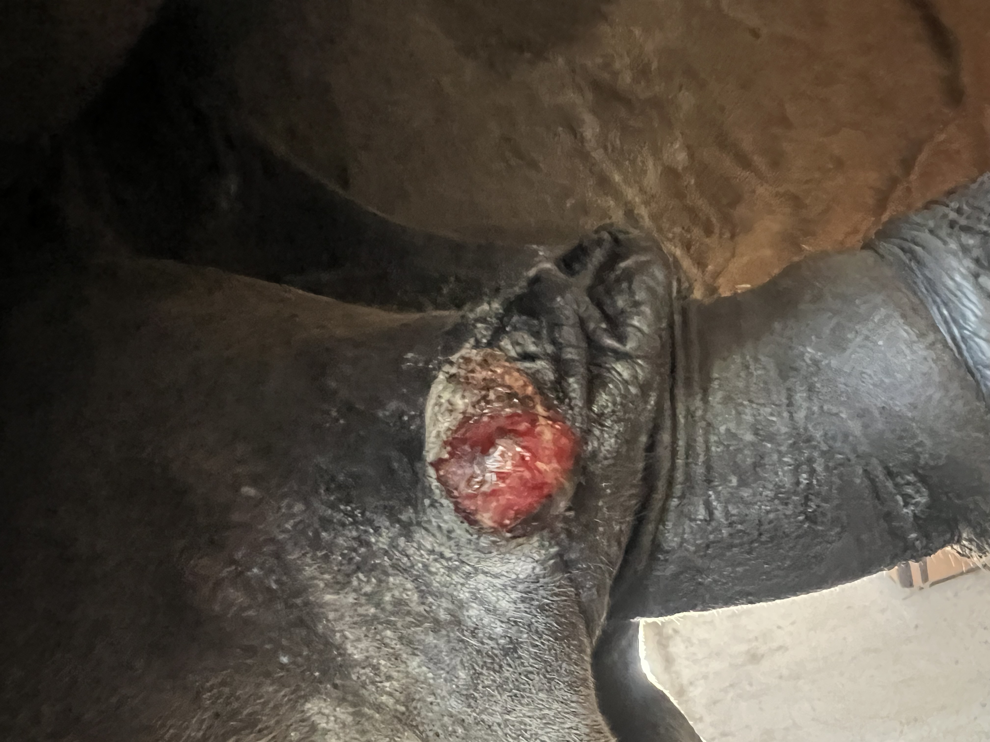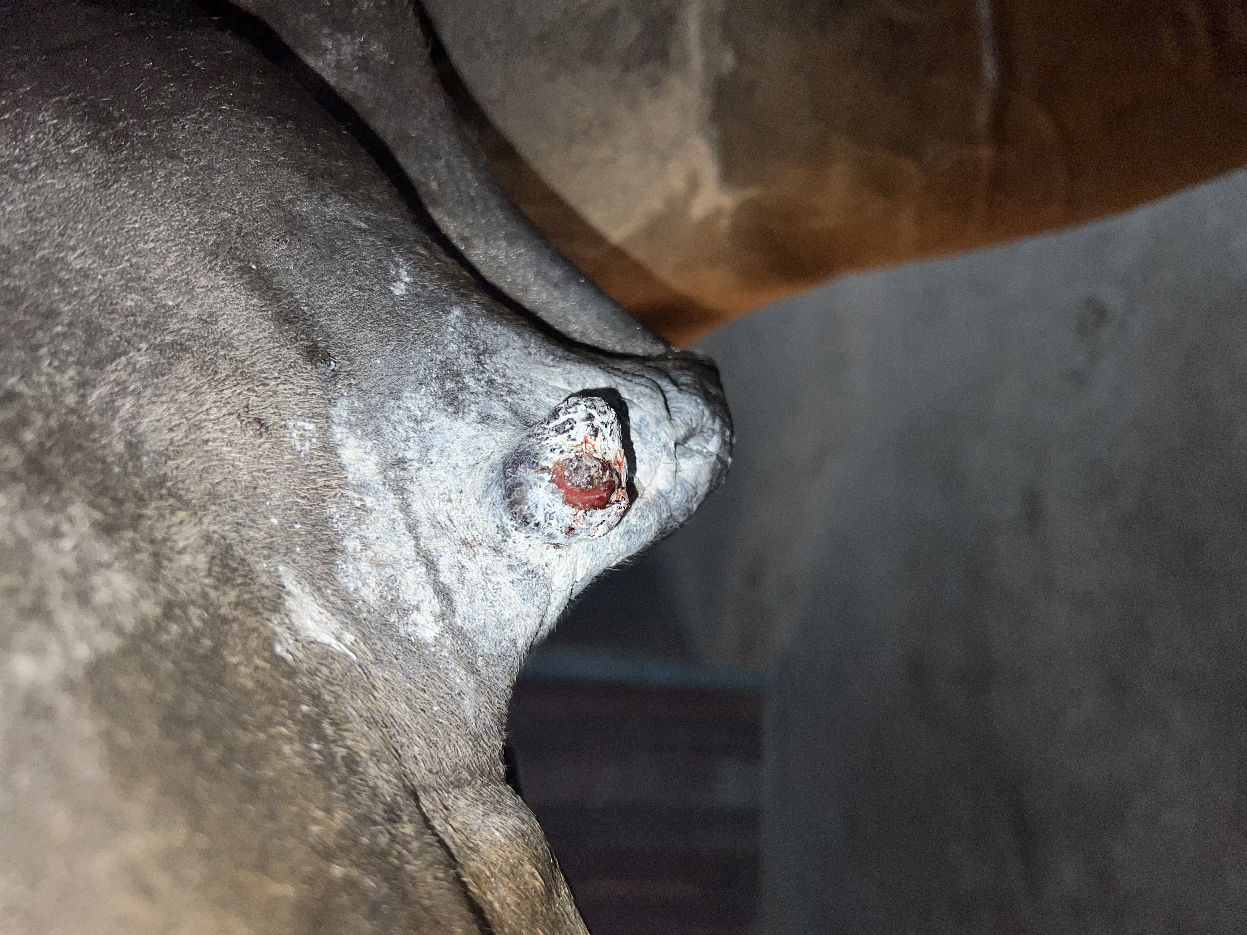 Nach 1-2 Monaten im Aktivstall konnte ich die Veränderung an der linken Seite der Schlauchtasche feststellen, dachte aber zuerst an einen Stich oder Ähnliches. Nach weiteren Monaten wurde es jedoch langsam größer. Der Tierarzt sagte damals zu mir, dass es sich dabei um eine Warze bzw um ein Sarkoid handelt. Dies würde irgendwann einfach abfallen oder man könnte es entfernen lassen, was für ihn jedoch nicht vonnöten war.