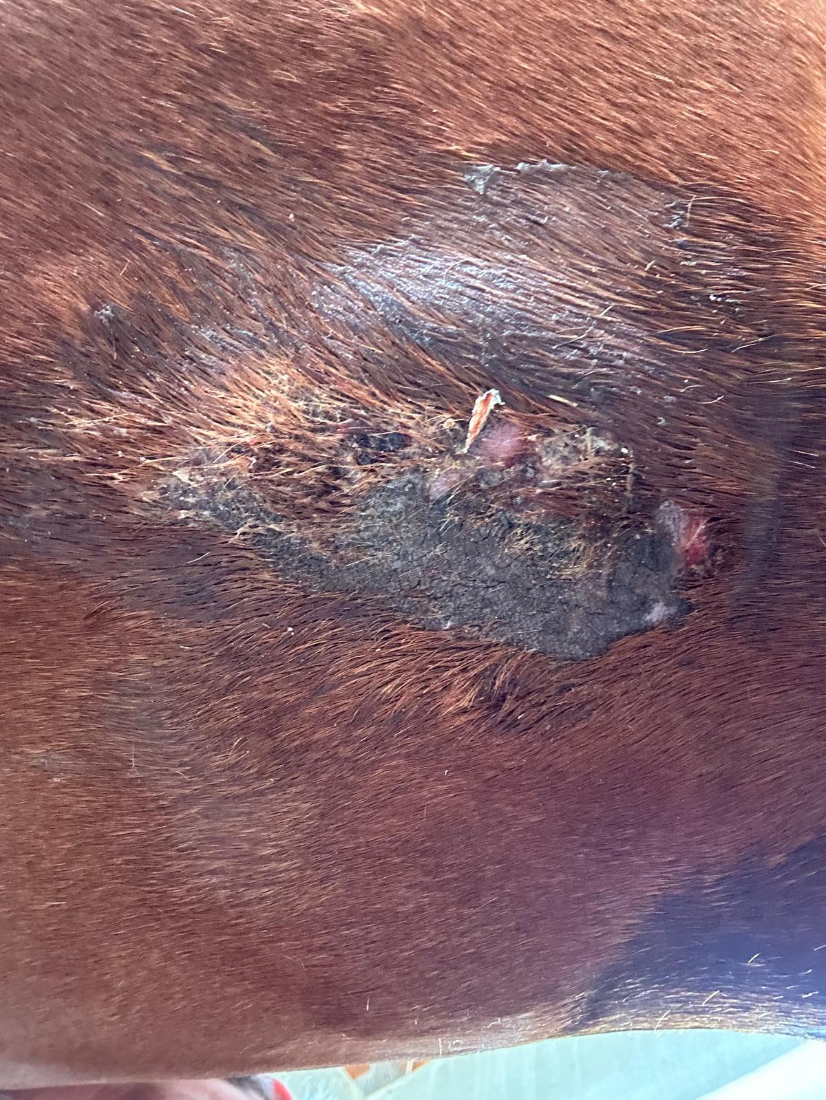 Die Stute hatte ja außerdem vor etwa 2 Wochen einen allergischen Anfall und so durchmischt sich das gerade etwas, weil das nahe beieinander liegt. Das vermeintliche Sarkoid ist im Moment ganz flach und trocken. Die Tierärztin vermutut eine Liegeschwiele. Sie hat eine Salbe mit Cortison und Antibiotikum verordnet und empfiehlt, zuerst mit pH neutralem Shampoo zu waschen, danach die Salbe aufzutragen und danach Zinkspray aufzusprayen. Das Zinkspray hat zuletzt dazu geführt dass die Stelle ausgetrocknet und geschlossen aussieht. Sie ist heute aber empfindlich.