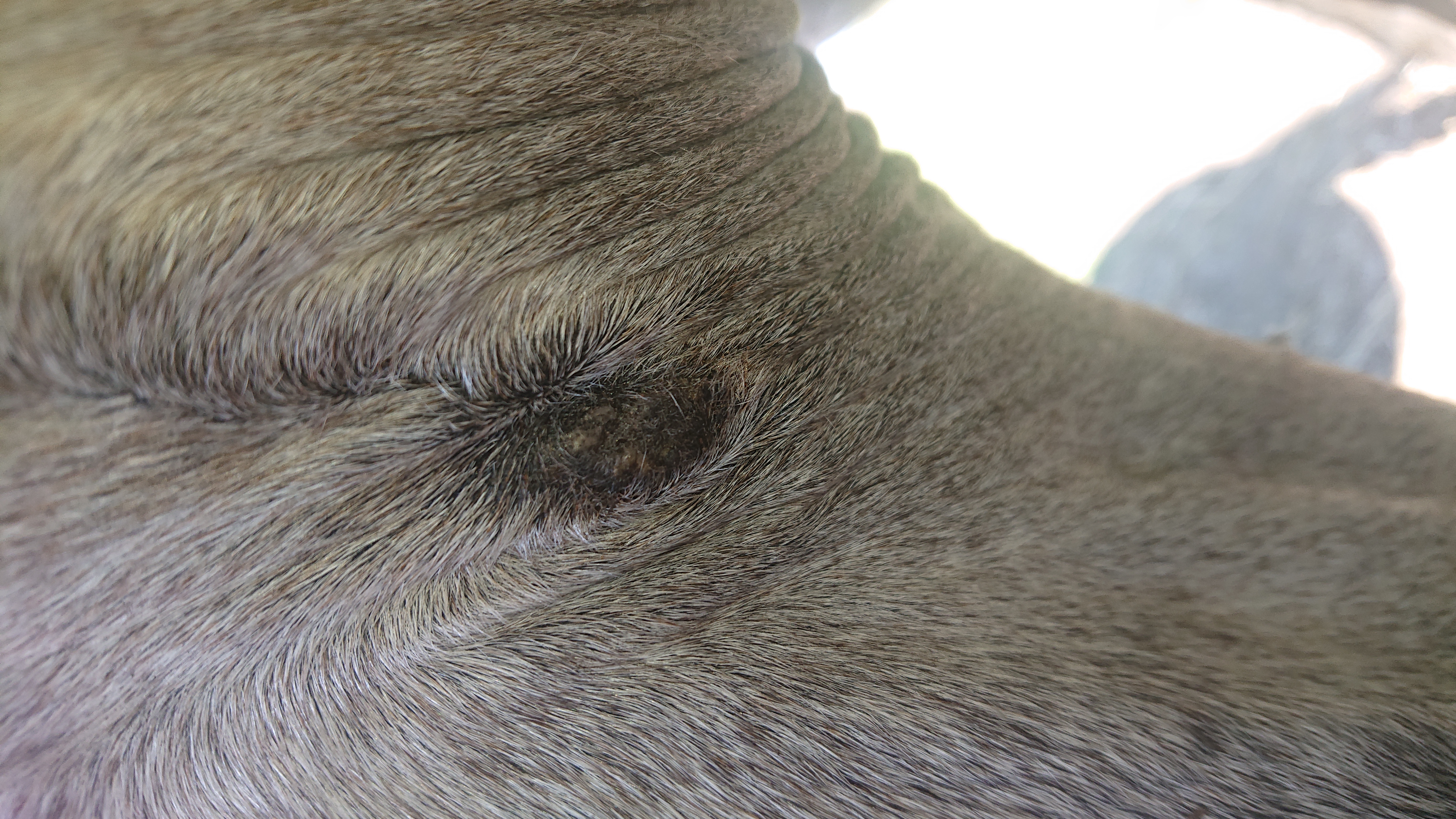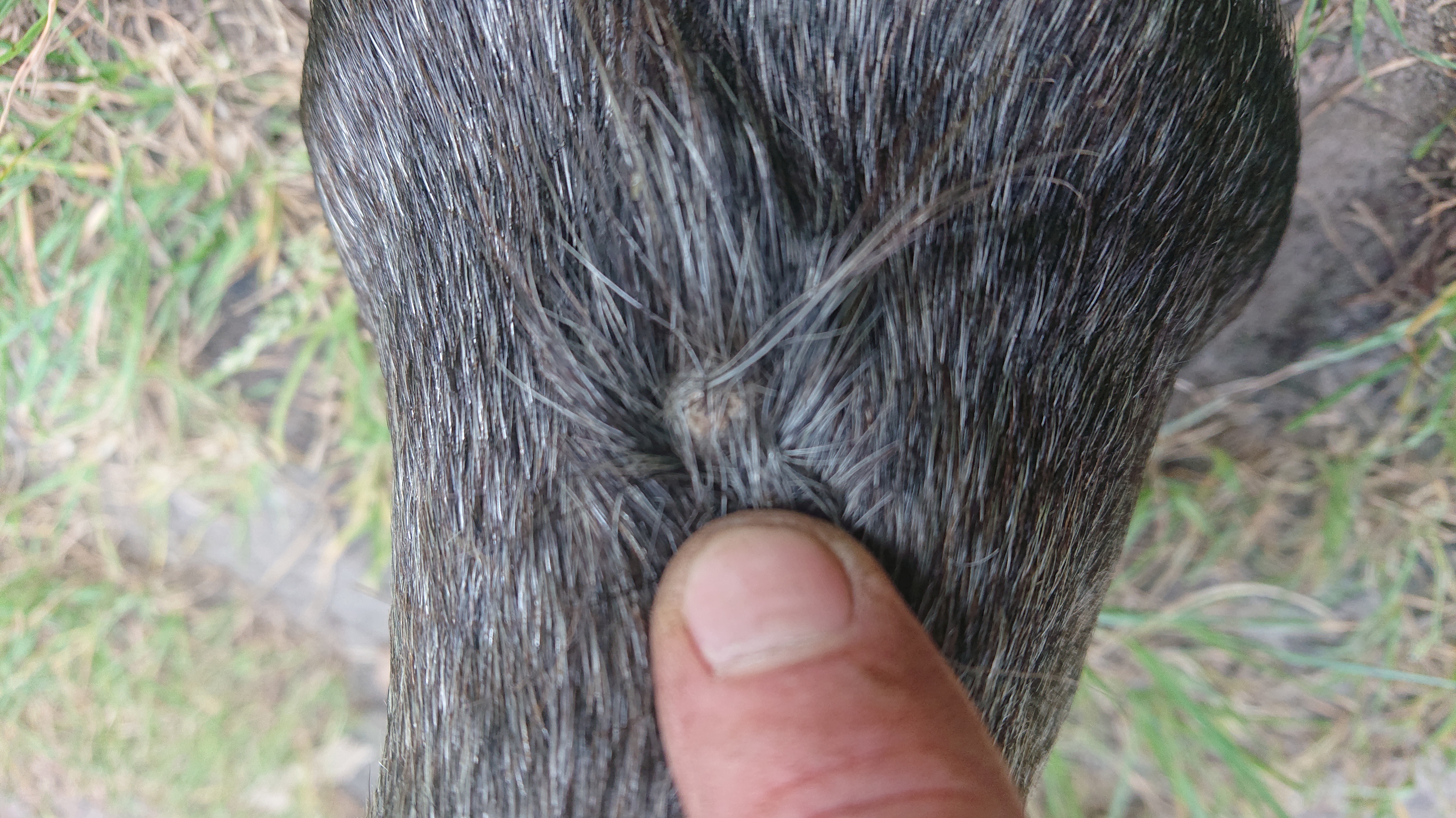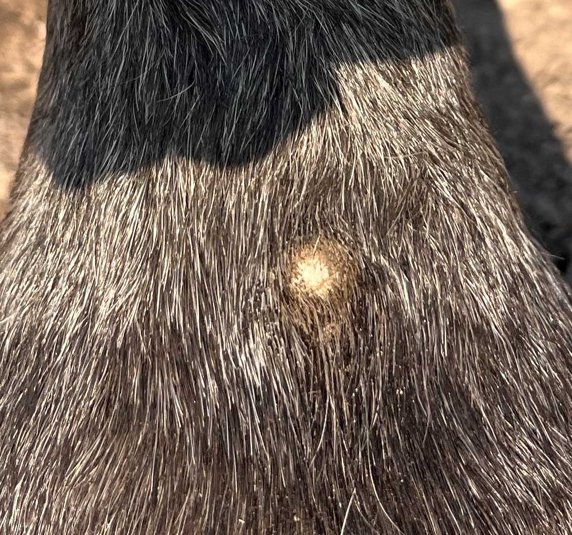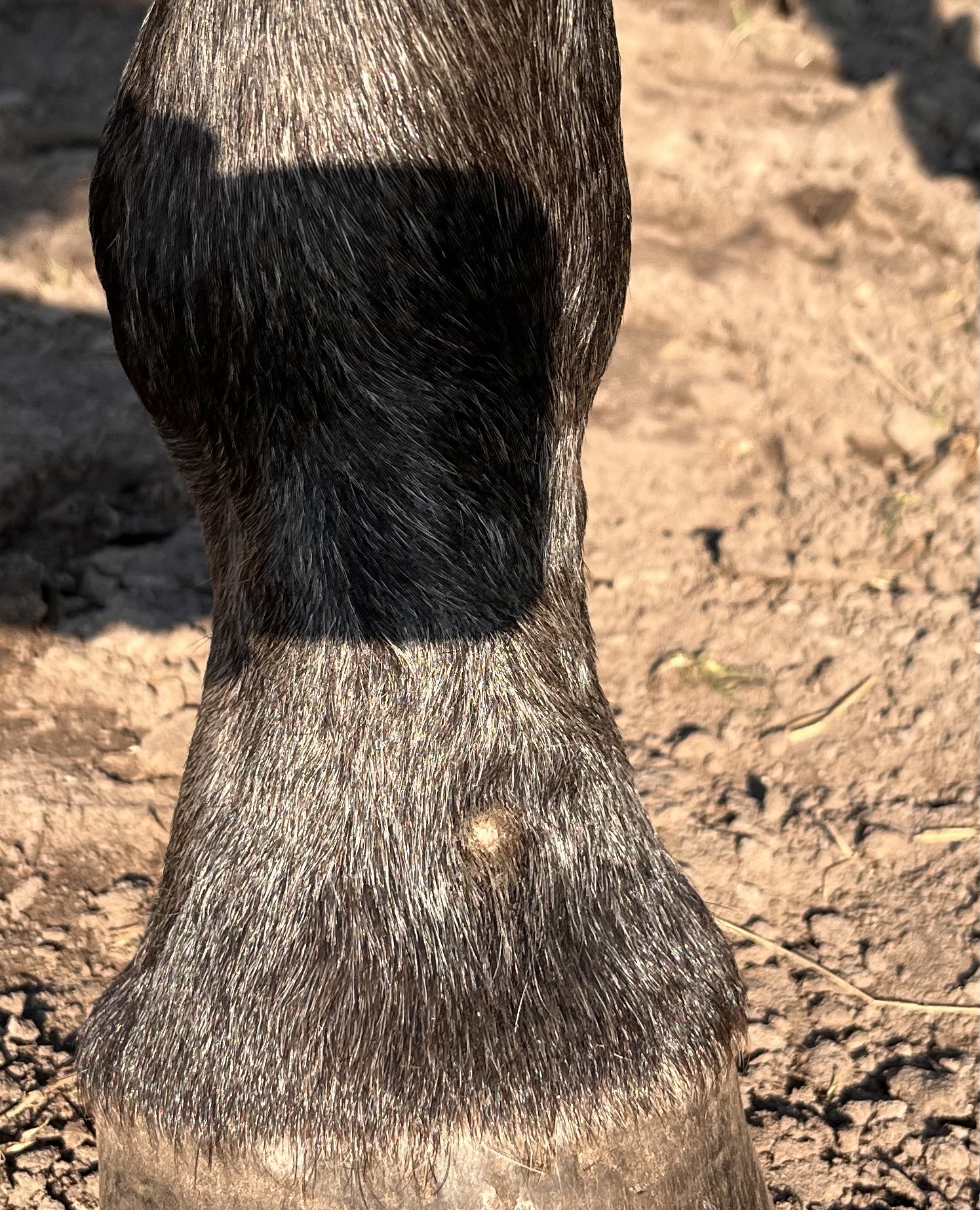 Der Knubbel auf der Fessel ist seit letztem Spätsommer da, ich hielt ihn zuerst für einen verkapselten Insektenstich und habe über das letzte Jahr gelegentlich mit Propolissalbe geschmiert, aber er ging nicht weg, wuchs auch nicht wirklich, war mal krustig, mal glatt.