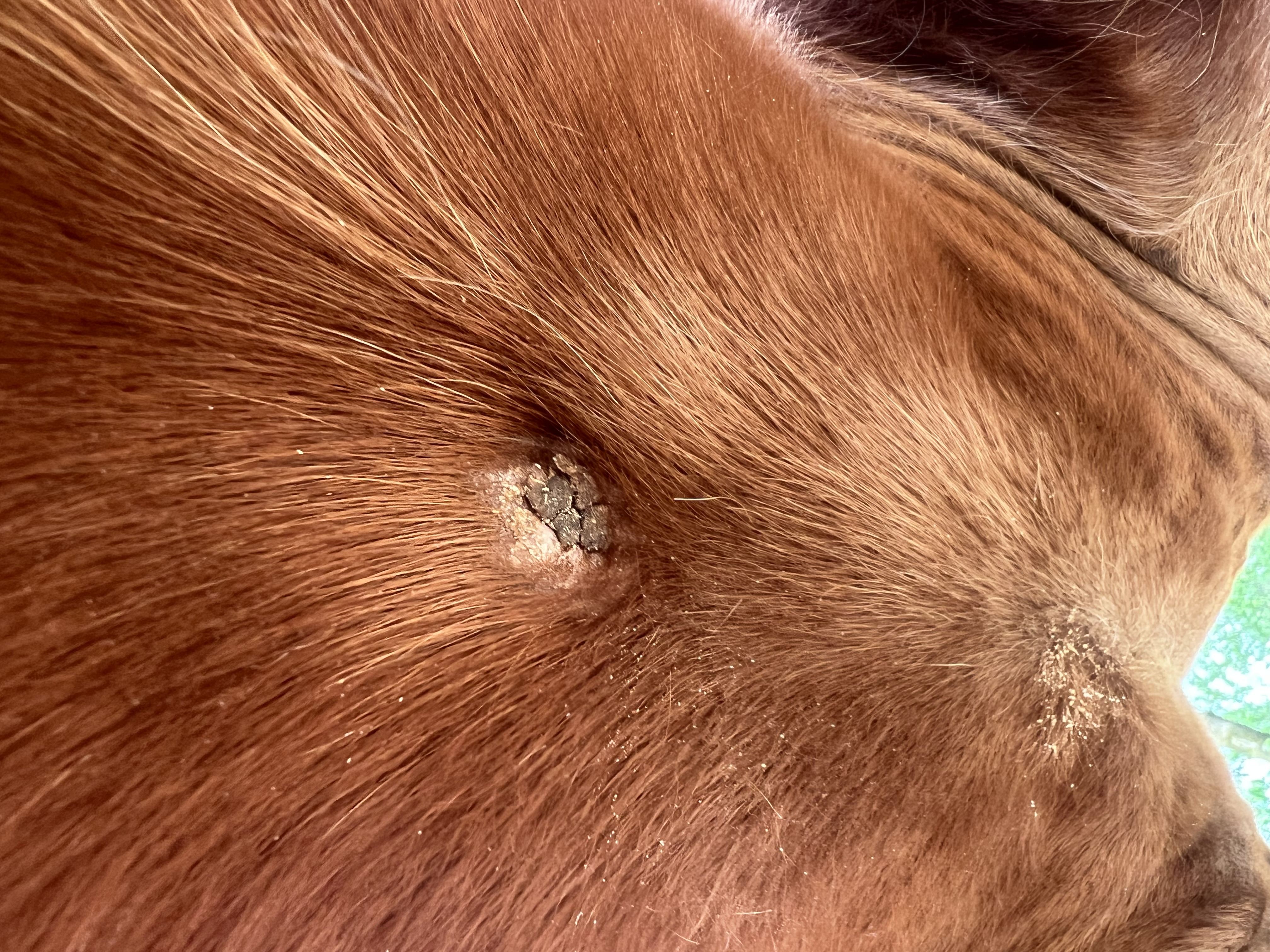 Das obere Sarkoid habe ich mit Thuja Tinktur behandelt, woraufhin es etwas „rausgekommen“ ist, allerdings nicht in die Breite gewachsen. Durch den ganzen Winterpelz hat man das nicht so gut erkennen können und ich habe eine Pause eingelegt seitdem. Es hat sich nicht verändert und sieht aus wie eine trockene Warze.