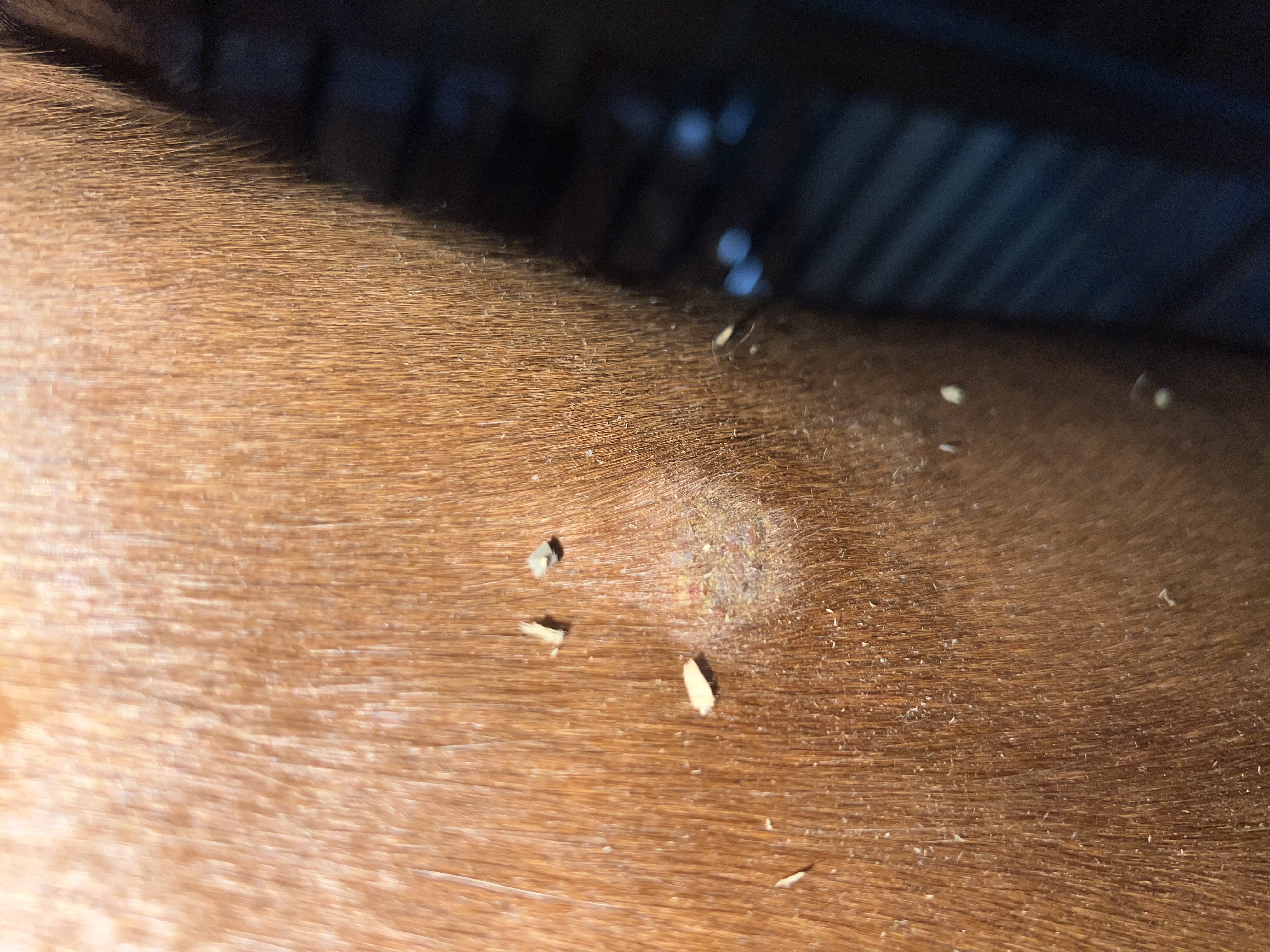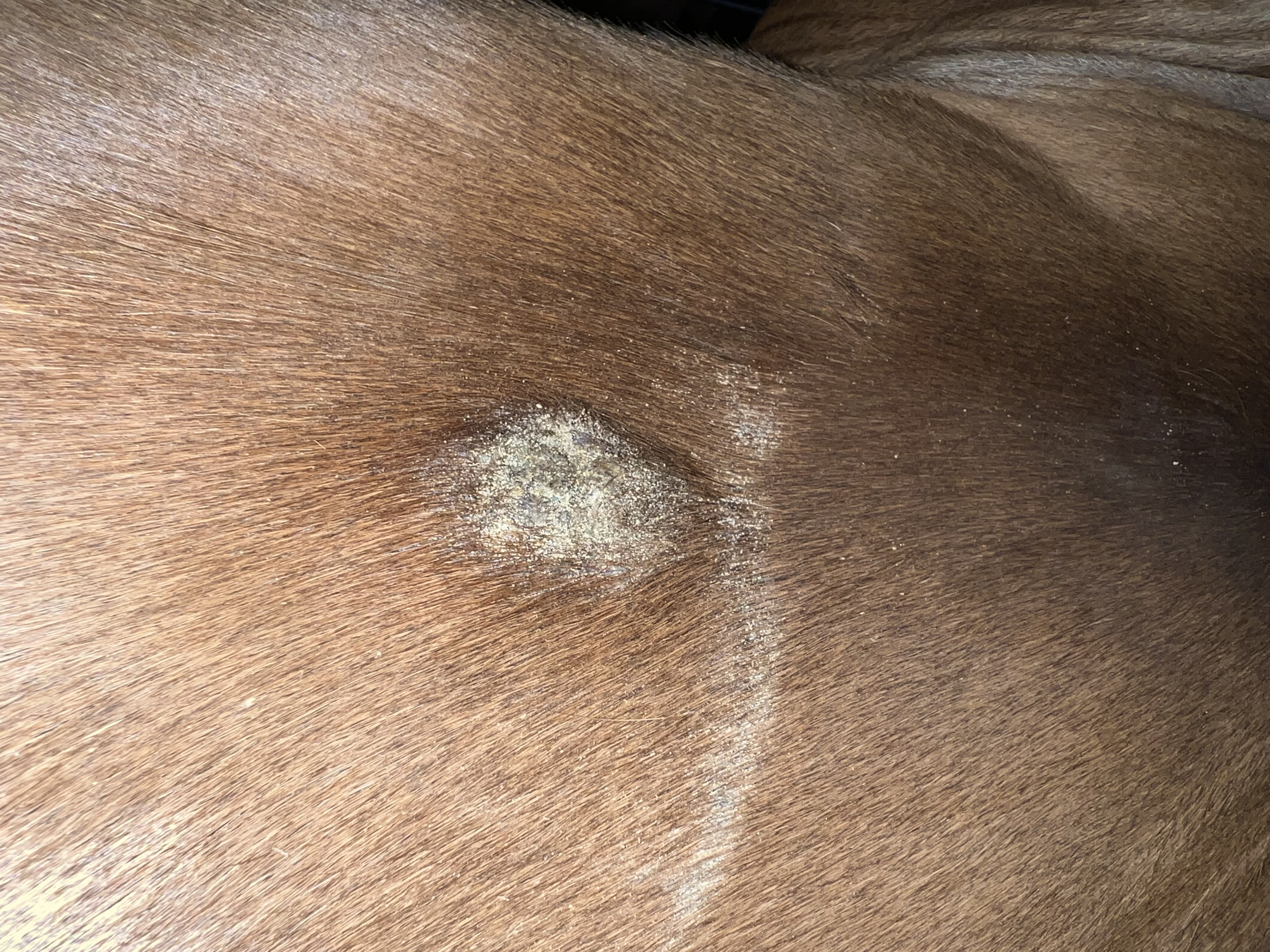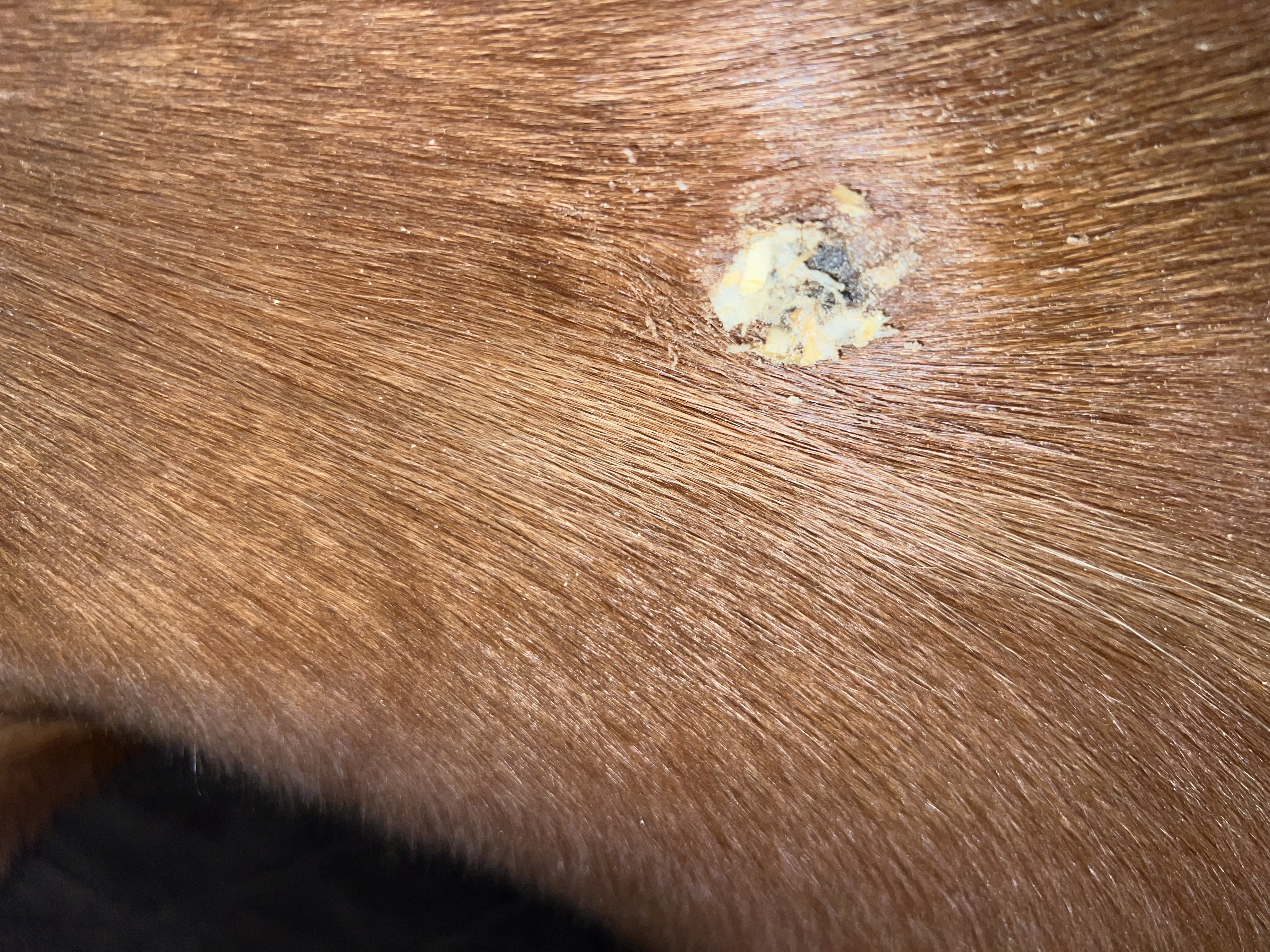 Ich habe dann Calendula hingeschmiert (weil ich es nicht als Sarkoid erkannt habe), woraufhin sich Krusten gebildet haben. (Die Bilder vom Fuchs)