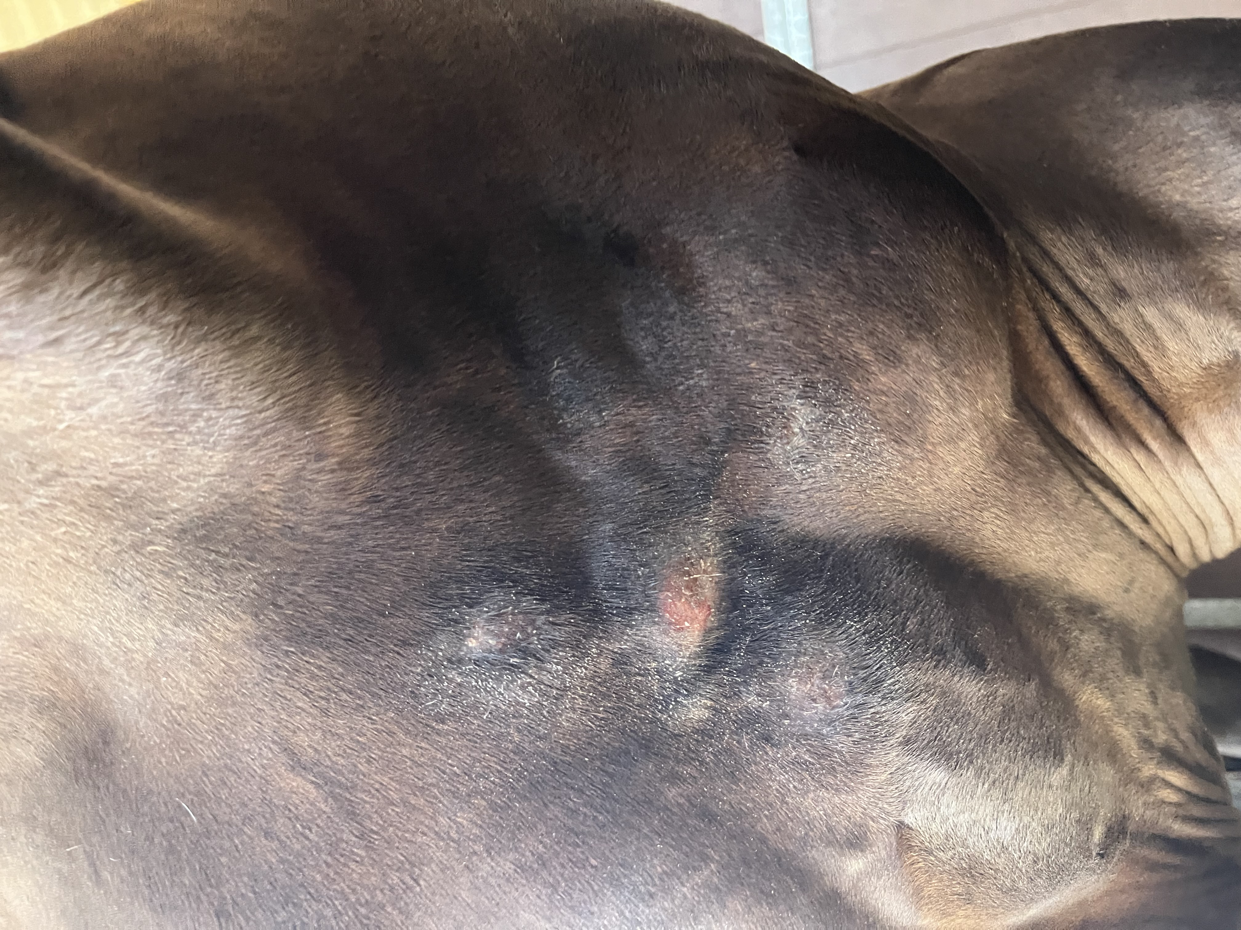 Wenn man nur das Foto von heute betrachtet und von behandelten Sarkoiden ausgeht, würde ich sagen, dass das gut aussieht und hätte jetzt mit CompX geraten, noch ein paar Mal stark verdünnt über die Stellen zu gehen.
