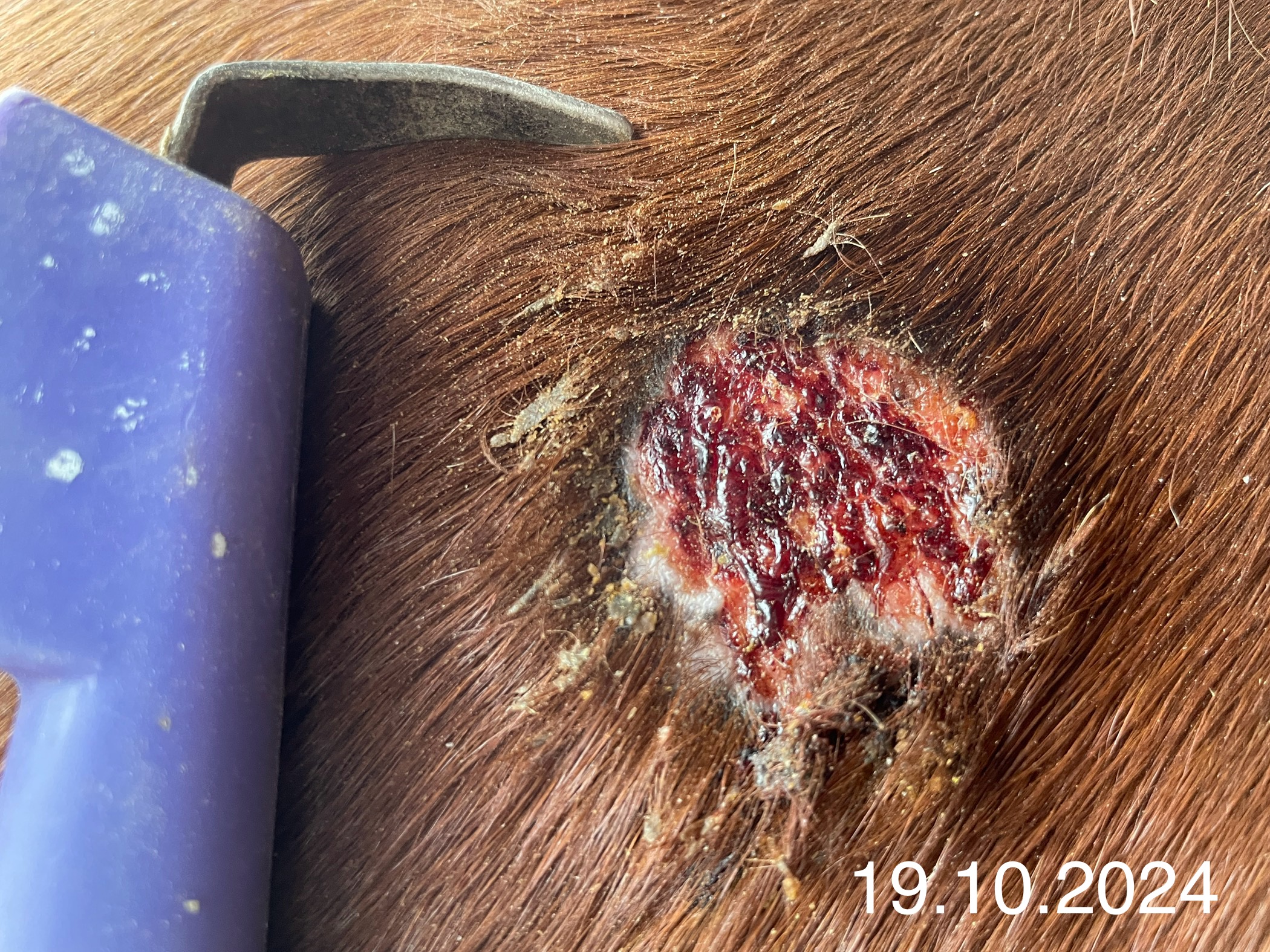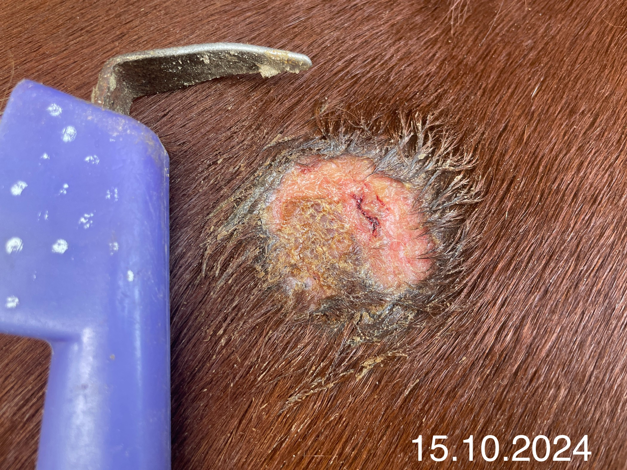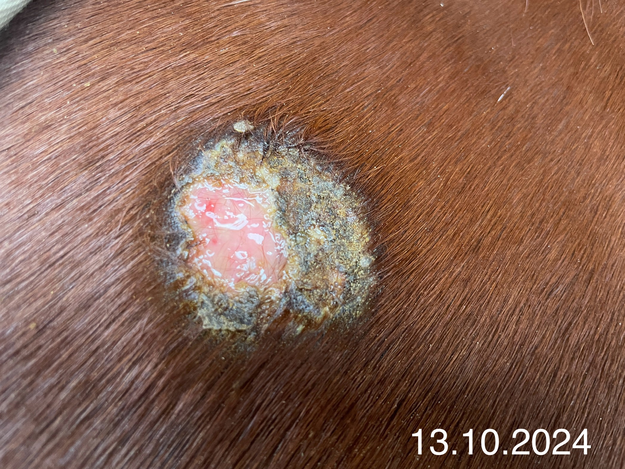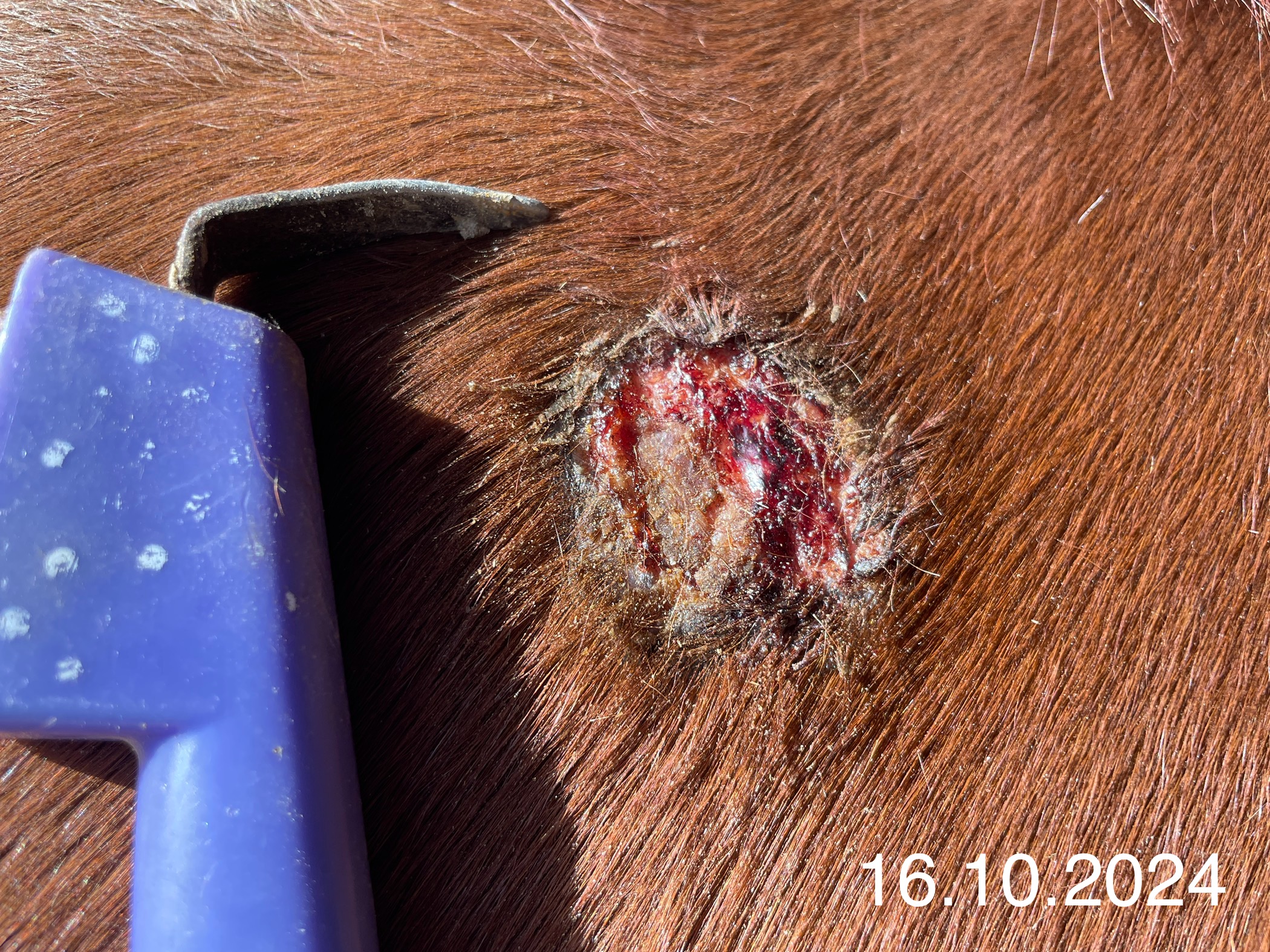 Daraufhin nach abermaliger Rücksprache mit TA im September 2024 die Behandlung mit CompX begonnen mit schneller sichtbarer Reaktion. Behandlung bisher täglich, Verhältnis 1:1 CompX/Vaseline. Die Krusten waren bisher recht dünn und haben sich immer schnell gelöst (teilweise unter Mithilfe der Koppelpartner beim Kraulen :shock: ), teilweise bereits nach 24 Stunden, jeweils mit eitriger “Soße“, die dann zum Vorschein kam. Heute zum ersten Mal größtenteils mit Blut verkrustet. Ein paar eitrige Stellen sind weiterhin erkennbar, würde daher entsprechend weiterbehandeln - oder?