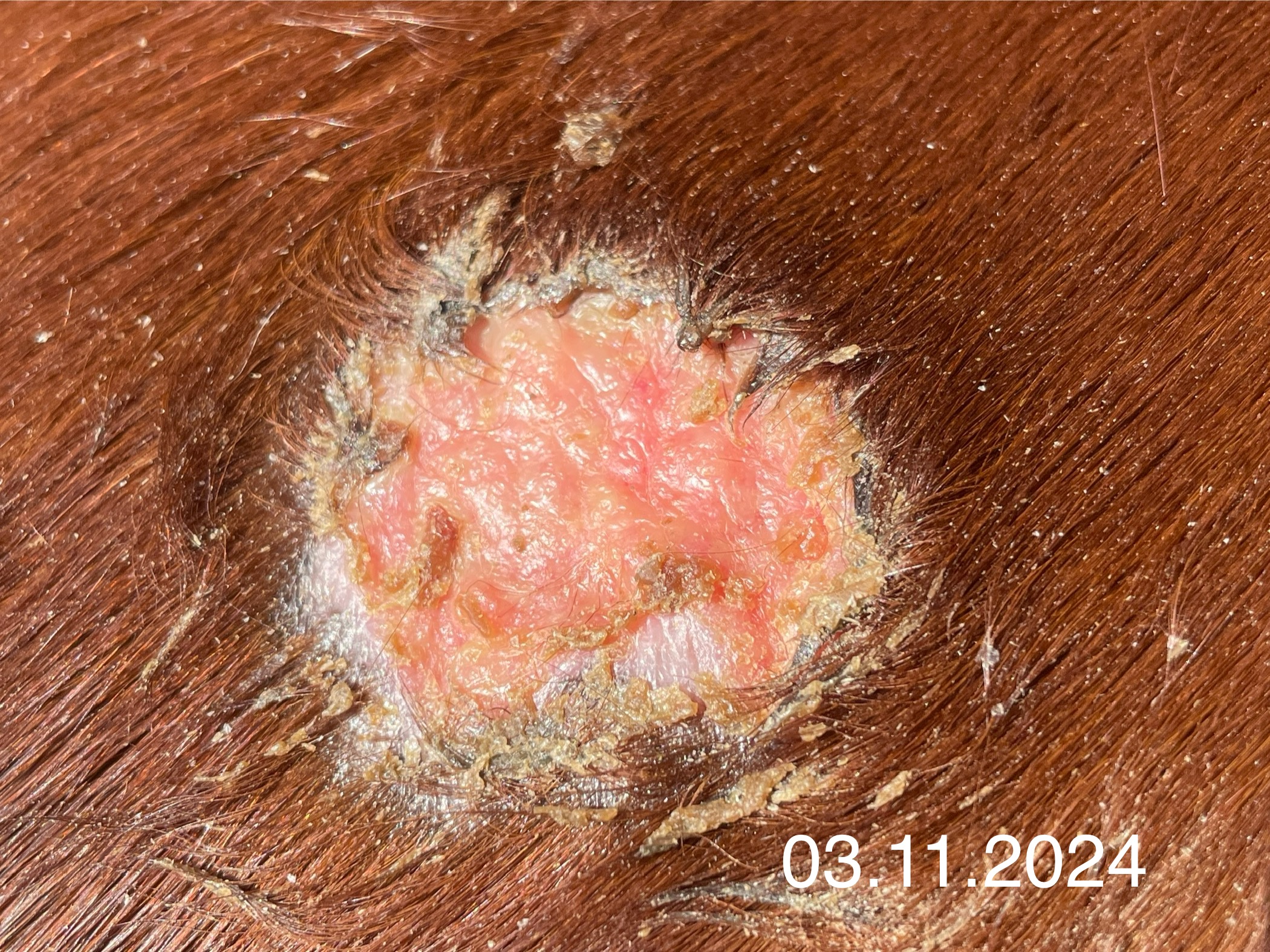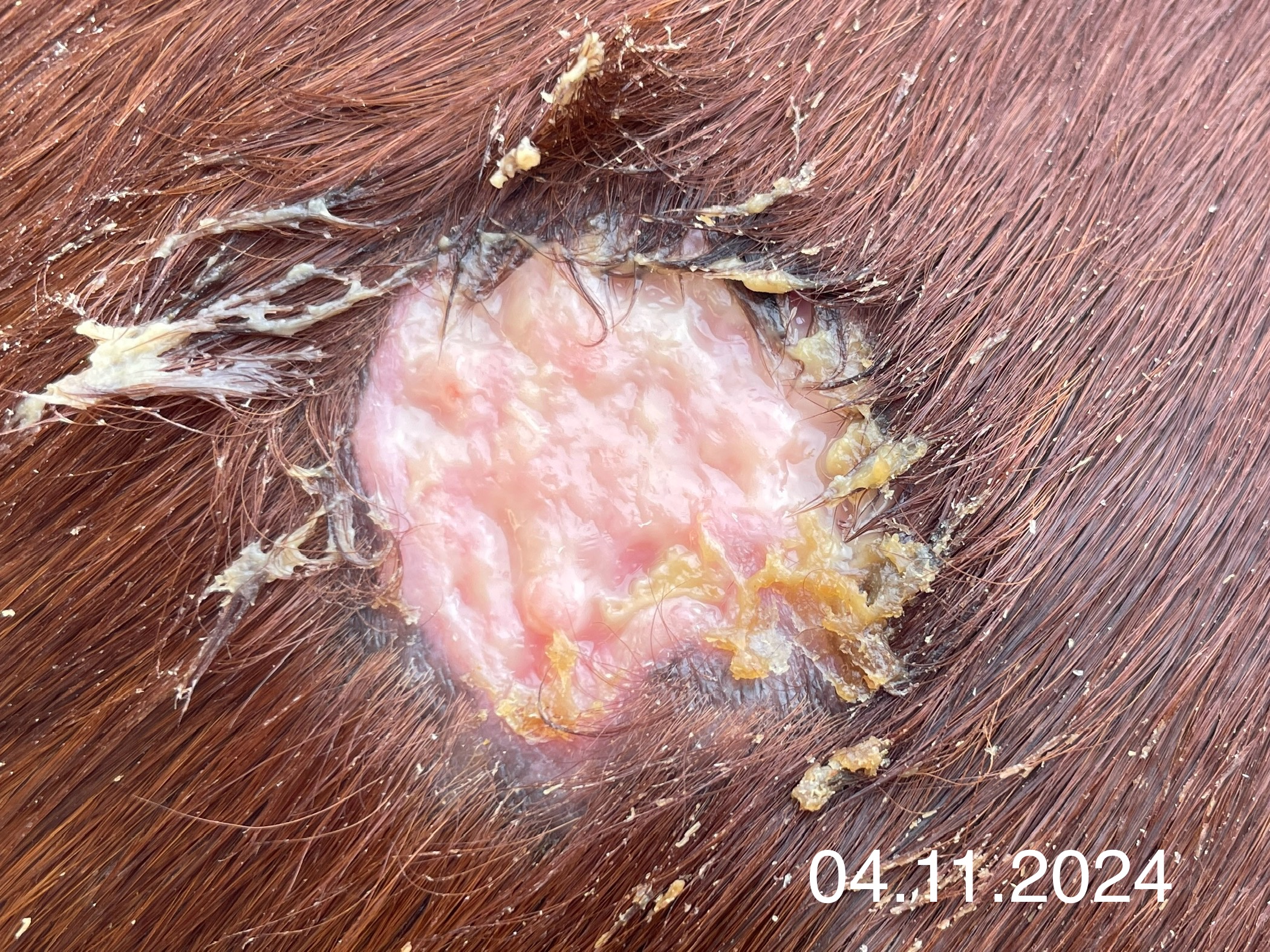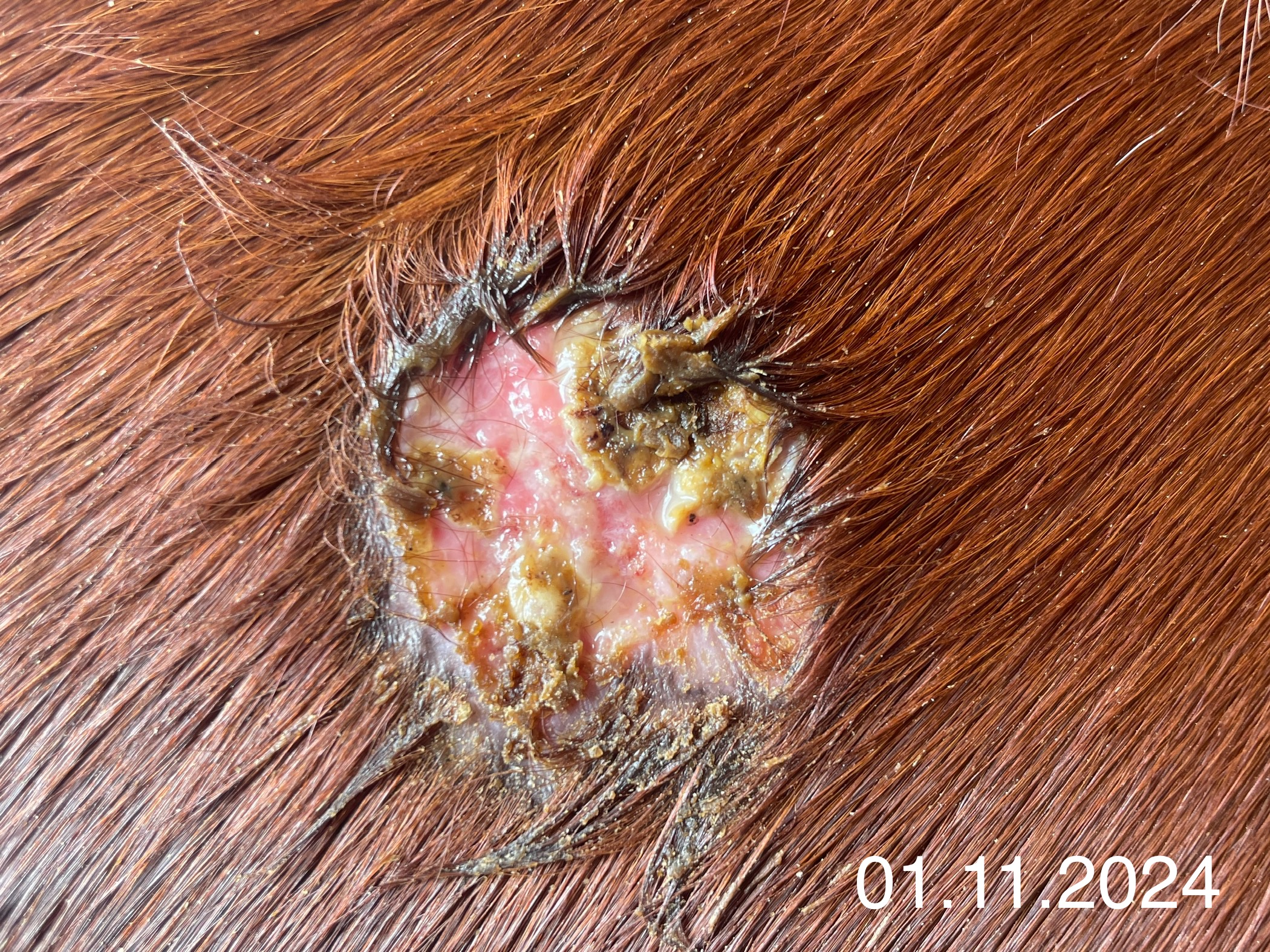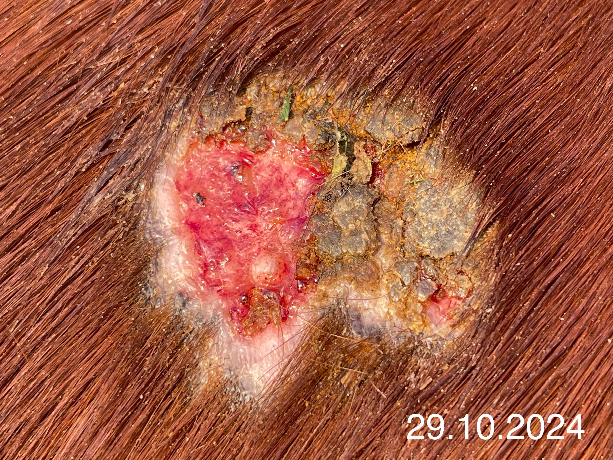 Daraufhin nach abermaliger Rücksprache mit TA im September 2024 die Behandlung mit CompX begonnen mit schneller sichtbarer Reaktion. Behandlung bisher täglich, Verhältnis 1:1 CompX/Vaseline. Die Krusten waren bisher recht dünn und haben sich immer schnell gelöst (teilweise unter Mithilfe der Koppelpartner beim Kraulen :shock: ), teilweise bereits nach 24 Stunden, jeweils mit eitriger “Soße“, die dann zum Vorschein kam. Heute zum ersten Mal größtenteils mit Blut verkrustet. Ein paar eitrige Stellen sind weiterhin erkennbar, würde daher entsprechend weiterbehandeln - oder?
