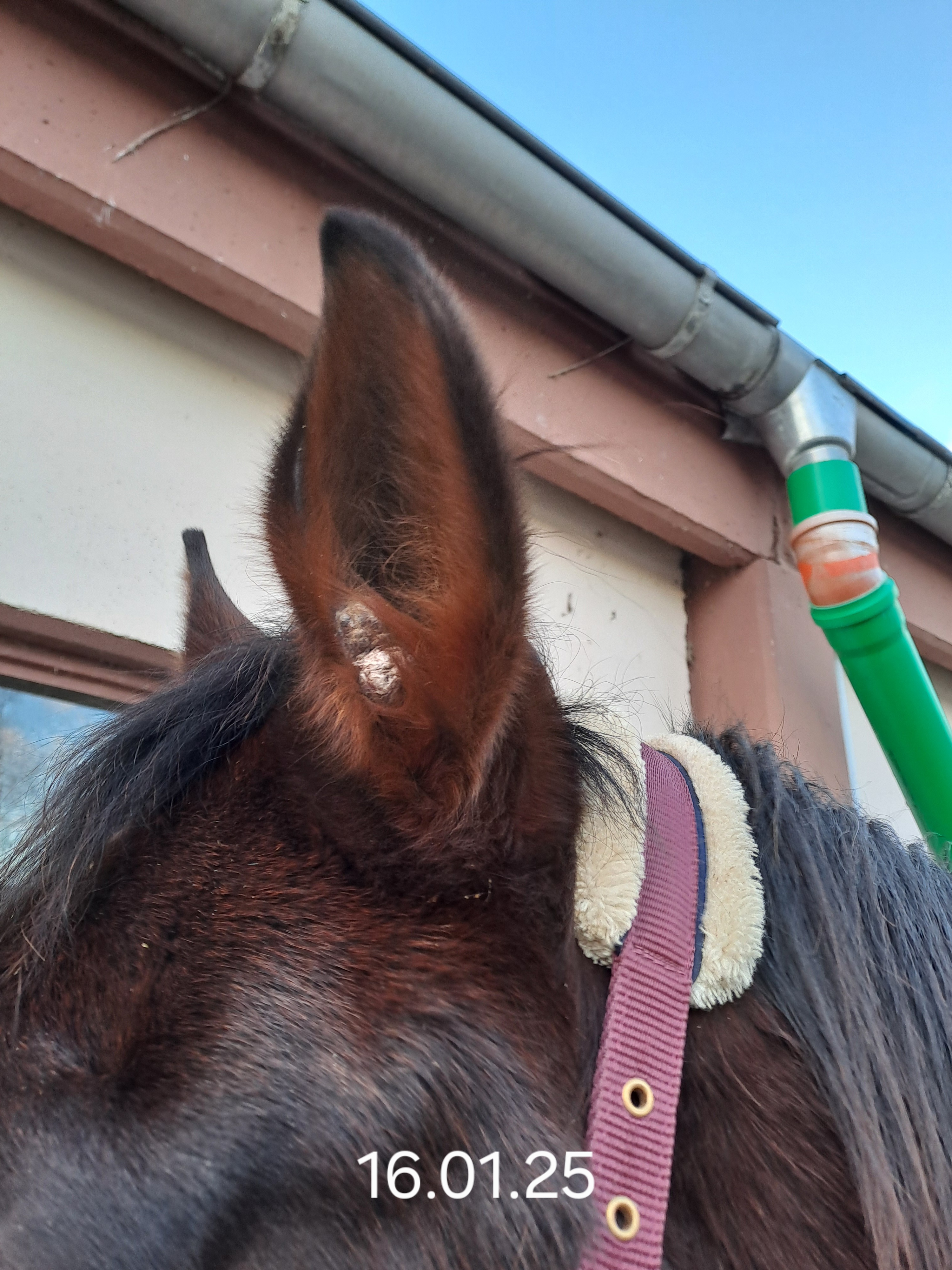 Der Gedanke mit der chirurgischen Entfernung hat sich erledigt. Ich habe es die letzten beiden Tage geschafft, dass er sich das Ohr mithilfe der Nasenbremse behandeln lässt. Dabei habe ich festgestellt, daß sich um das Sarkoid herum ein Spalt gebildet hat. Ich denke, es wird bald abfallen, da es sich schon sehr lose anfühlt. Darüber bin ich sehr erleichtert. Das Sarkoid am Hals hat mittlerweile eine Kruste, die nur am Rand etwas offen ist. In diesen Spalt tupfe ich das Compx vorsichtig mit einem Pinsel. Das an der Brust ist komplett verkrustet, da mache ich erstmal nichts. Aber generell habe ich ein sehr gutes Gefühl bei der Sache. Es scheint ihn auch nicht zu belasten, da er gut drauf ist und ich ihm auch problemlos z. B. die Trense über die Ohren ziehen kann.