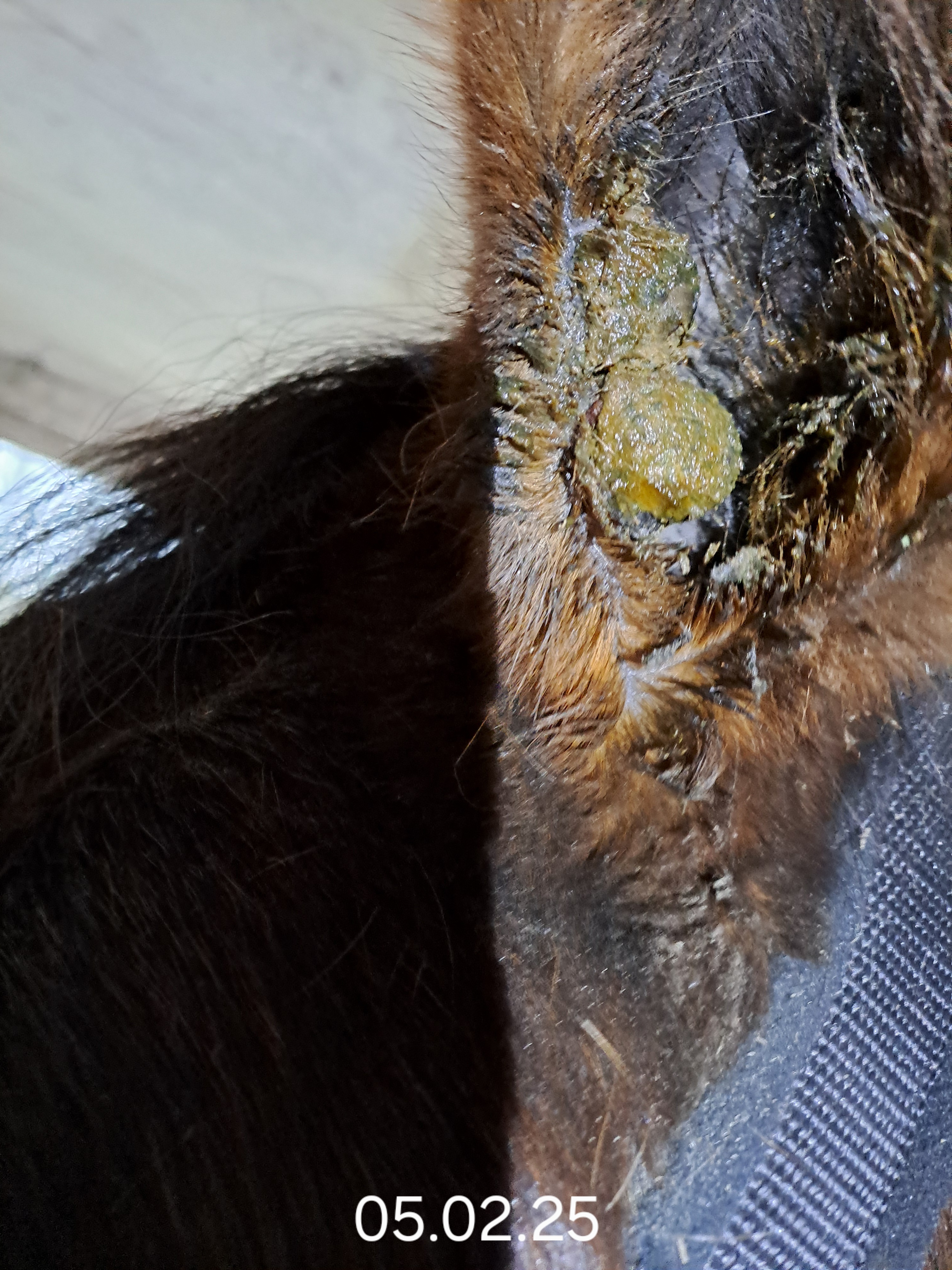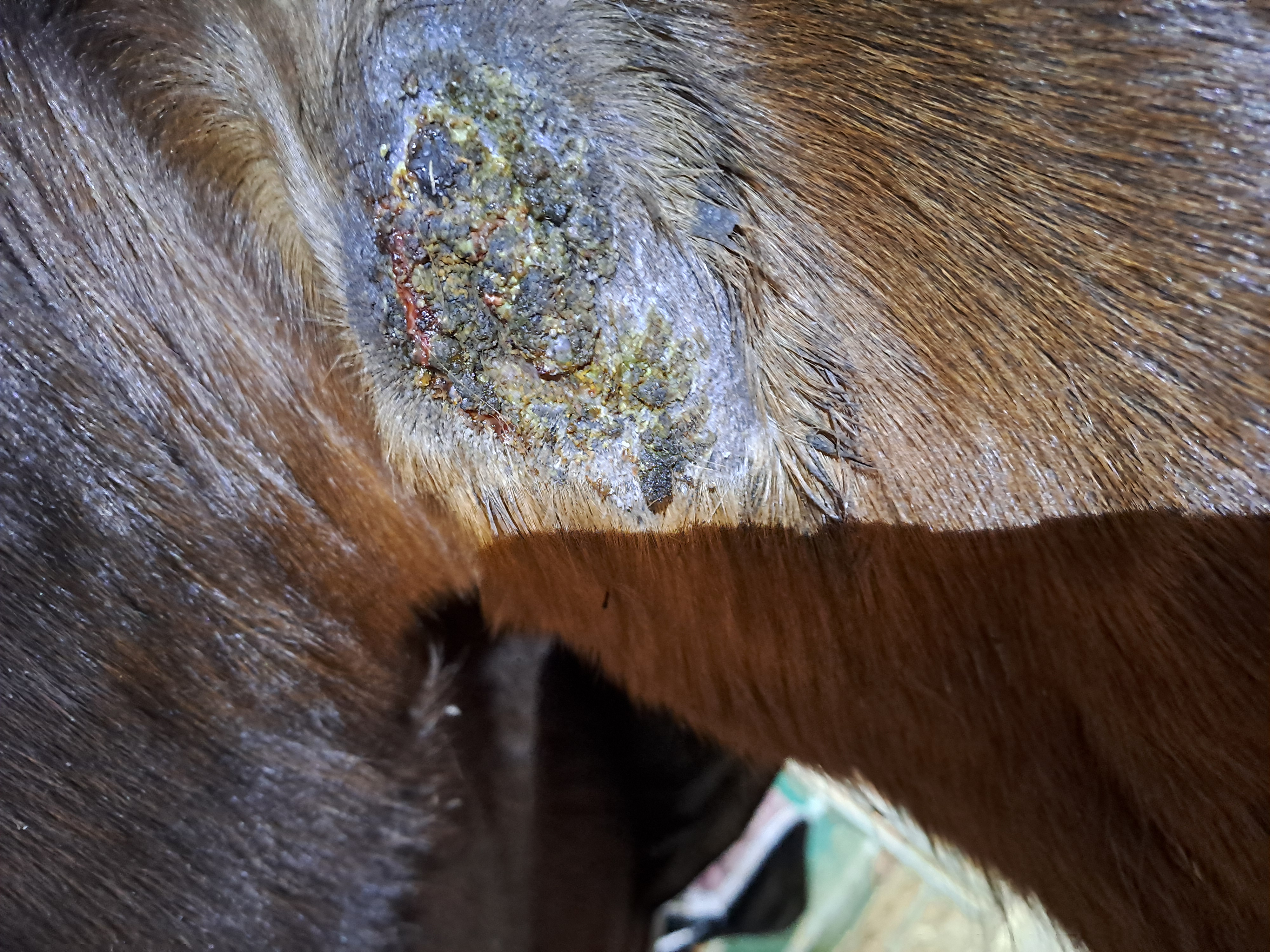 Habe vorgestern bei den Sarkoiden am Hals und an der Brust aufgehört zu schmieren, da eine geschlossene feste Kruste vorhanden war. Heute war die Kruste am Hals abgefallen, dort habe ich wieder angefangen zu schmieren. An der Brust ist die Kruste noch vorhanden, nur ein kleiner Riss war vorhanden, da hab ich vorsichtig etwas mit dem Pinsel reingetupft. Am Ohr tut sich so gut wie gar nichts. Mittlerweile muss ich da mit der Nasenbremse ran, da er mich nicht mehr ran lässt. Bin jetzt am überlegen, es chirurgisch entfernen zu lassen, da es sehr groß ist und ich von hinten gar nicht dran komme. Würde es deshalb entfernen lassen und dann weiter schmieren.