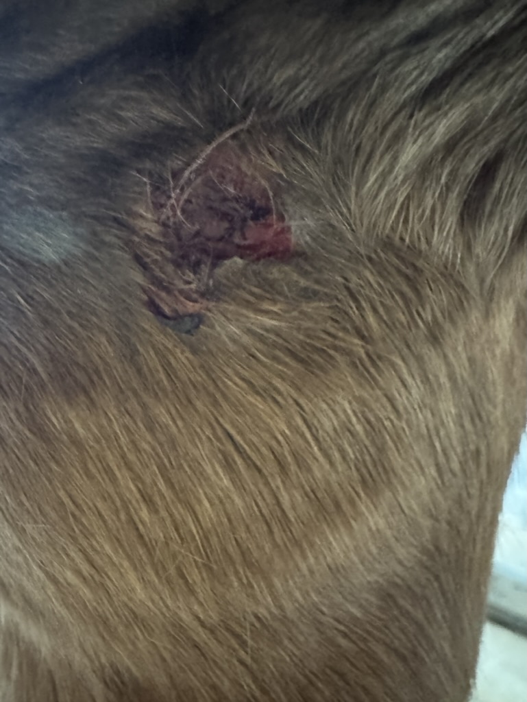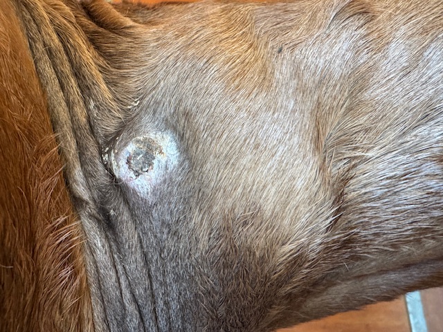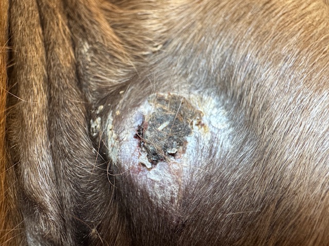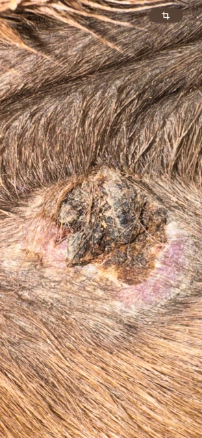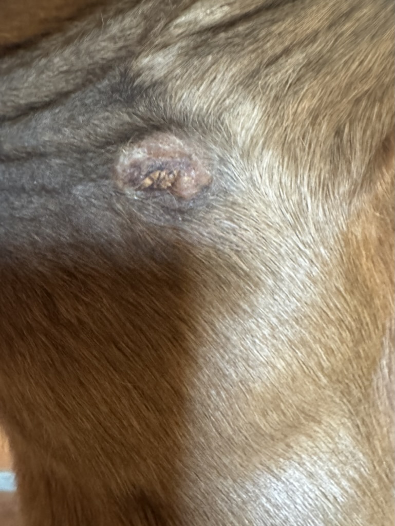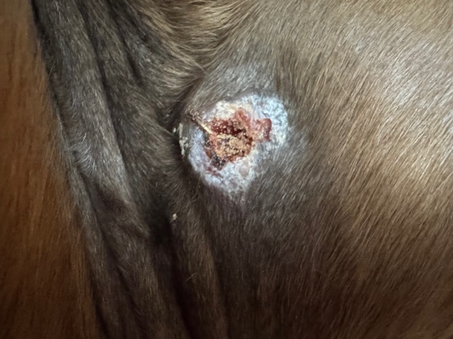 Mein Pferd hatte vor zwei Jahren einen geschwollenen Insektenstich an der Achsel vorne, der als kahle Stelle zurückblieb. Ich wusste nicht, was das war, habe gar nicht an so etwas wie ein Sarkoid gedacht. Jetzt hat die Stelle an Größe etwas zugelegt, mein TA hat dann die Diagnose Sarkoid gestellt. Ich war geschockt! Er hat mir Dermequin Salbe dagelassen, ich habe jetzt seit sechs Tagen geschmiert. Die stelle war zwei Tage lang wie Leder, an Tag drei hat es wohl gejuckt und mein Pferd ist irgendwie rangekommen und hat es aufgekratzt. Es hat stark geblutet. Ich habe weiter geschmiert und jetzt bildet sich eine schwarze Kruste mit Rillen dazwischen. Habe auch das Gefühl dass die behaarte normale Haut drum herum fester wird und irgendwie reagiert. Fotos hänge ich unten an, ich hoffe, man kann sie sehen? Soll ich weiterschmieren, oder pausieren? TA meint weiterschmieren. Was kann ich sonst noch tun? Ich habe so Angst, dass es größer wird oder sich vermehrt.
