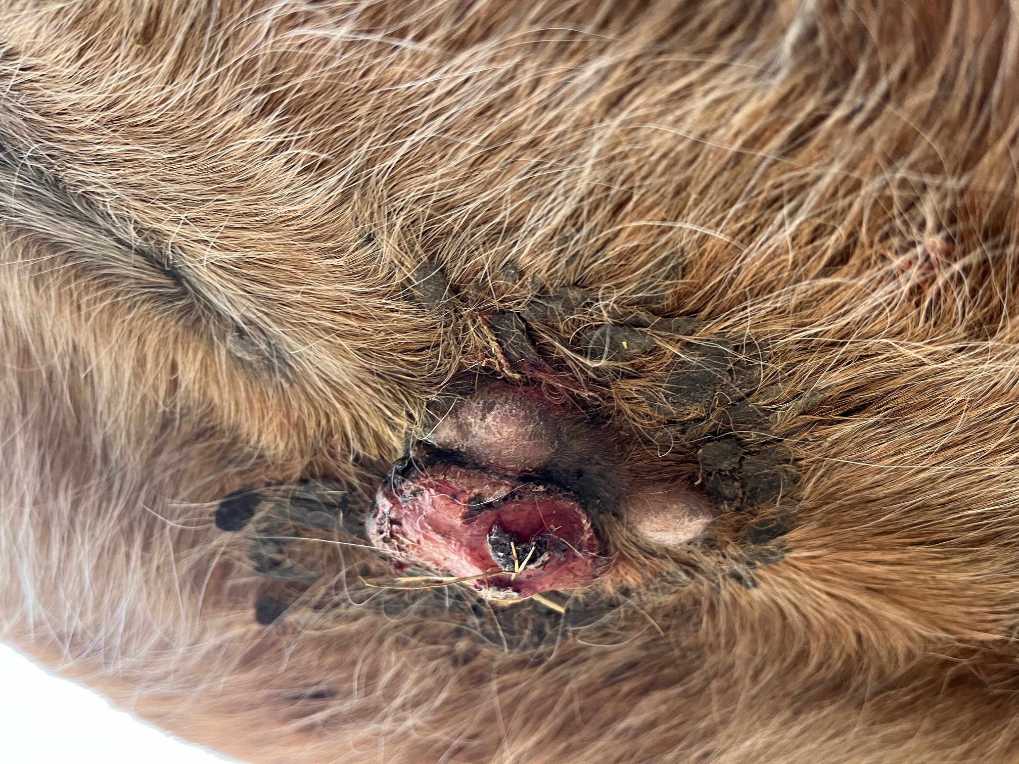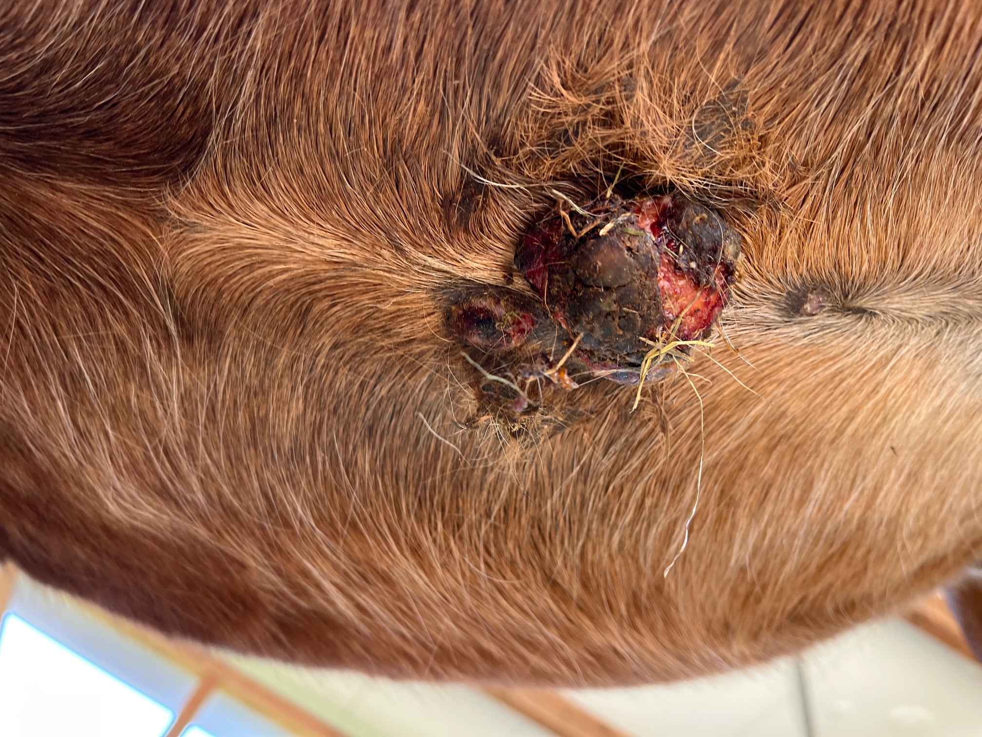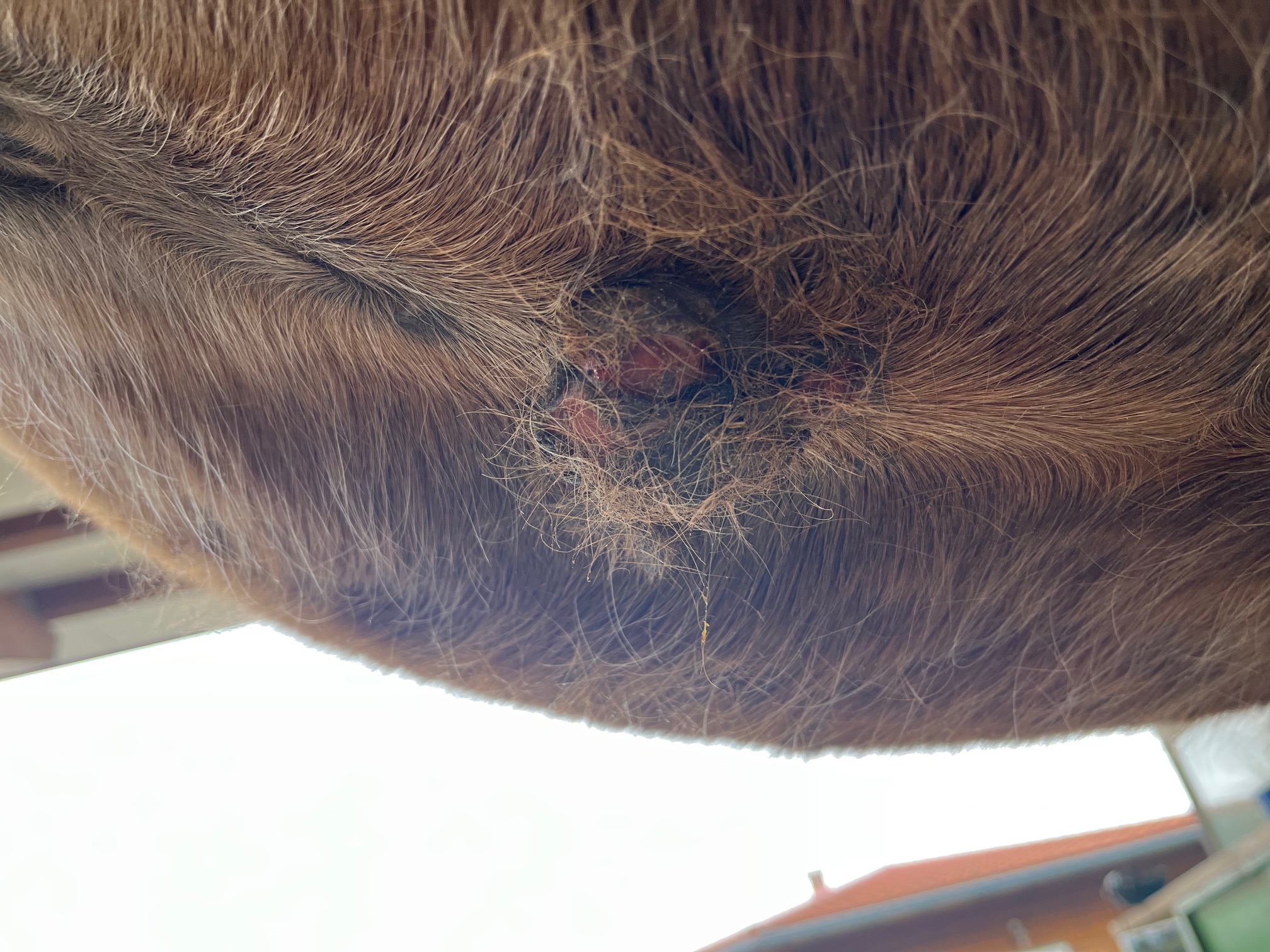 Gestern war der Tierarzt da und hat gemeint, dass im Sommer ein offenes Sarkoid Probleme machen würde, wenn die Fliegen kommen und die dort ihre Eier ablegen. Mir graut es schon vor der Vortellung.