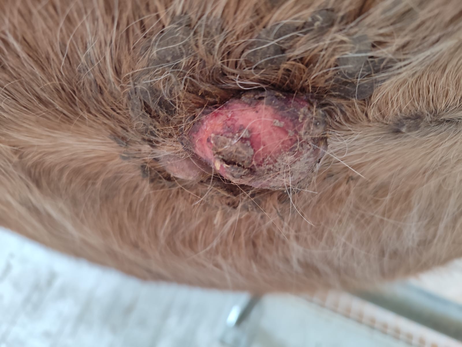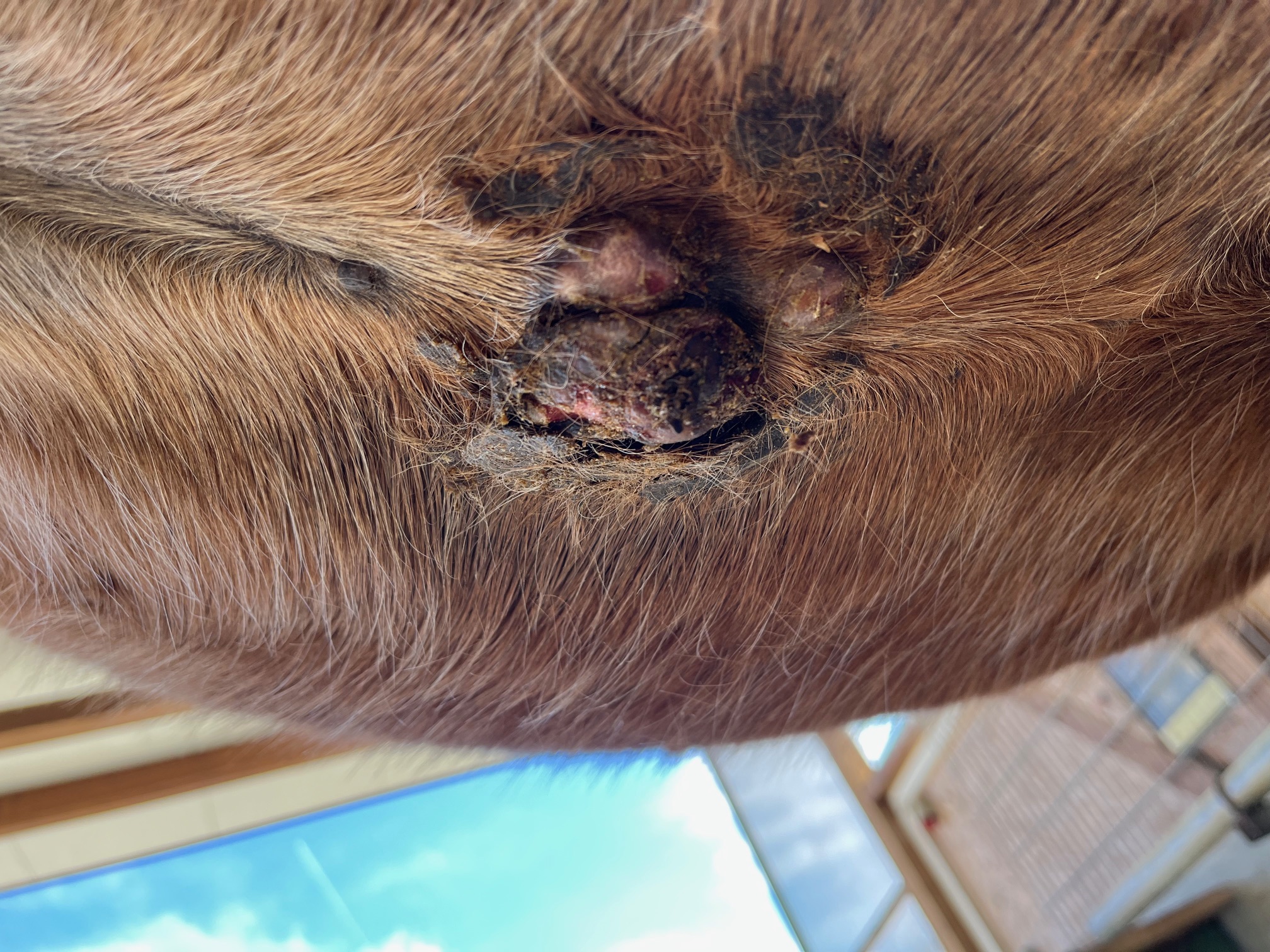 Das Sarkoid am Bauch reagiert wunderbar auf die CompX. Es verkrustet nach und nach.