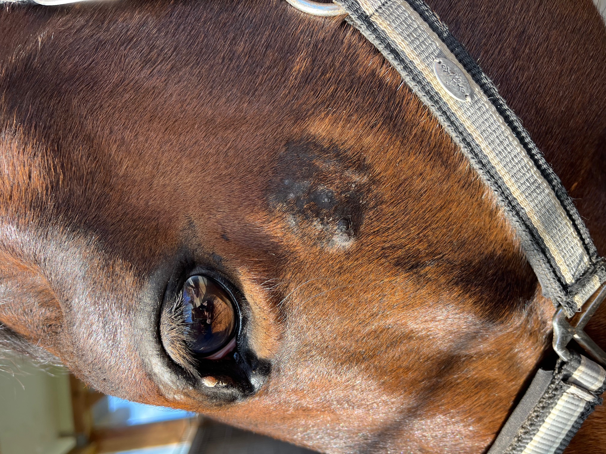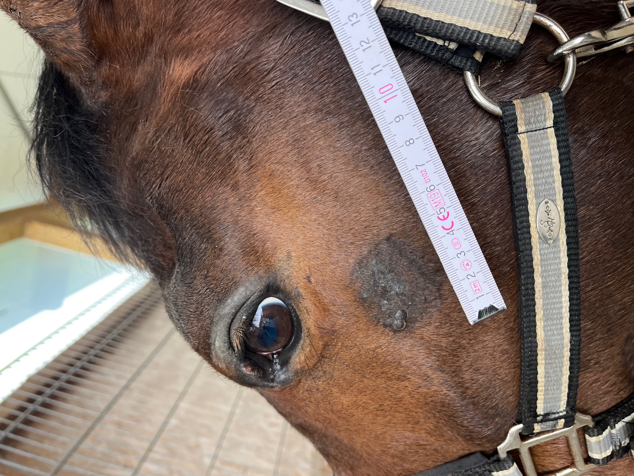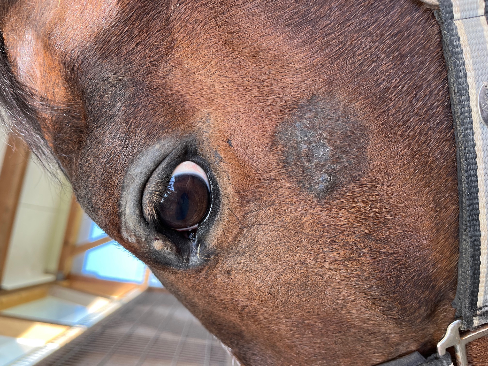 Ich bin mir nicht sicher, ob das oben am Augenlid ein Sarkoid ist. Meine Stute sieht gerade auch so aus. Die ist allergisch auf absolut sämtliche Pollen und juckt und schubbert sich die juckenden Augen schon wieder die ganze Zeit. Die sieht quasi genauso aus wie Dein Pferd.