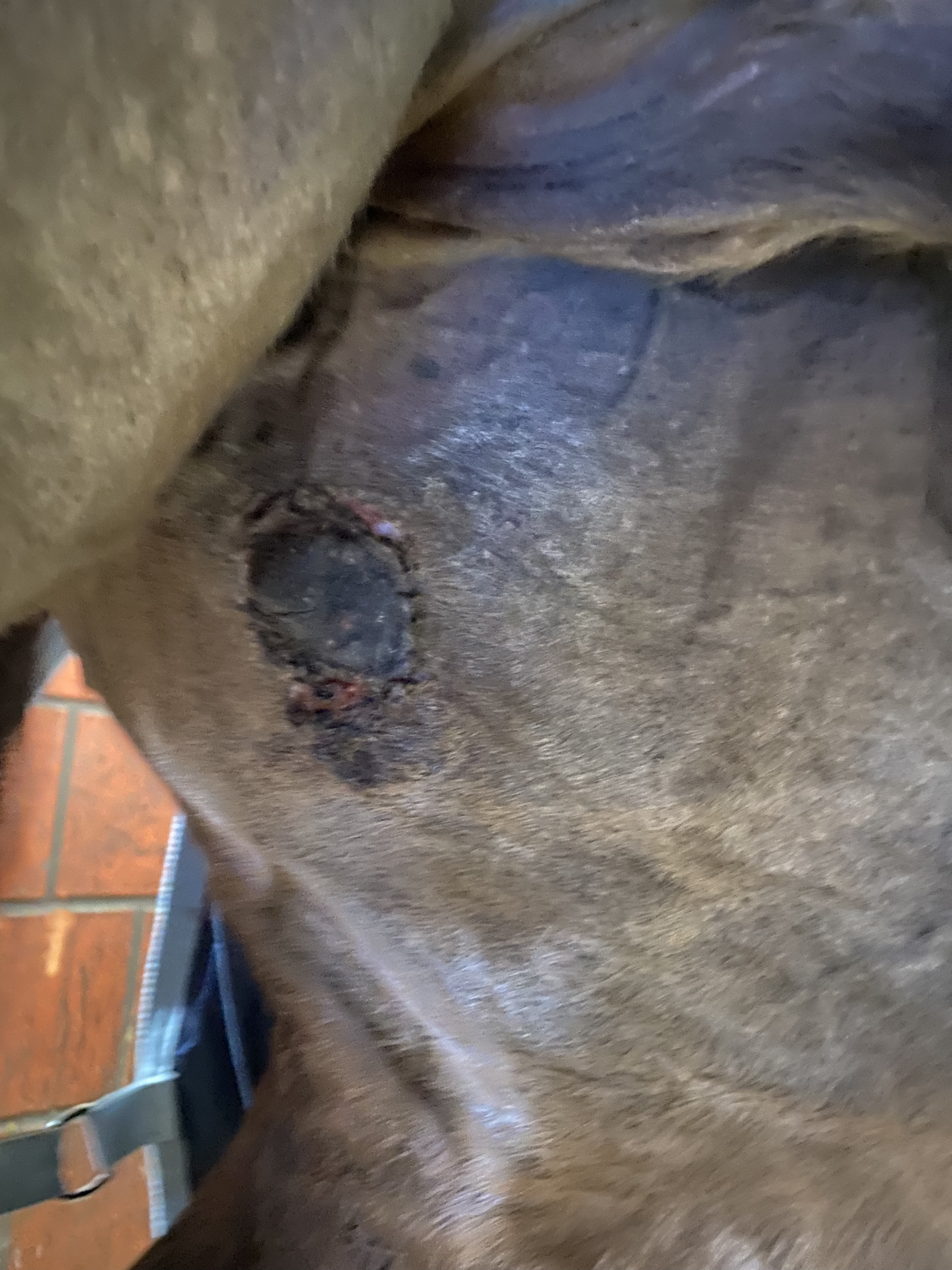 Ich habe das Gefühl, dass es sich um ein fibroplastisches Sarkoid handeln könnte. Natürlich kommt es gelegentlich zu Reibung – sei es beim Reiten oder auf dem Paddock. Anfangs lief die Behandlung sehr gut, und der erste Tumor fiel bereits nach zwei Wochen ab. Gestern hatte er nach dem reiten eine lokale Schwellung.