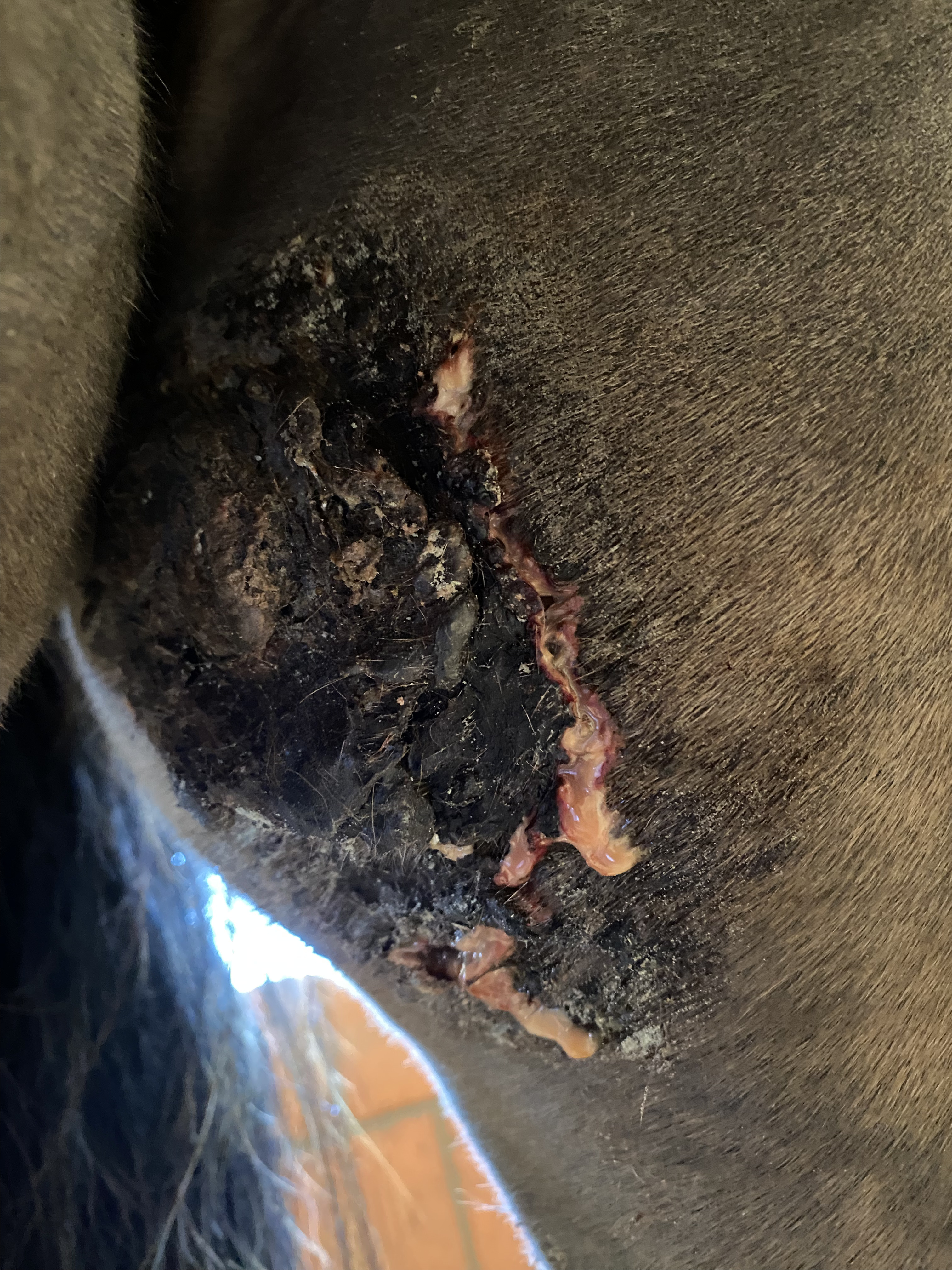 Heute Abend 20:00 uhr im Stall, nach dem Spaziergang und Führanlage. Sobald Louis sich bewegt, läuft das Sekret unten raus, wenn man versucht auf das Sekret zu cremen, hilft es nichts. Es entstand eine klene lücke zischen Kappe Sarkoid und dem Tumor darunter. Was soll ich am besten tun? weiter cremen auf die offene Stelle? Oben scheint es gut zu klappen,. Aber am unteren Ende des Tumors, habe ich das Gefühl es wird eher mehr als weniger.