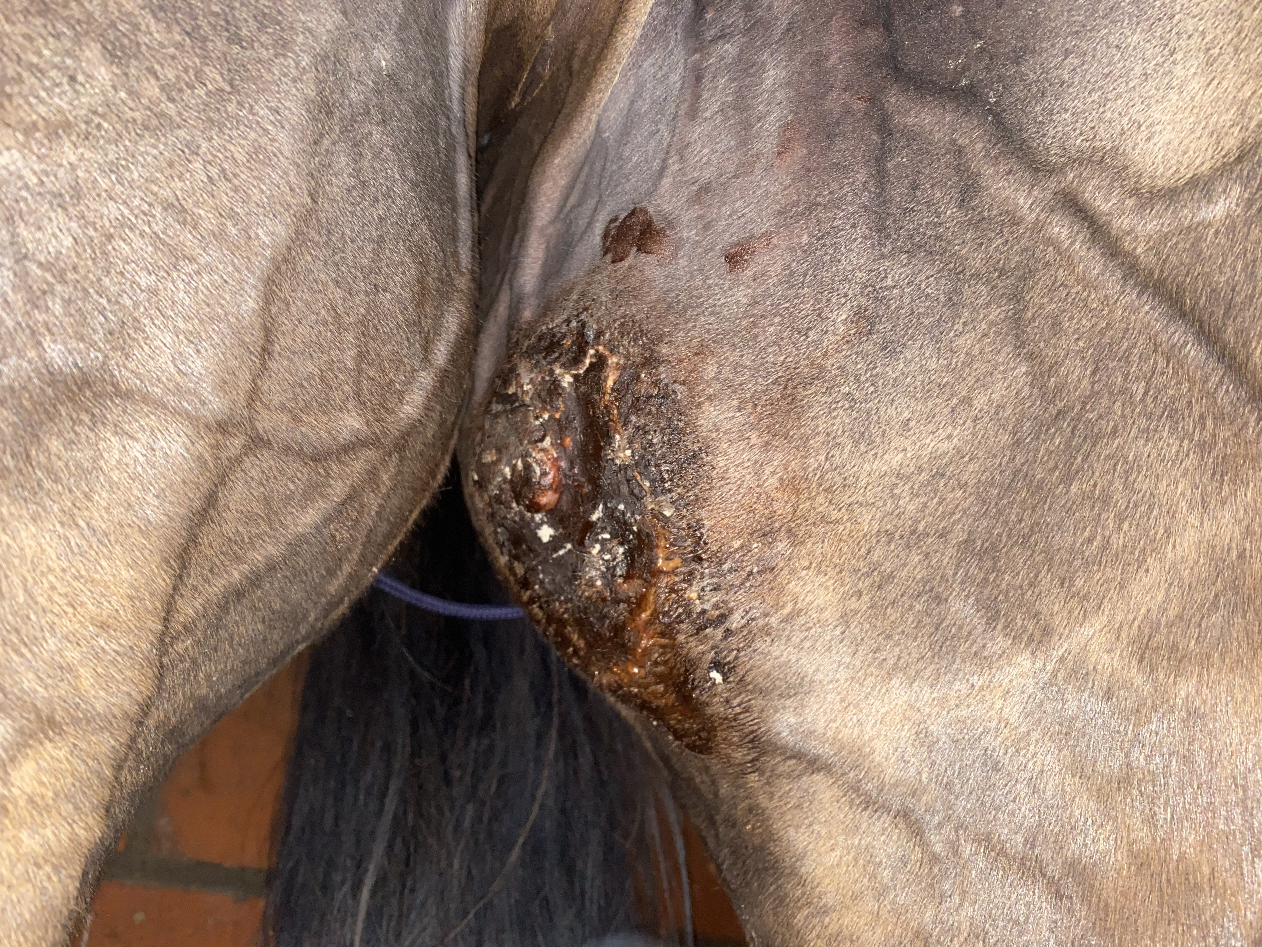 am Abend nach dem reiten sah es stark geschwollen aus und das Sekret lief erneut aus den Rändern im seitlichen und unteren Bereich.