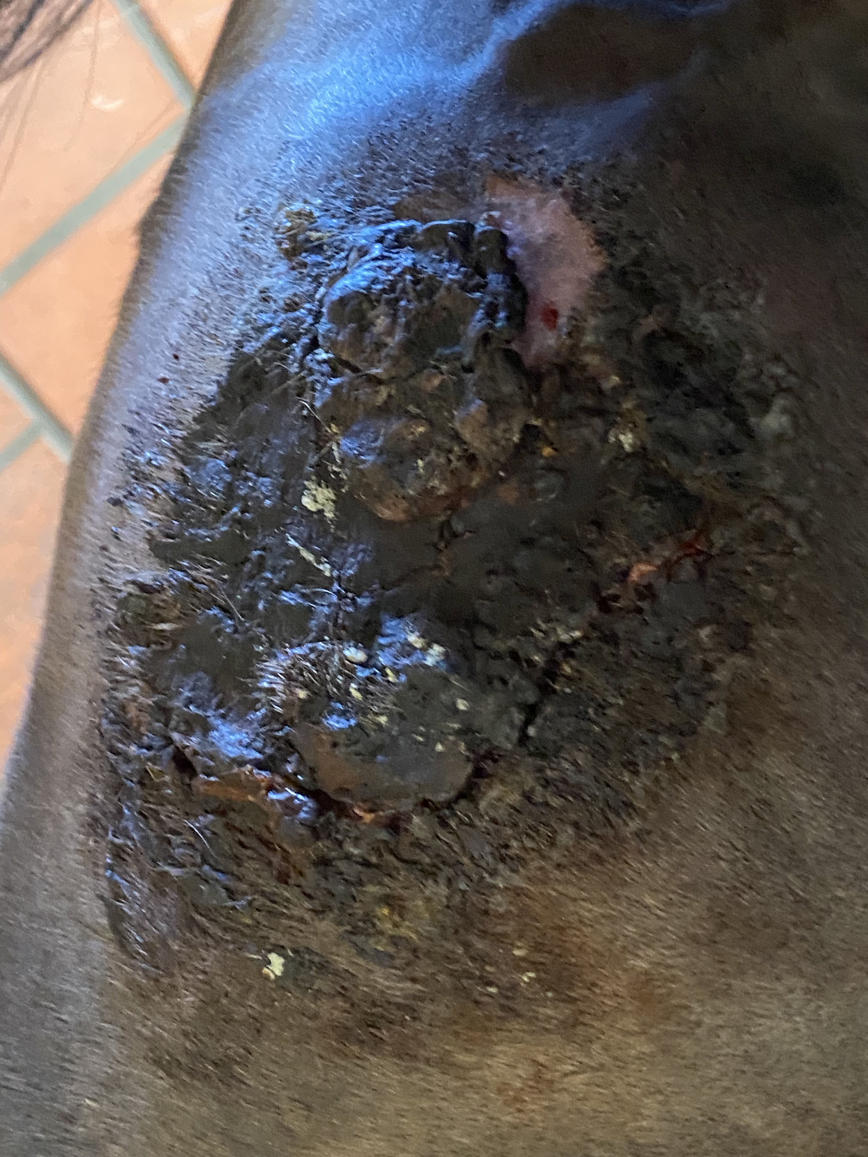 Mich beunruhigt vor allem die große Menge an Sekret am Rand, die direkt nach Bewegung ( Führanlage, Reiten, Paddock) auftritt. Ich bin unsicher, ob ich die Behandlung fortsetzen oder pausieren sollte. Gestern habe ich die Stelle gegen 13:00 Uhr eingecremt, aber am Abend war der Rand erneut voller Tumorsekret a.e. durch die Bewegung. Im oberen Teil des Sarkoids scheint die Therapie jedoch seit heute wieder gut zu wirken – die Kruste hält sich und löst sich gelegentlich in kleinen Stücken.