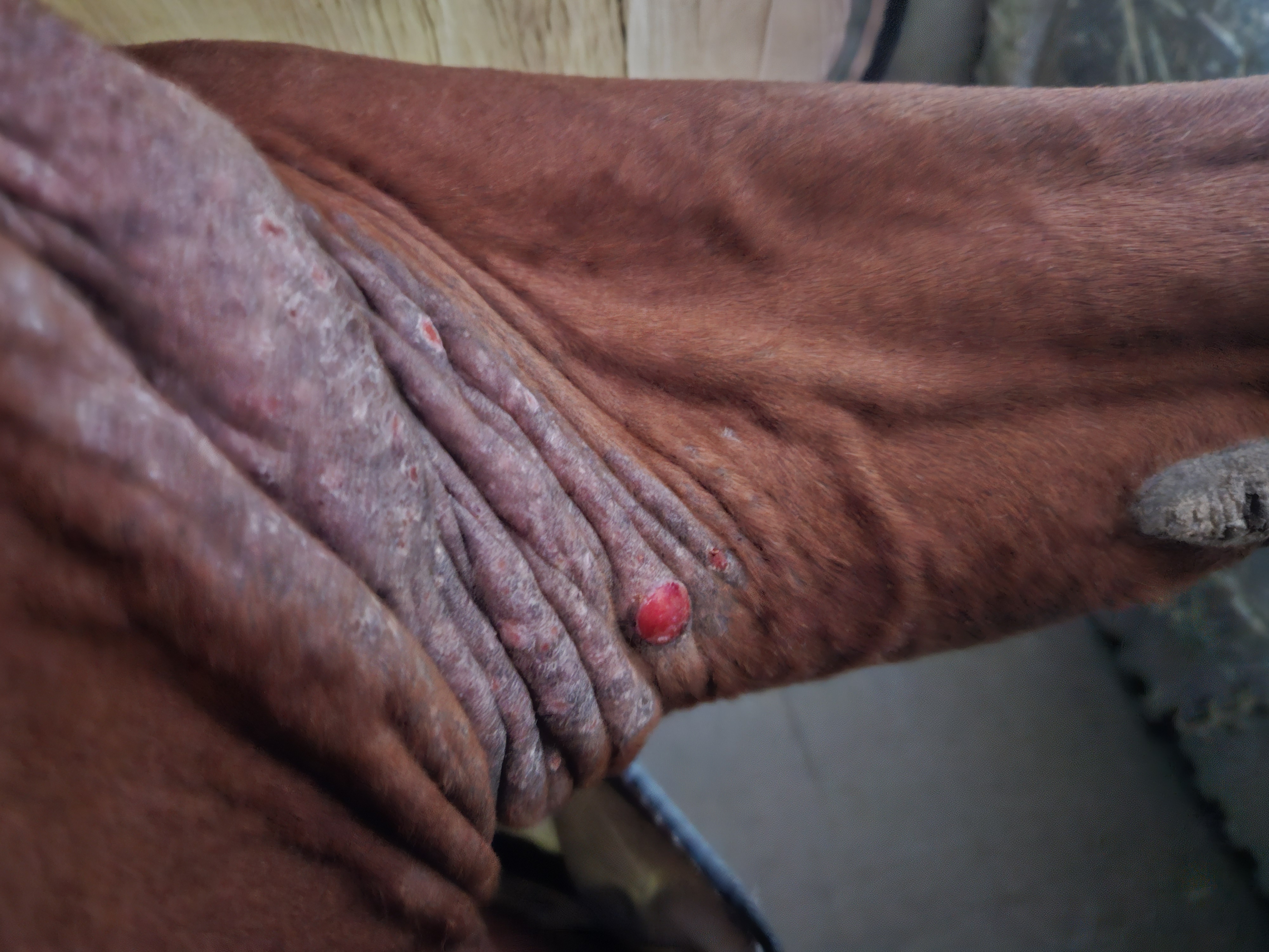 Mit der Tierärztin wurde dann besprochen, chemo Therapie anzuwenden, aber erst, wenn die insekten weg sind, das war dann Ende November, ein 2. Mal wurde das chemo Mittel Mitte Januar 2025 gespritzt. Es gab zwar diverse Schwellungen, aber keine Besserung oder aufgehen. Wie man auf den Bildern im Winter sieht, ist das sarkoid bzw. Die Haut um das sarkoid deutlich kleiner gewesen und es hat insgesamt deutlich besser ausgesehen, jetzt aktuell im Sommer sind beide wieder explodiert und zudem das am Bauch vor dem Euter deutlich gewachsen und aktuell auch aufgegangen. Ich hatte zunächst die zaubererde genutzt und aktuell Sarkosens.