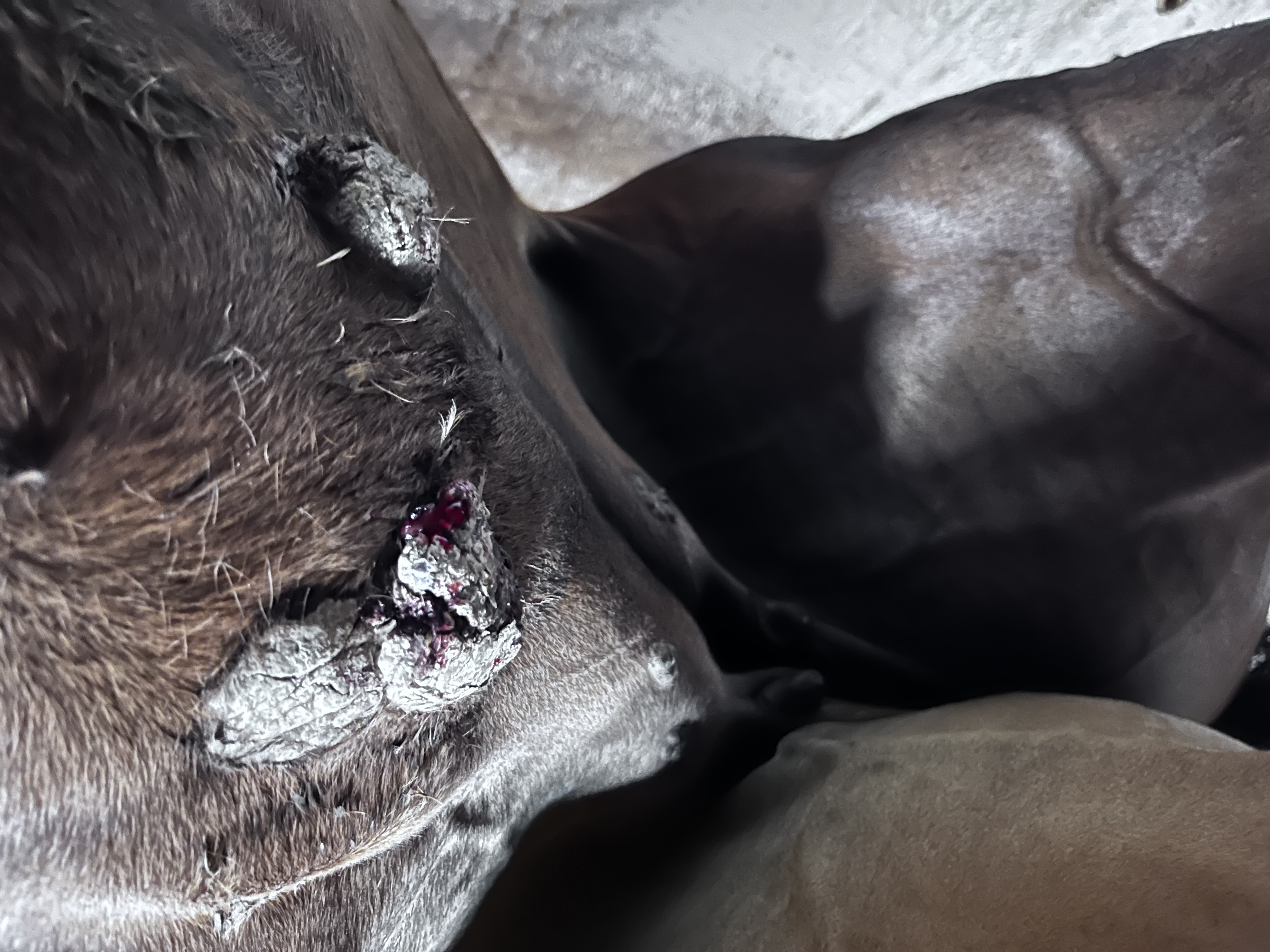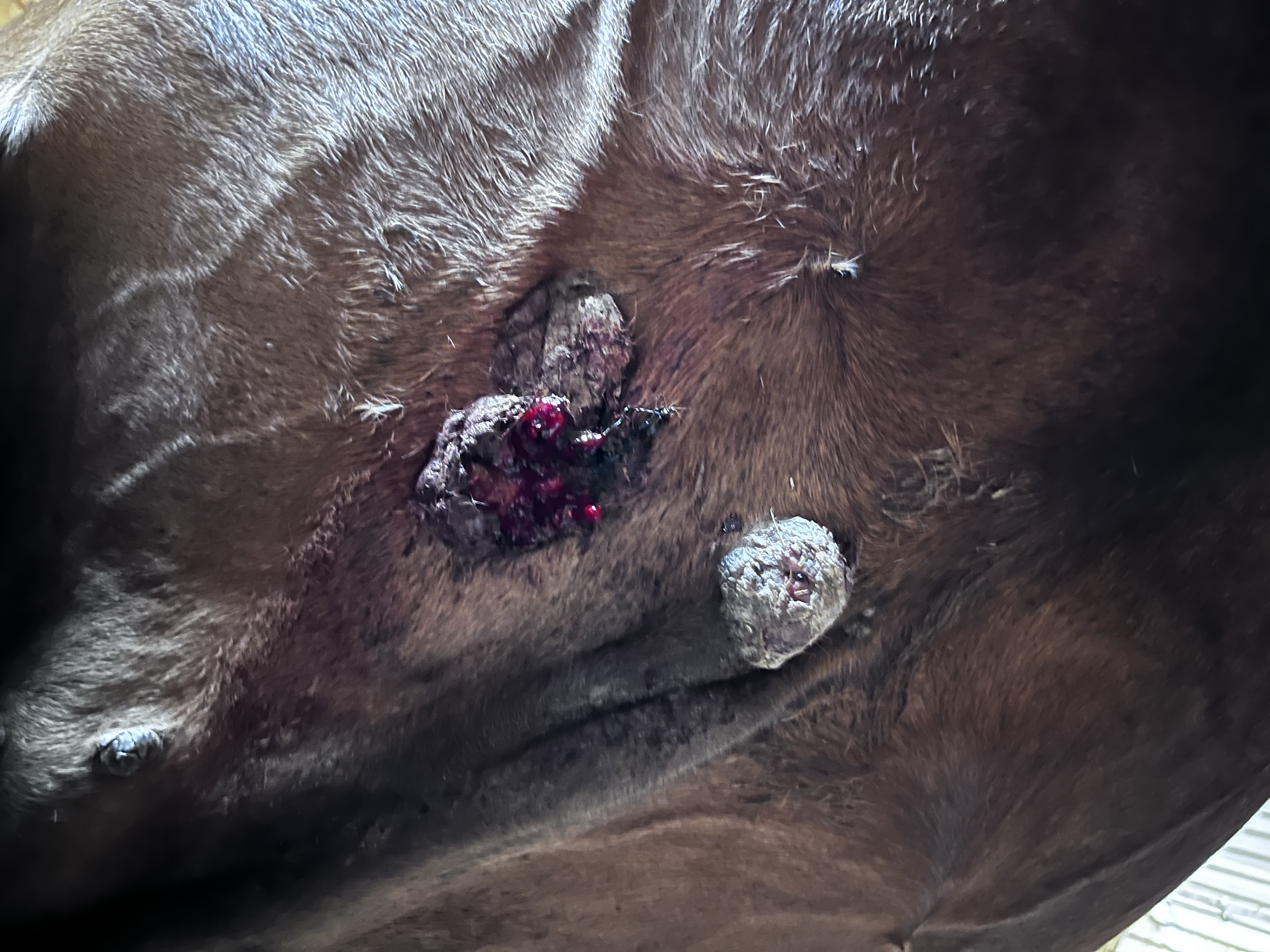 Der eine Sarkoid ist vor kurzem aufgeplatzt, was ihr offensichtlich Schmerzen bereitete und sie sich nicht mehr anfassen ließ. Es verursachte Schwellungen am Bauch, eine Wulst ist abgefallen. Seither ist es offen und das andere nebenan sieht aus, als würde es ebenso bald aufplatzen. Es wird immer dicker. Nun ist die Salbe angekommen und ich will mit der Behandlung beginnen.
