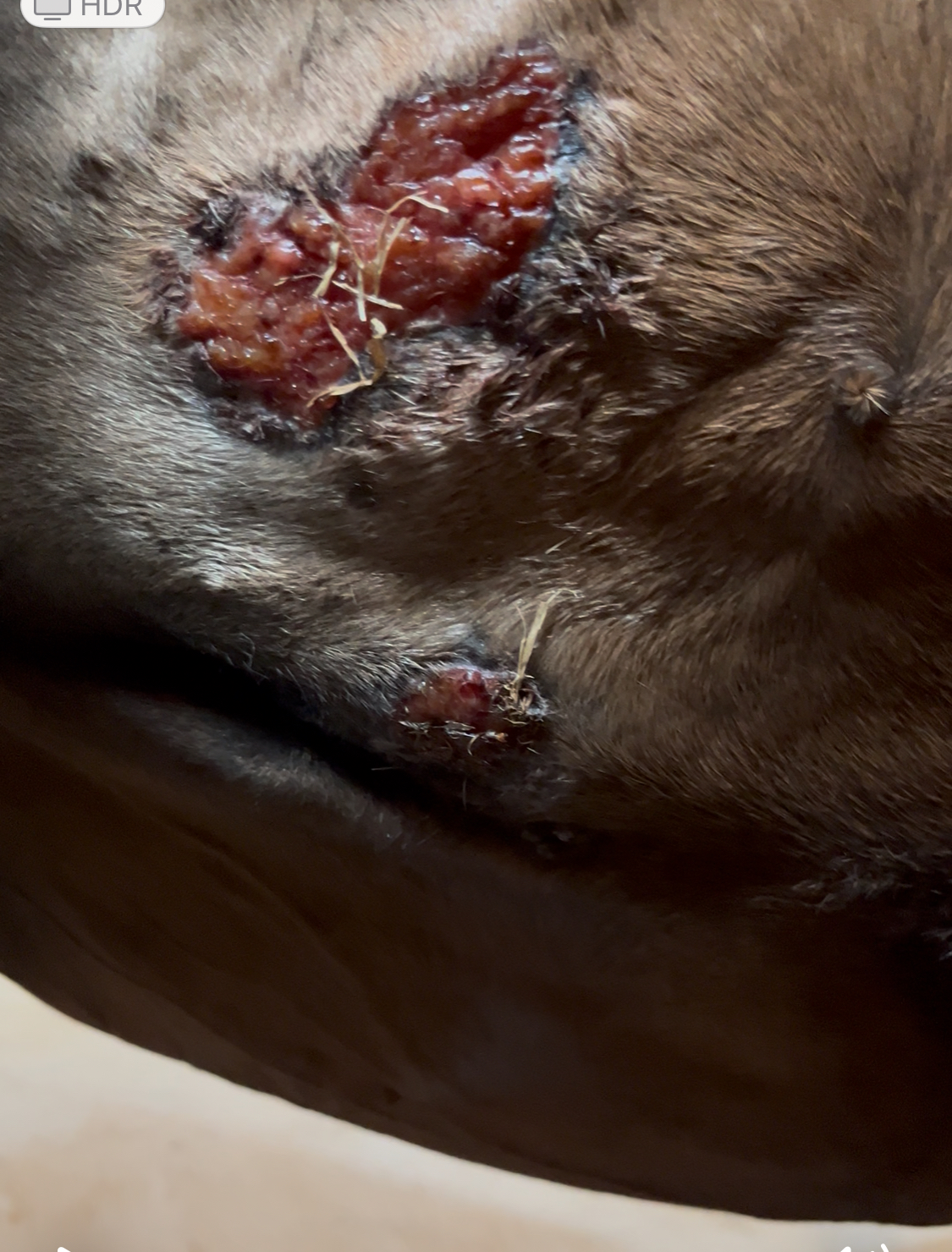 Aktuell sieht es wie rohes Fleisch aus. Keine Eiterreste/Nässe und sie reagiert auch nicht mehr so darauf. Sie ließ mich wie erwartet nicht mehr ran, habe jetzt eine Zwangspause eingelegt, ich durfte nicht mal mehr schauen, Ablenkung hilft bei ihr nicht, sie wusste immer was ich vor hatte.